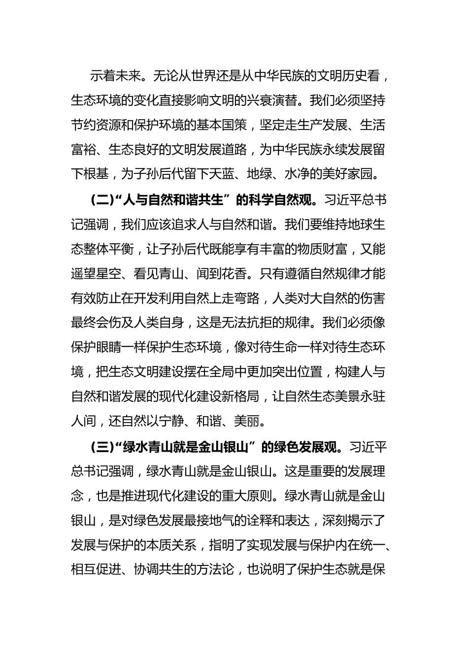 深入学习贯彻习近平生态文明思想在推动建设人与自然和谐共生的现代化实践中担当作为党的十八大以来,以习近平同志为核心的党中央把生态文明建设摆在治国理政的突出位置,作为统筹推进“五位一体”总体布局的重要内容,开展了一系列根本性、开创性、长远性工作,深刻回答了为什么建设生态文明、建设什么样的生态文明、怎样建设生态文明的重大理论和实践问题。2018年5月18日至19日,中央召开全国生态环境保护大会,正式确立了习近平生态文明思想,为新时代我国生态文明建设提供了根本遵循和行动指南。一、深刻领悟习近平生态文明思想丰内涵习近平生态文明思想高屋建瓴、博大精深,是生态价值观、认识论、实践论和方法论的总集成,深刻理解和准确把握其丰富内涵,对深入打好污染防治攻坚战加强生态环境保护,助推育质量发展具有深远的历史意义和十分重大的现实意义。习近平生态文明思想的核心要义集中体现在以下“八个方面”:(一)“生态兴则文明兴、生态衰则文明衰”的深邃历史观。习近平总书记强调,纵观人类文明发展史,生态兴则文明兴,生态衰则文明衰。工业化进程创造了前所未有的物质财富,也产生了难以弥补的生态创伤。杀鸡取卵、竭泽而渔的发展方式走到了尽头,顺应自然、保护生态的绿色发展昭示着未来。无论从世界还是从中华民族的文明历史看,生态环境的变化直接影响文明的兴衰演替。我们必须坚持节约资源和保护环境的基本国策,坚定走生产发展、生活富裕、生态良好的文明发展道路,为中华民族永续发展留下根基,为子孙后代留下天蓝、地绿、水净的美好家园。(二)“人与自然和谐共生”的科学自然观。习近平总书记强调,我们应该追求人与自然和谐。我们要维持地球生态整体平衡,让子孙后代既能享有丰富的物质财富,又能遥望星空、看见青山、闻到花香。只有遵循自然规律才能有效防止在开发利用自然上走弯路,人类对大自然的伤害最终会伤及人类自身,这是无法抗拒的规律。我们必须像保护眼睛一样保护生态环境,像对待生命一样对待生态环境,把生态文明建设摆在全局中更加突出位置,构建人与自然和谐发展的现代化建设新格局,让自然生态美景永驻人间,还自然以宁静、和谐、美丽。(三)“绿水青山就是金山银山”的绿色发展观。习近平总书记强调,绿水青山就是金山银山。这是重要的发展理念,也是推进现代化建设的重大原则。绿水青山就是金山银山,是对绿色发展最接地气的诠释和表达,深刻揭示了发展与保护的本质关系,指明了实现发展与保护内在统一、相互促进、协调共生的方法论,也说明了保护生态就是保护自然价值和增值自然资本的过程、保护经济社会发展潜力和后劲的过程。我们必须树立和贯彻新发展理念,处理好发展与保护的关系,推动形成绿色发展方式和生活方式,努力实现经济社会发展和生态环境保护协同共进。(四)“良好生态环境是最普惠的民生福祉”的基本民生观。习近平总书记强调,环境就是民生,青山就是美丽,蓝天也是幸福。随着我国社会生产力水平明显提高和人民生活显著改善,人民群众的需要呈现多样化多层次多方面的特点,期盼享有更优美的环境。我们必须坚持以人民为中心的发展思想,以改善生态环境质量为核心,坚持生态惠民、生态利民、生态为民,坚决打好污染防治攻坚战,还老百姓蓝天白云、繁星闪烁,清水绿岸、鱼翔浅底,鸟语花香、田园风光,提升群众的获得感、幸福感和安全感(五)“山水林田湖草沙是生命共同体”的整体系统观。习近平总书记强调,山水林田湖草沙是生命共同体。生态是统一的自然系统,是相互依存、紧密联系的有机链条,是各种自然要素相互依存实现循环的自然链条,人的命脉在田,田的命脉在水,水的命脉在山,山的命脉在土,土的命脉在林和草。我们必须按照生态系统的整体性、系统性及内在规律,统筹考虑自然生态各要素、山上山下、地上地下、陆地海洋以及流域上下游,进行整体保护、宏观管控、综合治理,全方位、全地域、全过程开展生态文明建设,增强生态系统循环能力,维护生态平衡。(六)“实行最严格生态环境保护制度”的严密法治观。习近平总书记强调,只有实行最严格的制度、最严明的法治,才能为生态文明建设提供可靠保障。在生态环境保护...