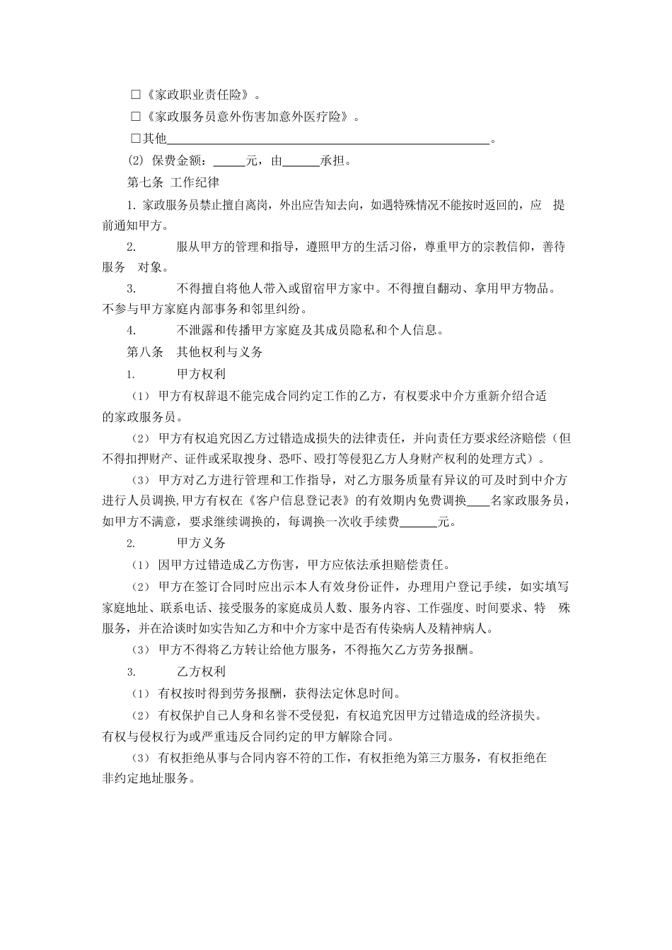 JSF-2016-0181江苏省家政服务合同(中介制)(示范文本)甲方(雇主):身份证号:联系电话:住宅地址:乙方(家政服务员):身份证号:联系电话:户籍地址:现住址:紧急联系方式:中介方(家政服务机构):服务电话:经营地址:法定代表人:代理人:根据《中华人民共和国合同法》、《中华人民共和国侵权责任法》和《中华人民共和国消费者权益保护法》及其他有关法律、法规的规定,三方遵循平等、自愿、诚实信用原则,就家庭服务相关事宜签订本合同。第一条术语释义甲方(雇主):是指具有完全民事行为能力的家政服务员的雇佣者。乙方(家政服务员):具有完全民事行为能力和家庭服务技能的劳动者。中介方(家政服务机构):依法成立的具有相关资质的,以居间人身份为雇主和家政服务员提供家政服务信息的家政服务组织。第二条服务1.岗位:□普通家务劳动□婴、幼儿照护□婴幼儿教育□产妇与新生儿护理□老人照护□病人陪护□计时服务□家庭餐制作□其他:2.地址:。3.服务要求:(1)护理依赖程度(无此项服务内容的不填):%。(2)特殊需求:。4.方式:□全日住家型□日间照料型□计时服务型□其它。(请在□内打√)5.期限(合同):年月日至年月日。6.工作时间:第三条服务员1.服务员籍贯:性别:年龄:学历:技能级别:培训:2.甲方有权要求乙方提供一年内国家认可的医疗机构出具的体检合格证明,如有异议可要求重新体检,若体检合格,体检费用由甲方承担。若体检不合格,则由乙方承担。如若甲方要求乙方进行非常规体检项目,乙方应给予配合,费用由甲方承担。第四条中介服务费□在本合同签订之日,甲方支付中介方一次性中介服务费元(该费用为一次性收取,不退)。□在本合同签订之日,乙方需要向中介方支付中介服务费元(该费用为一次性收取,不退)。第五条劳务报酬1.乙方的劳务报酬为元/月(以每个自然月为准),乙方上岗试工期为个工作日,试工期的劳务报酬为元/天,遇国家法定节假日的劳务报酬为元/天,或在征得乙方同意的前提下安排补休。试工期满合格后按合同约定支付劳务报酬,不足月的按平均日报酬结算。2.劳务报酬的支付方式为:甲方在接受服务满一个月时,足额支付乙方报酬。第六条工作保障1.若提供全日住家型家政服务的,甲方应保证乙方每月4天的休息时间和法定的每天基本的睡眠及休息时间,向乙方提供与家庭成员基本相同的伙食(病人、孕产妇、婴幼儿餐除外),国家法定假日确需乙方照常工作的,要给予加班补助,加班工资按照元/天发放,或在征得乙方(家政服务员)同意的前提下安排补休。2.为乙方(全日住家型)提供安全的居住场所,并保证不与成年异性同居一室(失能者除外),当乙方需接触病人的血液、呕吐物及排泄物时,应为乙方提供相应的卫生和劳保用品。3.在服务期间,若乙方突发疾病或遇其它伤害,甲方应采取必要的救治措施。若乙方外出未归或发生意外,甲方应在24小时内通知相关方或报警。4.甲乙双方协商是否投保商业保险。(1)商业保险种类:□《家政职业责任险》。□《家政服务员意外伤害加意外医疗险》。□其他。(2)保费金额:元,由承担。第七条工作纪律1.家政服务员禁止擅自离岗,外出应告知去向,如遇特殊情况不能按时返回的,应提前通知甲方。2.服从甲方的管理和指导,遵照甲方的生活习俗,尊重甲方的宗教信仰,善待服务对象。3.不得擅自将他人带入或留宿甲方家中。不得擅自翻动、拿用甲方物品。不参与甲方家庭内部事务和邻里纠纷。4.不泄露和传播甲方家庭及其成员隐私和个人信息。第八条其他权利与义务1.甲方权利(1)甲方有权辞退不能完成合同约定工作的乙方,有权要求中介方重新介绍合适的家政服务员。(2)甲方有权追究因乙方过错造成损失的法律责任,并向责任方要求经济赔偿(但不得扣押财产、证件或采取搜身、恐吓、殴打等侵犯乙方人身财产权利的处理方式)。(3)甲方对乙方进行管理和工作指导,对乙方服务质量有异议的可及时到中介方进行人员调换,甲方有权在《客户信息登记表》的有效期内免费调换名家政服务员,如甲方不满意,要求继续调换的,每调换一次收手续费元。2.甲方义务(1)因甲方过错造成乙方伤害,甲方应依法承担赔偿责任。(2)甲方在签...