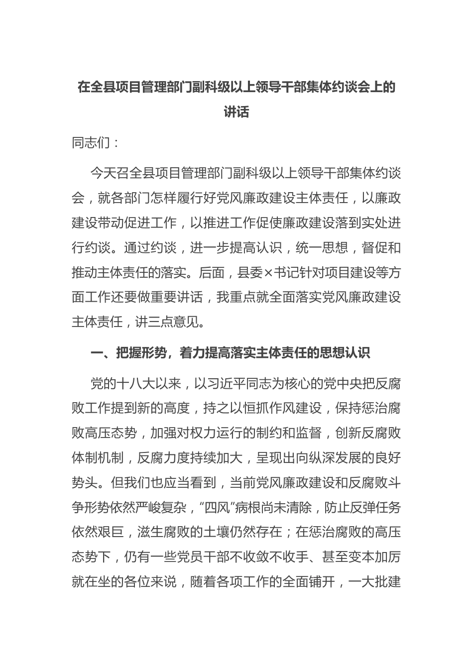 在全县项目管理部门副科级以上领导干部集体约谈会上的讲话同志们:今天召全县项目管理部门副科级以上领导干部集体约谈会,就各部门怎样履行好党风廉政建设主体责任,以廉政建设带动促进工作,以推进工作促使廉政建设落到实处进行约谈。通过约谈,进一步提高认识,统一思想,督促和推动主体责任的落实。后面,县委×书记针对项目建设等方面工作还要做重要讲话,我重点就全面落实党风廉政建设主体责任,讲三点意见。一、把握形势,着力提高落实主体责任的思想认识党的十八大以来,以习近平同志为核心的党中央把反腐败工作提到新的高度,持之以恒抓作风建设,保持惩治腐败高压态势,加强对权力运行的制约和监督,创新反腐败体制机制,反腐力度持续加大,呈现出向纵深发展的良好势头。但我们也应当看到,当前党风廉政建设和反腐败斗争形势依然严峻复杂,“四风”病根尚未清除,防止反弹任务依然艰巨,滋生腐败的土壤仍然存在;在惩治腐败的高压态势下,仍有一些党员干部不收敛不收手、甚至变本加厉就在坐的各位来说,随着各项工作的全面铺开,一大批建设任务需要我们去落实,一大批重点工程需要我们去实施在经济社会加速发展的过程中,各个利益主体都在想方设法追求自身利益最大化,容易产生不正当竞争,引发行贿受贿等腐败行为。从某种意义上讲,现在既是我县发展的加速期、社会的转型期、矛盾的凸现期,也是腐败现象的多发期、易发期和官员的高危期。因此,大家一定要深刻认识反腐败斗争的重要性和紧迫性,切实把思想和行动统一到中央和省、市、县关于反腐倡廉建设的各项部署要求上来,务必保持清醒的头脑,客观看待党风廉政建设面临的新形势和新问题,更加自觉地践行党的群众路线,旗帜鲜明地与“四风”问题和腐败现象作斗争。近年来,县委坚持把落实主体责任作为推动党风廉政建设的重要抓手,制定出台了《关于落实党风廉政建设主体责任的实施意见》,多次召开专题会议对落实党风廉政建设“两个责任”进行了安排部署,全县上下对主体责任的认识由“浅”入“深”,由“被动”向“主动”转变,落实主体责任的氛围逐步形成。但从省、市纪委明察暗访和省委巡视组巡视反馈暴露出的问题来看,从县纪委平时抽查检查发现的问题来看,大家在思想认识上还存在一些不容忽视的问题。一是认为党风廉政建设主要领导过问了、参加会议了,责任就算到位了,工作做得好不好是纪检监察部门的事,没有把党风廉政建设当作份内之事。大家不要忘记,自己除了担任行政职务外,还有党内职务和应当承担的党风廉政建设责任;二是认为对干部进行了教育和监督,加强了制度建设进行预防,如果干部还出问题,是干部自身的事,与领导特别是主要领导没有直接的责任;三是认为只要自己不贪不拿,本单位本部门出现重大腐败案件和违反损害群众切身利益的问题与自己没有直接的关系。为此,大家要认真学习领会中央、省市、县关于主体责任的精神和工作要求,准确把握好主体责任的主要内容和基本内涵,始终做到牢记于心,见之于行,行之有果。二、落实要求,主动担负起履行主体责任的政治责任各单位主要领导和领导班子成员手中都握有一定的权力,是权力的施行主体,也是反腐倡廉建设的责任主体。按照权责对等的原则,你手中握有多大的权力,必然要尽相应多大的责任。大家要在知责、明责的基础上主动担责、履责。一要履行好领导班子的集体责任。重点要从四个方面来理解和贯彻肩负的主体责任。一是领导责任。全面领导本单位党风廉政建设和反腐败工作,定期研究、分析、部署二是教育责任。组织本单位党员干部开展党风廉政教育,加强廉政文化建设。三是管理责任。做到一级抓一级,一级对一级负责。四是示范责任。领导干部特别是“一把手”要带头执行党风廉政建设责任制,做到勤政廉政,为本单位党员干部作出表率。二要履行好主要负责人的第一责任。主要负责人是党风廉政建设第一责任人,对党风廉政建设负有全面的责任、直接的责任、首要的责任。要对班子成员的问题及时提醒重大问题还要及时向上级报告,要牢固树立“不抓党风廉政建设就是失职”的理念,时刻把党风廉政建设放在心上、抓在手上、扛在肩上,对重要工作亲自部署、重大...