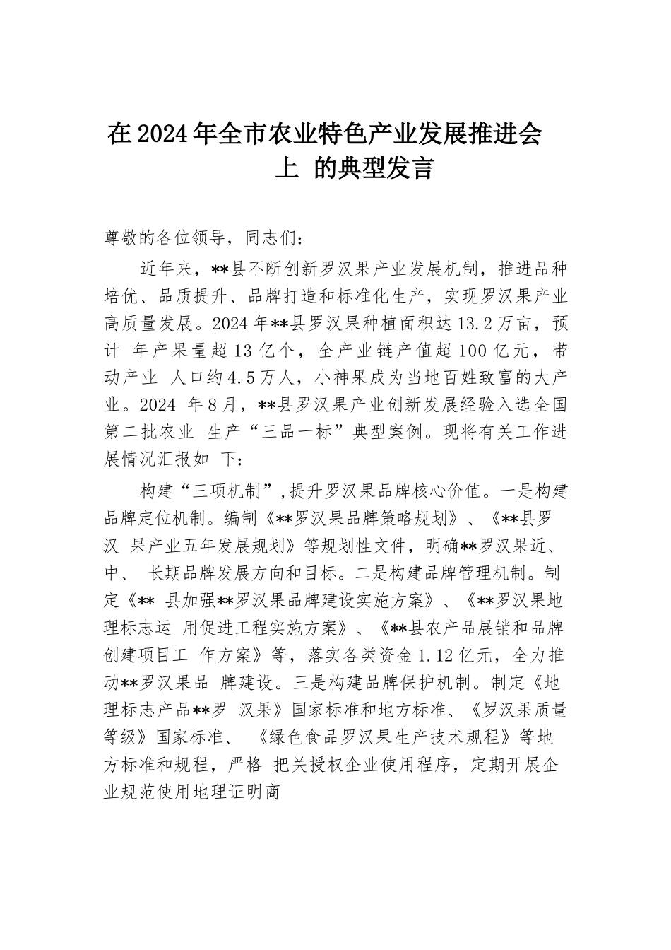 在2024年全市农业特色产业发展推进会上的典型发言尊敬的各位领导,同志们:近年来,**县不断创新罗汉果产业发展机制,推进品种培优、品质提升、品牌打造和标准化生产,实现罗汉果产业高质量发展。2024年**县罗汉果种植面积达13.2万亩,预计年产果量超13亿个,全产业链产值超100亿元,带动产业人口约4.5万人,小神果成为当地百姓致富的大产业。2024年8月,**县罗汉果产业创新发展经验入选全国第二批农业生产“三品一标”典型案例。现将有关工作进展情况汇报如下:构建“三项机制”,提升罗汉果品牌核心价值。一是构建品牌定位机制。编制《**罗汉果品牌策略规划》、《**县罗汉果产业五年发展规划》等规划性文件,明确**罗汉果近、中、长期品牌发展方向和目标。二是构建品牌管理机制。制定《**县加强**罗汉果品牌建设实施方案》、《**罗汉果地理标志运用促进工程实施方案》、《**县农产品展销和品牌创建项目工作方案》等,落实各类资金1.12亿元,全力推动**罗汉果品牌建设。三是构建品牌保护机制。制定《地理标志产品**罗汉果》国家标准和地方标准、《罗汉果质量等级》国家标准、《绿色食品罗汉果生产技术规程》等地方标准和规程,严格把关授权企业使用程序,定期开展企业规范使用地理证明商标检查,严厉打击假冒伪劣等非法行为,推动罗汉果“生产标准化、基地化”,全力维护**罗汉果品牌口碑。近年来,**县积极推进罗汉果品牌建设,成功创建罗汉果中国著名品牌商标1个、**名牌商标3个,打造“中族中药”等30多个知名企业品牌。攻关“三项技术”,助力罗汉果生产提质增效。一是攻关品种选育技术。与中国科学院、**农业科学院等10余所科研院校合作,开展品种杂交选育研究,选育的“龙江一号”罗汉果品种被评为**壮族自治区农作物品种;从**野生罗汉果种质资源中选育扩繁了长滩果、拉江果和青皮果等8个优良品种,进一步保障了罗汉果种子安全。二是攻关种苗脱毒技术。设立**县罗汉果研究所,长期开展种苗脱毒技术研究,建成罗汉果种苗脱毒中心和脱毒苗繁育基地,每年提供优质脱毒罗汉果种苗2000万株以上。三是攻关种植技术。全力开展罗汉果从山区高地向平原坡地种植技术攻关,推广大棚、喷淋等设施化种植,实现种植区域和产量突破,推动罗汉果亩均产量由6000个增加到10000个以上,种植面积由2015年的5万亩发展到2023年15.26万亩。首创的罗汉果“一种二收”栽培技术通过**壮族自治区科学技术成果鉴定,达到国内先进水平。近年来,**县创建自治区级五星级和四星级罗汉果现代农业核心示范区各1个,建成全国唯一集育苗、种植、科研和文化展示于一体的罗汉果科技示范园,创建罗汉果绿色食品标准化生产基地24个,面积达60000余亩,绿色认证率70%以上。突出“三个坚持”,推动罗汉果成为致富“金果”。一是坚持“政府、协会、企业”三方联动的生产经营模式。通过搭建生产、技术、加工、销售平台,实行“企业+合作社+基地+农户”的运作模式,组建7个“产、供、销”一体化的罗汉果产业新型联合体,对全县罗汉果进行保价回收,统一生产、统一加工、统一品牌、统一销售,建立紧密的利益联结机制,形成罗汉果完整产业链。二是坚持线上线下共发力的宣传策略。借助央视CCTV-4、CCTV-7等大型媒体平台,全力宣传推广**罗汉果,打破**罗汉果“养在深闺人未识”的局面。加强与淘宝、京东等各大电商平台合作力度,开设旗舰店或专营店,同时邀请知名主播或网红进行罗汉果产品的直播带货,提升产品曝光度。充分利用微博、微信公众号、抖音、小红书等社交媒体平台发布罗汉果的种植、加工、功效等相关内容,全力助推罗汉果出圈出彩。连续举办七届**罗汉果节、十三届“罗汉果”健康养生福寿节以及首届罗汉果产业高质量发展论坛、中国罗汉果产业发展大会等全区、全国性活动,着力提升罗汉果品牌影响力。积极开展“走出家门做宣传”活动,通过在北京人民大会堂召开**罗汉果品牌发布会、前往重庆开展**罗汉果推介及研学、参加马来西亚农业丝路行推广节等,推动**罗汉果从地方品牌向全国品牌、世界品牌升级。三是坚持农文旅融合的发展方向。投入约27.6亿元打造以罗汉果为核心,集产品一条街、文化展览馆和加工园区等于...