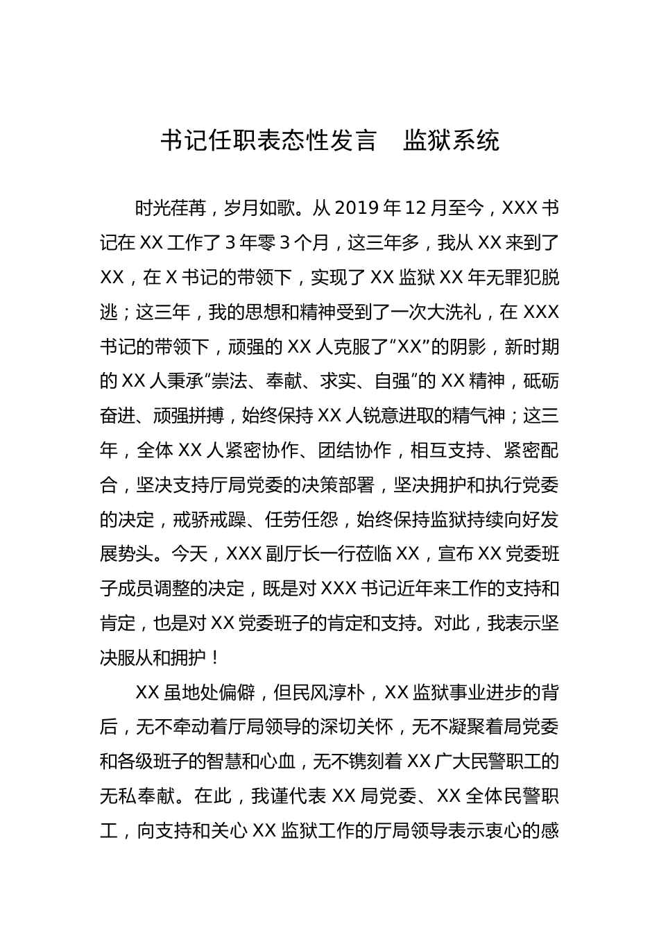 书记任职表态性发言监狱系统时光荏苒,岁月如歌。从2019年12月至今,XXX书记在XX工作了3年零3个月,这三年多,我从XX来到了XX,在X书记的带领下,实现了XX监狱XX年无罪犯脱逃;这三年,我的思想和精神受到了一次大洗礼,在XXX书记的带领下,顽强的XX人克服了“XX”的阴影,新时期的XX人秉承“崇法、奉献、求实、自强”的XX精神,砥砺奋进、顽强拼搏,始终保持XX人锐意进取的精气神;这三年,全体XX人紧密协作、团结协作,相互支持、紧密配合,坚决支持厅局党委的决策部署,坚决拥护和执行党委的决定,戒骄戒躁、任劳任怨,始终保持监狱持续向好发展势头。今天,XXX副厅长一行莅临XX,宣布XX党委班子成员调整的决定,既是对XXX书记近年来工作的支持和肯定,也是对XX党委班子的肯定和支持。对此,我表示坚决服从和拥护!XX虽地处偏僻,但民风淳朴,XX监狱事业进步的背后,无不牵动着厅局领导的深切关怀,无不凝聚着局党委和各级班子的智慧和心血,无不镌刻着XX广大民警职工的无私奉献。在此,我谨代表XX局党委、XX全体民警职工,向支持和关心XX监狱工作的厅局领导表示衷心的感谢!借此机会,向X厅长及各位领导简要汇报XX局下一步工作打算:一是增强履职能力,精心打造过硬队伍。抓好思想政治建设,强化理论武装,按照习近平新时代中国特色社会主义思想主题教育要求,采取集中培训、专题研讨、党性教育等多种方式,加强干部教育管理。推进新型警务运行模式改革,发挥集约化警力运行优势,加大对中青年干部的培养力度,抓好领导干部梯队化建设。严格落实“两个责任”,扎紧权力笼子,加大正风肃纪惩处力度,努力构建风清气正的执法环境。二是筑牢安全根基,保持场所持续稳定。完善监管安全责任体系,综合运用现场督察、重点时段督查、视频督查等多种形式,强化督查督纠。固化基层狱情分析制度,立足数据化分析,增强狱情测报针对性,加大狱情分析的有效性。深化安全管理,树立以“制度不落实为例外”的理念,强化基层基础制度管理。抓好监管区大门管理、短刑犯管理等试点项目,打造精细化管理品牌。巩固创建推标成果,持续加大“双违一危”品整治力度,加快无双违品监区创建。立足布调建设工程进度,提升物防技防水平,逐步撤销监管设施不达标的关押点。加强与社会医院共建,运行专管病房,争取罪犯医疗社会化和远程会诊取得新进展。三是彰显公平正义,扎实推进依法治监。提高执法队伍能力,量化各层级各岗位民警执法职责和权限,狠抓执法质量考评。规范刑罚执行,细化工种调配、分级处遇、计分考核、减刑假释、监外执行等重点执法环节的监督管控,做好计分考核与减刑排名新规相匹配。落实减刑案卷网上审查办理、备案和监督机制,深化减刑案卷审查责任追究制度,确保减刑案卷办理零差错。针对短刑犯管理、罪犯正常死亡处理等难点,不断总结完善经验,提高管理处置能力。树立证据意识,做好执法证据保全,对监狱执法、计分考核的重要事项、重要环节做到“全程留痕”。四是突出攻心治本,大力提升教育质量。贯彻改造为本理念,强化改造为本工作导向,积极构建监管改造为基础、教育改造为阵地、劳动改造为手段、心理矫治为突破的改造为本新格局。加强传统文化教育和亲情感恩教育,探索文化与改造罪犯的有机融合。充分发挥电教中心、教育名师评比、黄丝带帮教行动等平台优势,推进教育改造工作社会化。完善罪犯矛盾调处机制,持续规范罪犯行为养成,加大对违规违纪行为打击力度,提高顽危犯教育转化成效。常态化开展基层民警讲评教育竞赛活动,综合运用检查考核结果,加强民警基本功建设。五是咬定全年目标,保持经济稳健发展。认真落实“以秋补夏”,加强过程管控,力争水稻亩增产XX公斤。提升大米生产能力,拓展种子代繁规模,做大做强米业、种业。启用新建标准化育肥舍,抢抓市场机遇,实现生猪生产提质增效。全面推进标准化车间建设,狠抓车间管理水平和生产效率,力争人均创收水平较上年同期增长5%,综合成本同比下降5%。加强财务预算管理,加快应收账款清欠,严格落实资金回笼责任,严控资金风险。巩固安全生产标准化创建成果,加强重点部位和危险源管控治理,确保安全生产无事故。六...