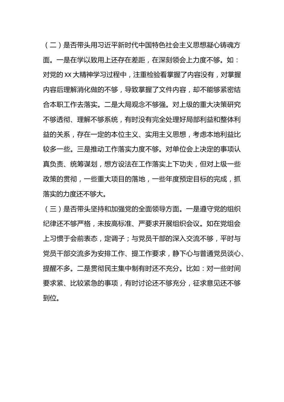 机关领导干部2022年“六个带头”民主生活会对照检查材料按照县纪委、县委组织部的有关部署要求,本人紧扣2022年度民主生活会主题,会前认真开展理论学习,深入学习党章党规党纪、《习近平谈治国理政》第四卷等采访实录和党的XX大会议精神,学习习近平总书记对XX工作的重要指示批示精神,进行了专题集中学习研讨,认真开展谈心谈话、广泛征求意见建议,结合自己思想、工作和生活实际,对照党员标准认真查摆问题、深刻剖析问题根源,进一步明确了努力方向和改进措施。现将对照检查情况汇报如下:一、存在的主要问题(一)是否带头深刻领悟“两个确立”的决定性意义,增强“四个意识”、坚定“四个自信”、做到“两个维护”方面。一是政治理论学习不够深入。集中学习安排比较密、抓得也比较紧,但对个人自学抓得还不够,在学习的过程中,更多的是学习上级要求和安排的内容,主动、深入、系统学习的积极性和主动性不高。二是学习的广度不够。把理论学习简单的理解为读读报纸、听听报告、做做笔记、写写心得体会,对其缺乏深层次思考,未能真正系统、透彻的学习领会,学习笔记摘句抄段的任务式学习痕迹明显,存在着一定的实用主义,学习内容缺乏系统性、全面性。三是理论联系实际不够。在政治理论学习中存在走形式、走过场现象,看得多思考少、浏览多记住少,不能从更深层次去研究、去理解、去运用,去指导工作,存在联系工作实际不足,学用脱节的情况。(二)是否带头用习近平新时代中国特色社会主义思想凝心铸魂方面。一是在学以致用上还存在差距,在深刻领会上力度不够。如:对党的XX大精神学习过程中,注重检验看掌握了内容没有,对掌握内容后理解消化做的不够,导致掌握了文件内容,却不能够紧密结合本职工作去落实。二是大局观念不够强。对上级的重大决策研究不够透彻、理解不够系统,有时没有完全处理好局部利益和整体利益的关系,存在一定的本位主义、实用主义思想,考虑本地利益比较多一些。三是推动工作落实力度不够。对单位会上决定的事项认真负责、统筹谋划,想方设法在工作落实上下功夫,但对上级一些政策的贯彻,一些重大项目的落地,一些年度预定目标的完成,抓落实的力度还不够大。(三)是否带头坚持和加强党的全面领导方面。一是遵守党的组织纪律还不够严格,未按高标准、严要求开展组织会议。如在党组会上习惯于会前表态,定调子;与党员干部的深入交流不够,平时与党员干部交流多为安排工作、提工作要求,静下心与普通党员谈心、提醒不多。二是贯彻民主集中制有时还不充分。比如:对一些时间要求紧、比较紧急的事项,有时讨论还不够充分,征求意见还不够到位。(四)是否带头坚持以人民为中心的发展思想,推动改革发展稳定方面。一是宗旨观念有所淡化,在实际工作中,总是把工作业务放在先,没有把深入基层、及时与群众沟通交流、了解诉求作为重点工作。有时虽能走访入户但是走访也是流于形式,走走样子,没有带着问题、带着政策、带着解决问题心态去走访,达不到预期的效果。二是调查研究不够实在。把下基层执行调研作为一种形式,注重场面热闹,不注重调研实效,存在走马观花、蜻蜓点水和雾里看花等问题。(五)是否带头发扬斗争精神,防范化解风险挑战方面。一是节约意识不够。艰苦奋斗精神保持不够,缺乏过“紧日子”的思想性,对水、电、办公用纸等公共资源缺乏节俭意识,标准执行还不够严格。二是对身边工作人员教育、引导和监督做得还不够到位。虽然平时对自己要求很严格,但在对身边人咬咬耳朵、扯扯袖子等方面做得还不够。三是执行纪律不严。对党的政治纪律内涵有时认识不清,理解不深、不透,甚至有偏差,错误地认为遵守政治纪律是高级别领导干部的事,自己作为中层干部,不可能有问题,甚至简单认为只要在思想上、行动上与中央保持一致即可,其它的无所谓。(六)是否带头落实全面从严治党政治责任方面。一是性子急躁,修养不够。批评下属不顾情面,安排的工作没有落实就爱啰嗦,甚至发脾气。主动到上级汇报思想、交流工作较少。只顾埋头工作,不顾抬头望路,怕给领导添麻烦,怕耽误领导办大事,担心自己不善言辞反而“坏事”,有简单做事的心理,忽视了...