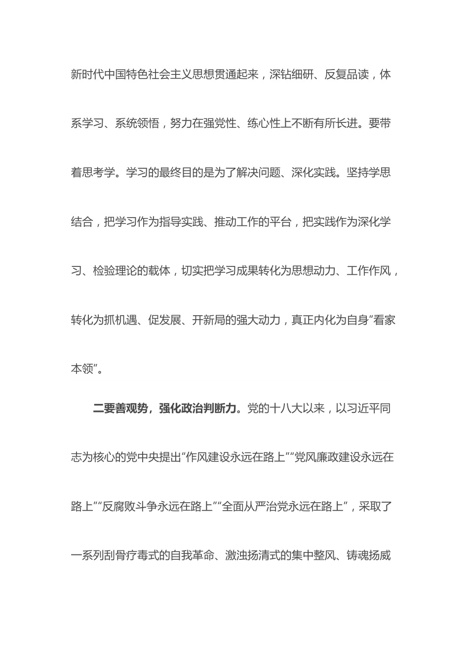 领导干部学习习近平总书记在省部级主要领导干部专题研讨班上的重要讲话精神的研讨发言7月27日,习近平总书记出席省部级主要领导干部“学习习近平总书记重要讲话精神,迎接党的二十大”专题研讨班并发表重要讲话,讲话从党和国家事业发展的战略全局出发,科学分析了当前国际国内形势,深刻阐述了过去5年工作和新时代10年的伟大变革,深刻阐释了新时代坚持和发展中国特色社会主义的重大理论和实践问题,深刻阐明了未来一个时期党和国家事业发展的大政方针和行动纲领。总揽全局、视野宏阔,高屋建瓴、博大精深,深刻阐明了关系党和国家事业发展的一系列重大理论和实践问题,为开好党的二十大奠定了重要的政治基础、思想基础、理论基础。越是深入研读,越能深刻感受蕴含其中的真理力量、信仰味道和思想光芒,越能在其中找到攻坚克难、破解难题的实招硬招、良方妙计。下面结合个人学习情况,谈几点心得体会。一要重学习,强化政治领悟力。政治上的坚定源于理论上的清醒,理论是实践的指南。习近平总书记的重要讲话为我们推进自我革命、推进全面从严治党提供了根本遵循和行动指南,是我们推动经济社会高质量发展的定盘星和导航仪。作为党员领导干部,我们必须发挥好示范引领作用,在个人自学上下真功夫、实功夫,不能浅尝辄止、敷衍了事、草草应付。要融会贯通学。要把深入学习领会讲话精神与学习《习近平谈治国理政》(第四卷)结合起来,和学深悟透习近平新时代中国特色社会主义思想贯通起来,深钻细研、反复品读,体系学习、系统领悟,努力在强党性、练心性上不断有所长进。要带着思考学。学习的最终目的是为了解决问题、深化实践。坚持学思结合,把学习作为指导实践、推动工作的平台,把实践作为深化学习、检验理论的载体,切实把学习成果转化为思想动力、工作作风,转化为抓机遇、促发展、开新局的强大动力,真正内化为自身“看家本领”。二要善观势,强化政治判断力。党的十八大以来,以习近平同志为核心的党中央提出“作风建设永远在路上”“党风廉政建设永远在路上”“反腐败斗争永远在路上”“全面从严治党永远在路上”,采取了一系列刮骨疗毒式的自我革命、激浊扬清式的集中整风、铸魂扬威式的主题教育,取得了明显成效。在这次专题研讨班上习近平总书记又强调“党的自我革命永远在路上”,这些重要论述一以贯之、一脉相承,体现了我们党对管党治党规律认识的不断深化,深刻回答了我们党推进自我革命的方向性、根本性、战略性问题。习近平总书记强调:“我们党之所以有自我革命的勇气,是因为我们党除了国家、民族、人民的利益,没有任何自己的特殊利益。”我们要坚持以立足四个全面战略布局审视纪检监察工作,坚持围绕大局服务中心谋篇布局,全面贯彻新时代党的建设总要求,坚定不移推进全面从严治党向纵深发展,着力发挥监督保障执行、促进完善发展作用,推动经济社会高质量发展,以奋发有为的精神状态走好新的“赶考”之路。三要增本领,强化政治执行力。习近平总书记强调:“管党治党一刻也不能放松,必须常抓不懈、紧抓不放,决不能有松劲歇脚、疲劳厌战的情绪,必须持之以恒推进全面从严治党,深入推进新时代党的建设新的伟大工程,以党的自我革命引领社会革命。”纪检监察机关是党进行伟大自我革命、推动伟大社会革命的重要力量,要保持永远在路上的冷静清醒和坚韧执着,增强斗争意识和本领,强化全员培训、实战练兵,提高以党性立身做事的政治觉悟,建设高素质专业化、敢于善于斗争的干部队伍。运用“全周期管理”方式做实政治谈话等日常监督,加强对重点人重点事的全程监督、精准监督,提高一体推进“三不腐”能力和水平,推动党中央重大决策部署落地见效。要坚守人民立场,持续整治群众身边腐败和作风问题,推动分类施治群众反映强烈的“急难愁盼”问题,不断增强人民群众获得感幸福感安全感。要坚定信心决心,把政治过硬、本领高强要求细化具体化,深化对管党治党、反腐败斗争规律的认识,敢于善于斗争,全面打赢反腐败斗争攻坚战、持久战,以全面从严治党新成效迎接党的二十大胜利召开。