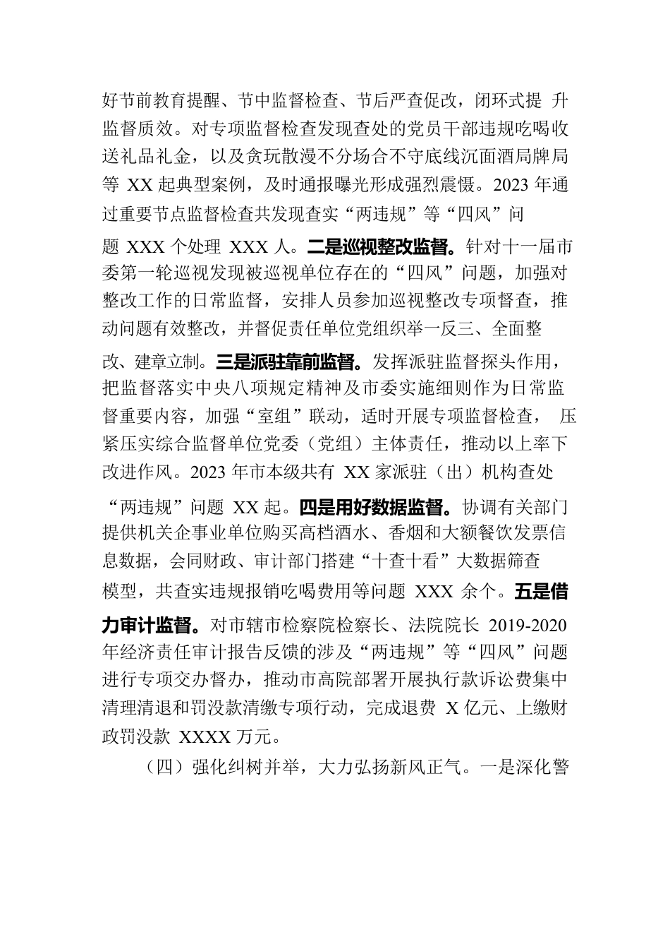 为深人学习贯彻习近平总书记关于加强作风建设重要讲话指示批示精神,XX市纪委监委认真分析研判党的十八大以来全市纠治“四风”工作情况,重点分析研判享乐主义奢靡之风的老问题新表现新动向,进一步找准工作指向,创新方法举措,重点聚焦风腐同根同源、紧密关联的违规吃喝、违规收送礼品礼金(以下简称“两违规”)问题开展专项整治行动,并对两年来全市“两违规”专项整治情况开展深入分析调研,总结经验、查找不足,摸清“两违规”问题的表现和特点,指导推动整治工作走深走实。一、主要做法2022年以来,XX市纪委监委聚焦风腐交织的“两违规”突出问题持续开展专项整治,全市各级纪检监察机关精准施策、靶向施治,取得了重要阶段性成果。(一)高位部署推动,有力有效组织实施。一是深入组织推动。先后印发实施“四个紧盯专项整治“两违规”、深化“两违规”突出问题专项整治工作通知,明确重点任务、方法举措和工作要求,加强统筹协调和调度督导,有力推动整治工作持续深人。二是列人巡视重点。将“两违规”问题作为巡视工作重点内容,聚焦巡前沟通协调、巡中发现问题、巡后反馈整改等各环节,推动被巡视单位认真查办和整改“两违规问题。三是纳人“一改两为”。聚焦2023年度“一改两为”大会上批评的“六不”(不作为不担当、不进取、不务实、不守信、不知止)作风突出问题,制定整治工作方案,并紧盯不知止项风违纪的“两违规”问题表现,印发深化专项整治通知,与监督推动“一改两为五做到”一体抓落实,受到各级党组织高度重视,确保了“两违规”专项整治顺利推进、落地见效。(二)聚焦重点领域,靶向施治突出问题。一是聚焦损害营商环境问题。严肃查处与企业家交往亲而不清、亲而无度,把老板当作“长期饭票”,个人消费企业“买单”,个人喜好企业“配送”“收心不变”,对礼品礼金来者不拒,缺乏敬畏不守底线,在违规吃喝、收送礼品礼金中搞权钱交易、利益勾兑等突出问题。2023年全市共查处违规接受管理服务对象宴请问题XXX起,处理XXX人。二是聚焦科研经费违规使用问题。针对科研资金管理使用中可能存在的廉洁风险,把市直单位下属科研机构作为2023年清明、五一期间作风监督检查重点,成立X个检查组对XX家市直科研机构开展专项检查,督促整改违规报销吃喝费用等问题。三是聚集年轻干部作风问题。认真贯彻落实习近平总书记关于加强年轻干部教育管理监督的重要讲话和指示批示精神,从严查处年轻干部违规吃喝、违规收送礼品礼金等问题防止由风及腐,教育引导系好“第一粒扣子”。(三)坚持贯通协调,不断提升监督质效。一是强化日常监督。加强重要节点监督,强化室组联动、室地协同,抓好节前教育提醒、节中监督检查、节后严查促改,闭环式提升监督质效。对专项监督检查发现查处的党员干部违规吃喝收送礼品礼金,以及贪玩散漫不分场合不守底线沉面酒局牌局等XX起典型案例,及时通报曝光形成强烈震慑。2023年通过重要节点监督检查共发现查实“两违规”等“四风”问题XXX个处理XXX人。二是巡视整改监督。针对十一届市委第一轮巡视发现被巡视单位存在的“四风”问题,加强对整改工作的日常监督,安排人员参加巡视整改专项督查,推动问题有效整改,并督促责任单位党组织举一反三、全面整改、建章立制。三是派驻靠前监督。发挥派驻监督探头作用,把监督落实中央八项规定精神及市委实施细则作为日常监督重要内容,加强“室组”联动,适时开展专项监督检查,压紧压实综合监督单位党委(党组)主体责任,推动以上率下改进作风。2023年市本级共有XX家派驻(出)机构查处“两违规”问题XX起。四是用好数据监督。协调有关部门提供机关企事业单位购买高档酒水、香烟和大额餐饮发票信息数据,会同财政、审计部门搭建“十查十看”大数据筛查模型,共查实违规报销吃喝费用等问题XXX余个。五是借力审计监督。对市辖市检察院检察长、法院院长2019-2020年经济责任审计报告反馈的涉及“两违规”等“四风”问题进行专项交办督办,推动市高院部署开展执行款诉讼费集中清理清退和罚没款清缴专项行动,完成退费X亿元、上缴财政罚没款XXXX万元。(四)强化纠树并举,大力弘扬新风正气。一是深化警示...