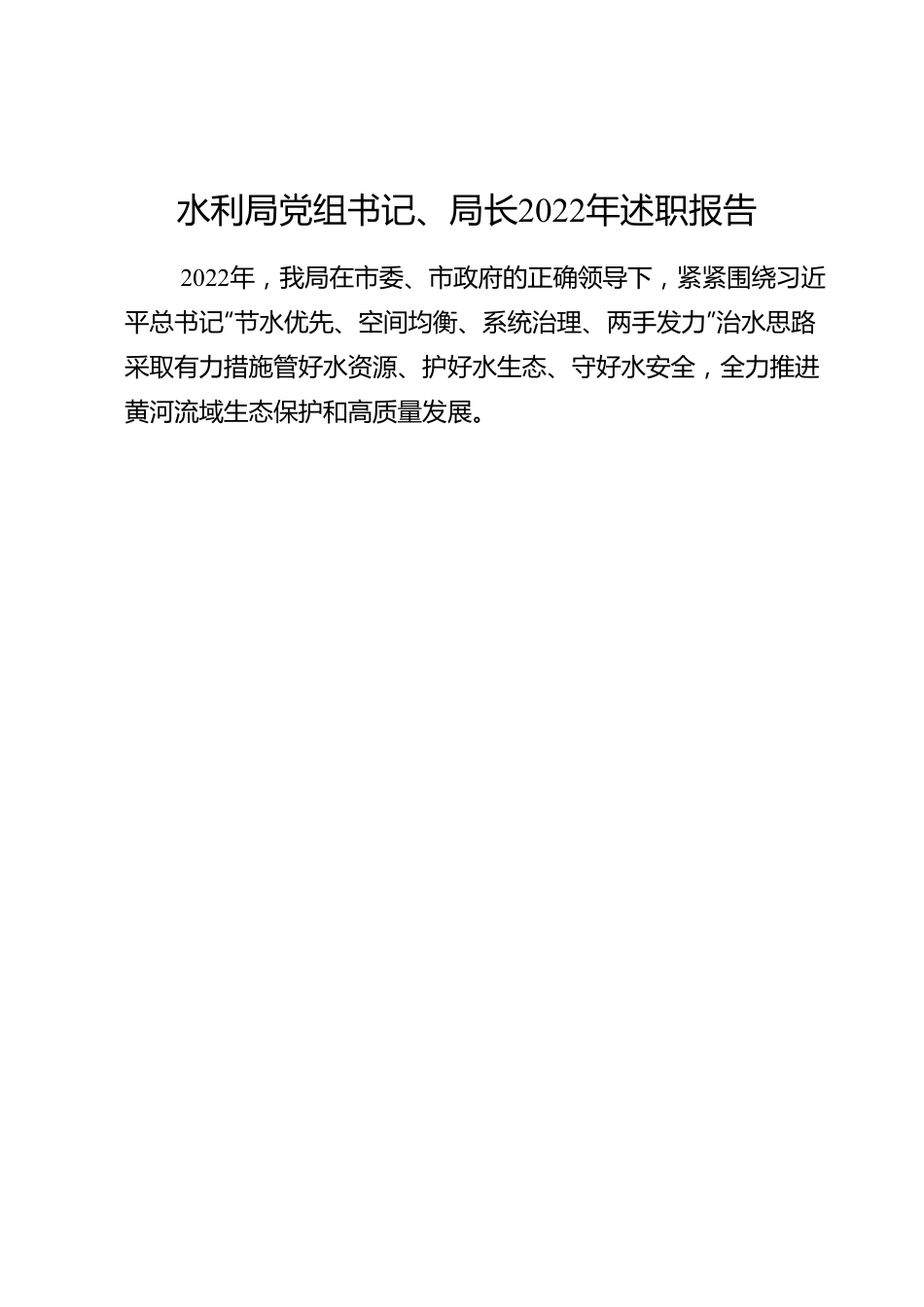 水利局党组书记、局长2022年述职报告2022年,我局在市委、市政府的正确领导下,紧紧围绕习近平总书记“节水优先、空间均衡、系统治理、两手发力”治水思路采取有力措施管好水资源、护好水生态、守好水安全,全力推进黄河流域生态保护和高质量发展。一是扎实保障水供给。保障群众饮用水,关乎老百姓的幸福生活。为了让群众吃上放心水、安全水。对全市农牧民饮水安全情况进行全面摸底,围绕提升水质、水量和供水保证率,累计建成饮水安全工程****处,实现农村牧区饮水安全全覆盖,自来水普及率达到**.*%。特别是今年开春以来,全市连续一百多天无有效降雨,部分地区出现重旱、特旱,投资*.*亿元,启动抗旱水源井*万多眼,浇灌面积***多万亩,解决了*万多人生产生活用水困难问题,将旱灾损失降到最低;投资*亿元,建成了中心城区应急供水工程和棋盘井镇统一供水工程,有效缓解了东胜区和棋盘井镇居民用水紧张情况。为了让农业灌溉保水源、保收成。兴修农田水利,投资***z万元,维修养护南岸灌区灌溉工程**万亩,实施农业水价综合改革**万亩,并开展了农田灌溉水利用系数测算分析,既保障了农田灌溉,又促进了农业用水由粗放向集约节约转变。为了让结对帮扶见真情、见实效。助力乡村振兴,十八大以来,以“水惠民生”党建品牌为引领,派出工作队深入村社,解民忧、纾民困,为包联村争取资金近****万元,先后实施了渠道衬砌、人畜饮水、桥涵修建、盐碱地改造、稻渔空间项目等,包联村基础设施条件和村民生产生活条件得到极大改善,也让“惠民之水”流进了广大群众的心田。二是全力守护水安澜。黄河流经我市***公里,长度为全国第二、全区第一,保护好“母亲河”,造福全市人民,责任重大。全力守护江河安澜。坚持**小时值守、不间断巡查,对全市***公里堤防、**处险工段、**座水库、****座淤地坝和遍布的山洪沟,逐个排查隐患、逐一整改问题,投入抢险资金****多万元、人工和机械****多次、石料**万方,抢护险工段**处;投资*.*亿元,迁建黄河滩区居民***户***人;***沟综合治理和巴图湾水库除险加固等一批水旱灾害防御工程相继完工;覆盖全市的山洪灾害预警系统全部建成。特别是*月份进入雨季后,全市极端天气多发,**等山洪沟均有洪水过境,所有水库和淤地坝蓄水滞洪有序运行,经过积极防御调度实现了安全度汛,经受住了旱涝急转的考验。全力守护绿水青山。***兑综合治理、国家水土保持重点工程、黄河粗泥沙集中来源区拦沙工程和拦沙换水试点工程等重点水土保持项目有序推进,全年完成小流域治理***平方公里、治理中小河流*条、新建及除险加固淤地坝***座,全市水土保持率达到**%,**的底色更靓、绿意更浓。全力守护幸福河湖。全市****名河湖长、**个责任部门、“河湖长+检察长+警长”三长协作形成了强大保护合力,全年巡河湖*万人次,发现解决问题***个清理河道内垃圾**万吨、违建*万平方米,组织直升飞机空中巡河湖**架次,一幅“河畅、水清、岸绿、景美、人和”的美丽幸福河湖新画卷正在徐徐展开。三是科学推进水配置。我市人均水资源量仅****立方米,远低于全区****立方米和全国****立方米平均水平,水资源尤为稀缺珍贵。通过明底线、严监管,利用好有限的水资源。制定负面清单,严控高污染、高耗能、高排放、高耗水项目的水指标审批要求规模以上取用水企业安装在线监测设备,对于偷取盗用、计量不准、非法倒卖等违规取用水行为,一家一家查、一个一个过累计处罚违规取用水项目***个,拆除违法取水设施或封闭取水井***处、关停***家,征收水土保持补偿费、水资源税**亿元。通过算细账、抓节约,利用好有限的水资源。坚持以水定城、以水定地、以水定人、以水定产,推进农业、工业和城市深度节水控水,预计全市年度用水总量**.*亿立方米以内,万元GDP用水量**立方米以下,万元工业增加值用水量**立方米以下,水功能区达标率***%,农田灌溉水有效利用系数*.*以上,牢牢守住了“三条红线”。通过拓渠道、挖潜力,利用好有限的水资源。勇于腾笼换鸟,通过拦沙换水争取****万立方米水指标;敢于变废为宝,推动煤矿疏干水和城市中水无害化、资源化管理,利用率分别达到**%和**%;善于系统...