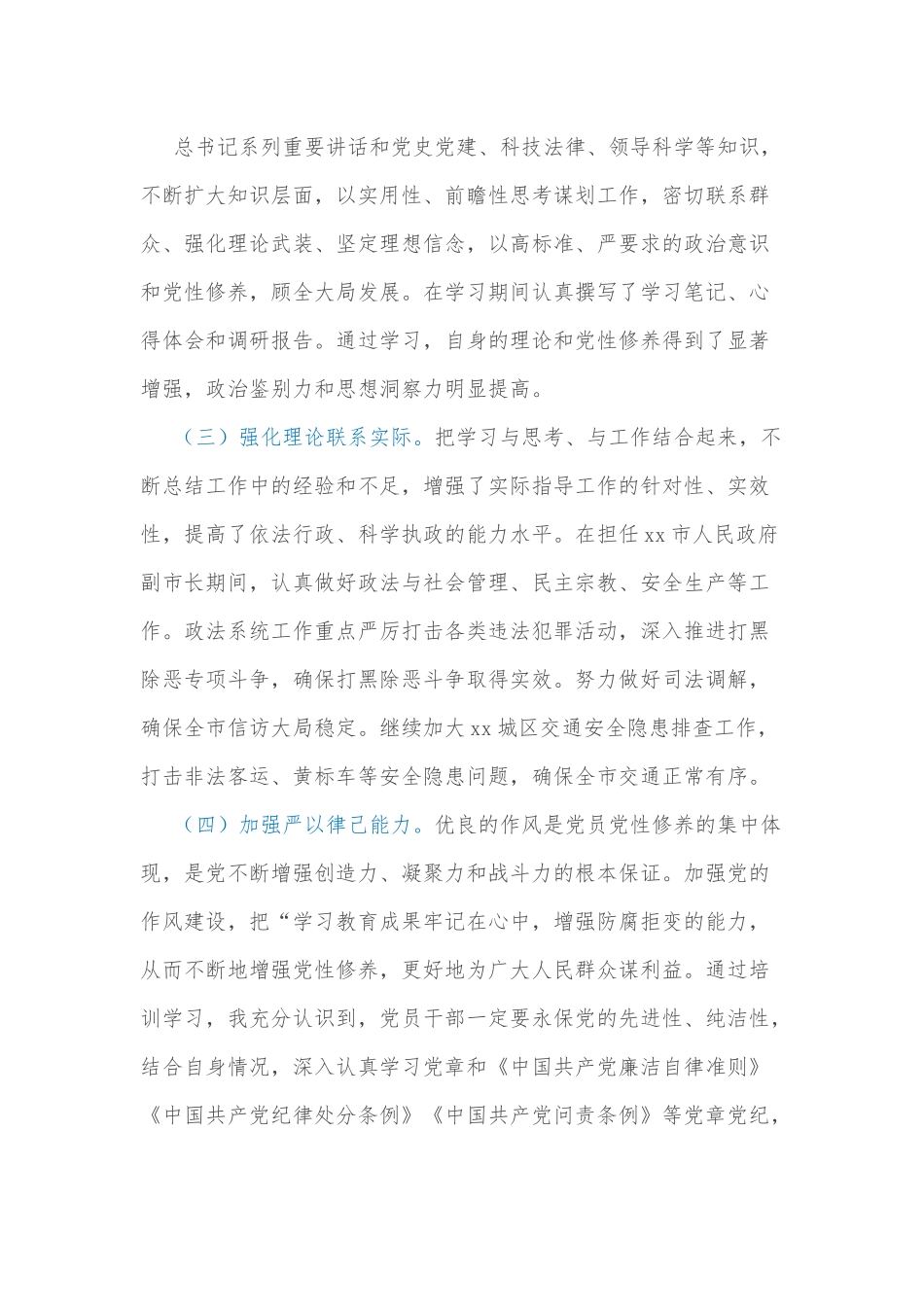 春季学期县处级干部进修班党性分析情况报告在培训期间,认真学习理论知识,注重从多方面、多渠道自觉地加强党性修养,加强世界观、人生观、价值观的改造,着力解决好理想信念和思想作风建设方面存在的突出问题。通过为期7周的学习,通过这次学习使我在思想上有了很大的转变,党性修养和党性锻炼得到了明显提高。一、注重学习强化党性修养(一)加强政治理论学习。通过学习对理论知识的重要性有了新的认识,在认真学习习近平总书记系列重要讲话精神,并结合群众路线教育实践活动学习教育成果,强化了党性修养和党性锻炼,坚定了理想信念。在坚守政治纪律,严守政治规矩,重大原则问题上始终与党中央保持高度一致。通过学习,加深了对党的性质、宗旨的全面认识,加深了对党的政策方针的深度理解,宗旨观念和党性修养都进一步得到了提高,自身素质和思想觉悟有新的认识。(二)注重把握学习重点。参加党校学习期间,给自己抽出时间自觉强化理论学习和党性锻炼创造了机会。始终把政治理论学习放在首位,不断提高理论素养,全面贯彻党的十九大和十九届三中、四中、五中、六中全会精神,深入学习习近平总书记系列重要讲话和党史党建、科技法律、领导科学等知识,不断扩大知识层面,以实用性、前瞻性思考谋划工作,密切联系群众、强化理论武装、坚定理想信念,以高标准、严要求的政治意识和党性修养,顾全大局发展。在学习期间认真撰写了学习笔记、心得体会和调研报告。通过学习,自身的理论和党性修养得到了显著增强,政治鉴别力和思想洞察力明显提高。(三)强化理论联系实际。把学习与思考、与工作结合起来,不断总结工作中的经验和不足,增强了实际指导工作的针对性、实效性,提高了依法行政、科学执政的能力水平。在担任xx市人民政府副市长期间,认真做好政法与社会管理、民主宗教、安全生产等工作。政法系统工作重点严厉打击各类违法犯罪活动,深入推进打黑除恶专项斗争,确保打黑除恶斗争取得实效。努力做好司法调解,确保全市信访大局稳定。继续加大xx城区交通安全隐患排查工作,打击非法客运、黄标车等安全隐患问题,确保全市交通正常有序。(四)加强严以律己能力。优良的作风是党员党性修养的集中体现,是党不断增强创造力、凝聚力和战斗力的根本保证。加强党的作风建设,把“学习教育成果牢记在心中,增强防腐拒变的能力,从而不断地增强党性修养,更好地为广大人民群众谋利益。通过培训学习,我充分认识到,党员干部一定要永保党的先进性、纯洁性,结合自身情况,深入认真学习党章和《中国共产党廉洁自律准则》《中国共产党纪律处分条例》《中国共产党问责条例》等党章党纪,认真查摆,抓好落实,将规律建起来,将纪律严起来,努力营造清风正气的工作热情和敬业精神。(五)增强锻炼党性自觉。通过学习,我还认识到,作为一名领导干部,想问题做事情不仅要高标准、严要求,思想站位一定要高,工作上要严以律己,精神状态要对镜正身。目前,我国正处于全面依法治国和全面深化改革的局面,其任务之重,前所未有,新形势、新任务,迫切要求我们加强党性锻炼,用党性原则规范自己,做一个适应新形势要求的合格党员。这就要求我们每一位党员干部,都要抛弃旧的思维模式,与时代合拍与时俱进。二、存在的突出问题(一)学习不深入不系统。平时很少静下心来自学,学习时浮于表面、不求甚解,缺乏联系实际深入研读。无论是理论学习还是业务学习,都没有完全做到学以致用。比如,《中国共产党廉洁从政准则》和《中国共产党纪律处分条例》、《中国共产党问责条例》颁布后,自己也学过,但远远没有学深学透。在业务学习方面,有实用主义现象,用到什么学什么,缺少系统学习,没有经常性、系统性地学习。(二)政治敏锐性不够强。由于放松了政治理论学习,在党护党意识和政治敏锐性、政治鉴别力及执行党的政治纪律的自觉性、坚定性有所减弱,对一些敏感问题特别是意识形态领域的斗争,缺乏清醒的认识,对一些苗头性倾向性问题抵制不力。比如,对网络、微博、微信上传播的一些不当言论,缺乏警觉性,只要不牵涉到本地本部门,就不管不问,没有认识到其社会危害性,也没有旗帜鲜明地抵制和...
