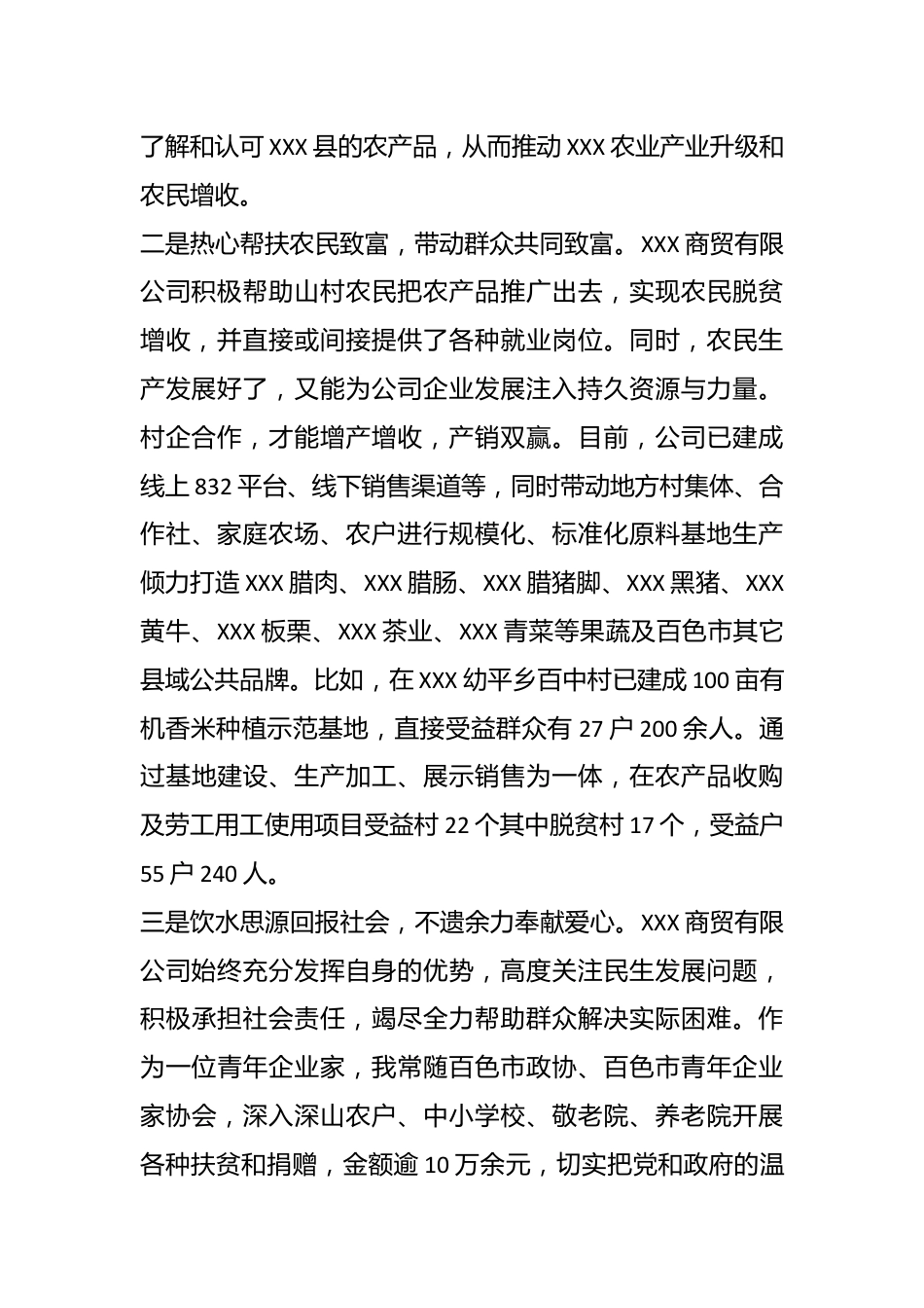 2023年最新企业家的个人先进事迹材料XXX系XXX商贸有限公司总经理,2021年9月当选政协十届XXX县委员。XXX商贸有限公司成立于2015年,是一家致力于农业发展的公司,总部位于广西百色市。公司的销售范围包括农业产品、水果、蔬菜、坚果等。公司始终秉持“以质量求生存,以信誉谋发展”的理念,通过精心的策划和营销,不断拓展公司的业务领域和市场空间。近年来,公司积极响应国家村企共建助力和美乡村建设的号召,带动农民稳定增收,为乡村建设贡献力量。一是积极开发农业产品,持续促进农民增收。XXX商贸有限公司一直致力于推广XXX及百色各县农产品,并严格把控产品的质量。通过建立销售代理渠道,公司成立了XXX脱贫产品展馆、乡村振兴产品展馆,主要销售XXX红心猕猴桃、XXX草王山茶叶、XXX顾式茶等及百色市各县区的农副产品,包括核桃、刺梨、有机米、木耳、香菇、八渡笋、山茶油等。为了方便消费者品鉴,公司在百色开设了XXXXXX香菜馆,引入XXX各种特色土菜。同时,为了让更多的消费者可以亲身感受XXX特色农产品的魅力,公司在南的XXX生态食材体验中心正在火热装修中。通过体验中心,消费者不仅可以品尝到各种美味的XXX特色农产品,还可以了解XXX乡村振兴的工作情况,以及了解XXX生态食材的生产过程让更多的人了解和认可XXX县的农产品,从而推动XXX农业产业升级和农民增收。二是热心帮扶农民致富,带动群众共同致富。XXX商贸有限公司积极帮助山村农民把农产品推广出去,实现农民脱贫增收,并直接或间接提供了各种就业岗位。同时,农民生产发展好了,又能为公司企业发展注入持久资源与力量。村企合作,才能增产增收,产销双赢。目前,公司已建成线上832平台、线下销售渠道等,同时带动地方村集体、合作社、家庭农场、农户进行规模化、标准化原料基地生产倾力打造XXX腊肉、XXX腊肠、XXX腊猪脚、XXX黑猪、XXX黄牛、XXX板栗、XXX茶业、XXX青菜等果蔬及百色市其它县域公共品牌。比如,在XXX幼平乡百中村已建成100亩有机香米种植示范基地,直接受益群众有27户200余人。通过基地建设、生产加工、展示销售为一体,在农产品收购及劳工用工使用项目受益村22个其中脱贫村17个,受益户55户240人。三是饮水思源回报社会,不遗余力奉献爱心。XXX商贸有限公司始终充分发挥自身的优势,高度关注民生发展问题,积极承担社会责任,竭尽全力帮助群众解决实际困难。作为一位青年企业家,我常随百色市政协、百色市青年企业家协会,深入深山农户、中小学校、敬老院、养老院开展各种扶贫和捐赠,金额逾10万余元,切实把党和政府的温暖送到群众最需要的地方。多年以来,通过不懈努力,竭诚奉献,公司得到了社会和群众的高度认可和一直好评,自己作为公司负责人也先后荣获抗疫“爱心企业”、“精准助学青春同行”、“关爱老人热心公益,尊老敬老社会和谐”等荣誉称号十余个。四是深入推进村企共建,持续助力乡村振兴。XXX商贸有限公司致力于深耕地方特色经济产业,在实现企业在发展的基础上,既帮助农民把产品卖出去,又带动了一批农村劳力就业,有力促进了乡村经济的振兴。同时,我注重把充分发挥企业所能与群众所需有效对接起来,带动示范全社会共同服务基层群众、农业产业发展和基层治理,在服务群众的一件件实事中广泛凝聚发展共识、价值观共识。并结合委员企业优势,充分发挥政协委员的职能,聚力打造公共品牌,加强管理,促进农业产业标准化、规模化、品牌化、溯源化发展,提升产品竞争力,推动与市场接轨,努力做到村企共建,协同发展,不断助推乡村振兴工作。“为者常成,行者常至”。公司将始终以市场为导向,以效益为目的,以响应政府的助力脱贫为目标,以科技为手段,采取各种措施,充分利用土地资源,增强农业综合生产能力,改善农业的基础设施条件,大力发展生态农业,促进企业发展,农业增效,达到企农增收,企业与农村共同发展的目的。努力为促进农村经济发展贡献更大力量。