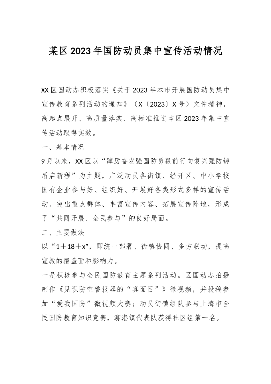 某区2023年国防动员集中宣传活动情况XX区国动办积极落实《关于2023年本市开展国防动员集中宣传教育系列活动的通知》(X〔2023〕X号)文件精神,高起点展开、高质量落实、高标准推进本区2023年集中宣传活动取得实效。一、基本情况9月以来,XX区以“踔厉奋发强国防勇毅前行向复兴强防铸盾启新程”为主题,广泛动员各街镇、经开区、中小学校国有企业参与好、组织好、开展好各类形式多样的宣传活动。突出重点群体、丰富宣传内容、拓展宣传阵地,形成了“共同开展、全民参与”的良好局面。二、主要做法以“1+18+x”,即统一部署、街镇协同、多方联动,提高宣教的覆盖面和影响力。一是积极参与全民国防教育主题系列活动。区国动办拍摄制作《见识防空警报器的“真面目”》微视频,并投稿参加“爱我国防”微视频大赛;动员街镇组队参与上海市全民国防教育知识竞赛,泖港镇代表队获得社区组第一名。二是全面开展线下设点集中宣传活动。9月16日下午,XX区在XX政法大学(XX校区)XX体育馆组织开展集中宣传活动,市国动办副主任XXX、XX区副区长XXX、XX政法大学副校长XXX、XX区人武部政委XXX大校等领导出席,XX区委、区政府近20个部委办局分管领导和来自上海外国语大学、东华大学、华东政法大学、上海工程技术大学、上海对外经贸大学、上海立信会计学院、上海视觉艺术学院、上海农林职业技术学院、上海立达学校、上海科创职业技术学院10所高校的教职员工、学生约1500人参加了活动。本区18个街镇(经济技术开发区)结合防空警报试鸣和工作实际,各自组织开展了线下设点集中宣传活动。三是持续深化“六进”和社会面宣传。G60科创云廊第二年上演国防动员主题灯光秀;与各委办局联动形成宣传合力在机关集中办公点、委办局办公楼的宣传栏(橱窗)等场所(设备)张贴宣传海报,播放宣传视频,宣传国动人防知识。各街镇、村居通过张贴海报、悬挂横幅、投放视频制作展板、组织技能训练等方式,开展“六进”宣传教育XX民防科普馆开展“有你参与更精彩”探馆活动,截止上报,接待参观27批近2000人。四是扎实开展高校人民防空专题宣传教育。除联合华东政法大学开展国防动员集中宣传活动外,协调上海立达学院开展国防动员“进高校”活动,组织国防动员展板宣传、防空警报知识宣讲、防空疏散演习、参观XX民防科普馆等活动。于9月25日,到上海对外经贸大学开展人民防空知识授课辅导。五是广泛利用媒体渠道。依托市、区、街镇三级“网、报端、微、视、屏”融媒体传播矩阵,融合发力提升传播力各级各平台共计63个,累计发布新闻稿、视频135次。华东政法大学集中宣传活动还与2023年XX市全民国防教育主题系列活动大直播进了连线。三、成功经验一是“三步”部署推进。谋划高一步。贯彻落实市国动办《关于深化推广国防动员宣传教育“六进”示范品牌试点成果的指导意见》,选择具有代表性、影响力的大学高校作为线下集中宣传活动点。积极沟通协调、精心谋划,制定并上报详细的活动方案。部署跨一步。主动跨前,对接区委宣传部、区人武部、区教育局,四部门联合印发《关于2023年XX区开展国防动员集中宣传教育系列活动的通知》,对本区国防动员集中宣传教育活动项目进行总体安排,同步召开了国防动员集中宣传活动工作部署会,提出具体要求、落实责任分工。行动快一步。市办下发通知后XX国动办坚持“不等不靠、主动作为”,做到精心谋划部署、迅速有力推进。各街镇也迅速响应,按照“统一部署条线协调、分级实施”原则,策划各单位开展宣传教育、培训演练等活动的具体内容。二是“三联”深入开展。“市区联动”有声势。在市国动办、上海警备区动员局、市教委、市政府征兵办指导支持下,与区委宣传部、华东政法大学党委宣传部共同承办本区线下集中宣传活动。通过国防动员装备器材展示、有奖知识竞答、游戏互动、特色手工展示等活动,为大学城十所高校千余名学生带来一场沉浸式国防教育体验,为青年大学生带来一堂强防铸盾、爱我国防的“大思政课”。宣传活动还在与上海市全民国防教育日大直播进行了连线。“部门联动”有影响。区国动办参与举办XX区全民国防教育主题系列活动启动仪式,国防动员集中宣传活动列入本区“爱...