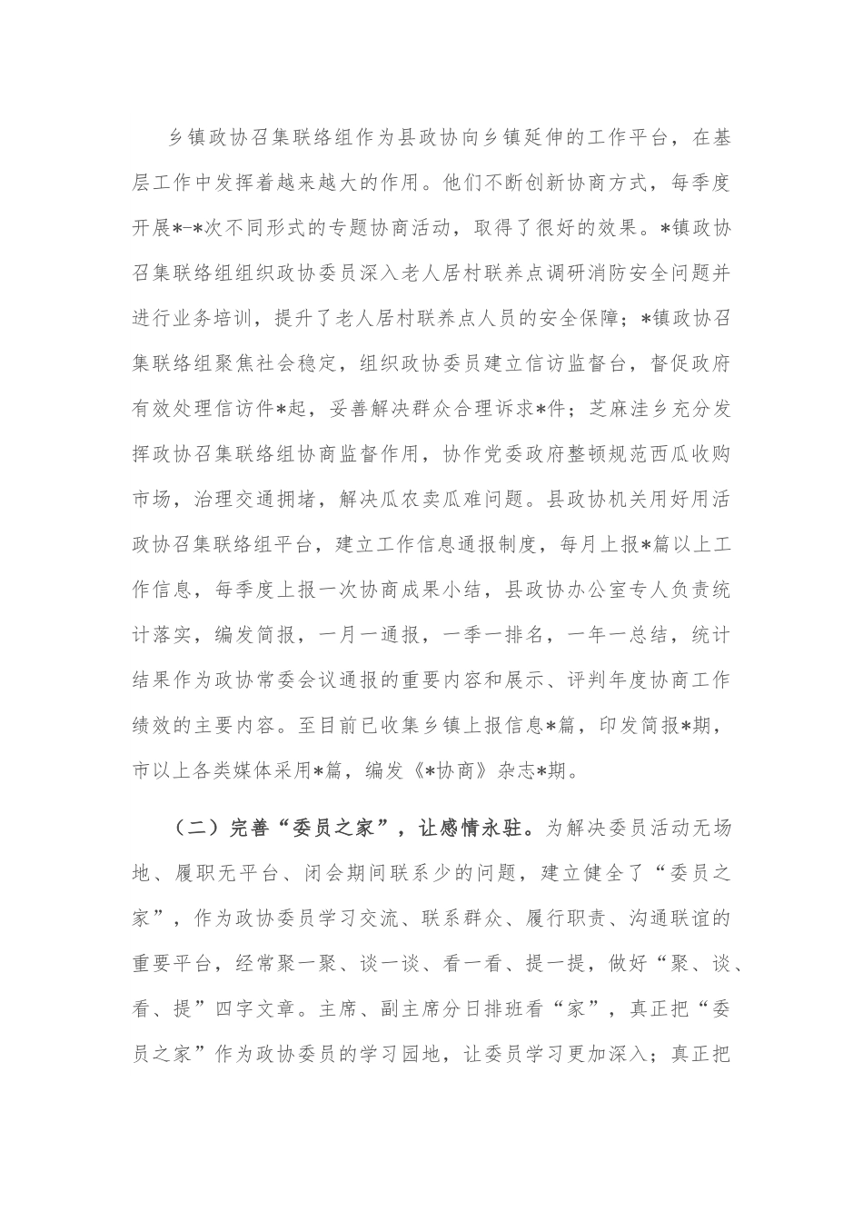 创新协商机制科学履职尽责——县政协创新协商机制交流发言材料*县政协结合实际探索创新“1+N”协商机制,抓住党建引领这个龙头,充分发挥政协委员的主体作用和创新创造精神,多层次、多领域、多形式创新协商方式,用实际行动书写新时代政协委员的使命担当。此做法得到市政协*主席和*县委*书记的签批肯定。*县政协连续三年荣得全县“综合考评优秀领导班子”“先进基层党组织”称号,*年市政协对*政协的履职实践、提案和宣传工作也给予了表彰。其做法概括为“四子布阵,跃动全局”。一、牢树“旗子”,确保定位明确不迷航党建引领是政协工作的“旗子”,是委员务实履职的方向。习近平总书记强调,“把抓好党建作为最大的政绩”,这是对新形势下全面加强党的建设提出的新要求。*县结合实际探索创新了“1+N”协商机制。“1”的核心要义是讲政治,强化党建引领,坚定党对政协工作的领导;“N”的要义就是崇尚创新、崇尚学习、崇尚实践,发挥政协委员的主作用和创新创造精神,提升协商格局,活跃协商方法,既丰富完善协商平台,又拓宽委员履职视角。“1+N”协商机制,突出党建引领地位,切实做到“把支部建在界别上,把委员聚在党旗下”,用习近平新时代中国特色社会主义思想这一强大武器,武装头脑、指导实践、凝聚共识、推动工作,真正把党中央关于政协党的建设的各项要求落到实处。二、建强“班子”,确保坚强有力站排头为使政协工作高质量发展,*县政协狠抓“班子”建设。一是县委及时调整充实政协党组,有效加强了党对政协工作的领导,发挥了政协党组把方向、管大局、保落实的重要作用;二是在政协机关、各界别小组和各乡镇政协召集联络组建立了*个党支部,*个党小组,狠抓基层组织建设。三是县纪委派驻了纪检组织,对政协履职进行了有效的监督。从支部设置、成员配备、目标责任、建章立制、教育管理、作用发挥等方面规范提升。三、搭好“台子”,确保双向发力放光芒(一)健全政协召集联络组,让基层发光。乡镇政协召集联络组作为县政协向乡镇延伸的工作平台,在基层工作中发挥着越来越大的作用。他们不断创新协商方式,每季度开展*-*次不同形式的专题协商活动,取得了很好的效果。*镇政协召集联络组组织政协委员深入老人居村联养点调研消防安全问题并进行业务培训,提升了老人居村联养点人员的安全保障;*镇政协召集联络组聚焦社会稳定,组织政协委员建立信访监督台,督促政府有效处理信访件*起,妥善解决群众合理诉求*件;芝麻洼乡充分发挥政协召集联络组协商监督作用,协作党委政府整顿规范西瓜收购市场,治理交通拥堵,解决瓜农卖瓜难问题。县政协机关用好用活政协召集联络组平台,建立工作信息通报制度,每月上报*篇以上工作信息,每季度上报一次协商成果小结,县政协办公室专人负责统计落实,编发简报,一月一通报,一季一排名,一年一总结,统计结果作为政协常委会议通报的重要内容和展示、评判年度协商工作绩效的主要内容。至目前已收集乡镇上报信息*篇,印发简报*期,市以上各类媒体采用*篇,编发《*协商》杂志*期。(二)完善“委员之家”,让感情永驻。为解决委员活动无场地、履职无平台、闭会期间联系少的问题,建立健全了“委员之家”,作为政协委员学习交流、联系群众、履行职责、沟通联谊的重要平台,经常聚一聚、谈一谈、看一看、提一提,做好“聚、谈、看、提”四字文章。主席、副主席分日排班看“家”,真正把“委员之家”作为政协委员的学习园地,让委员学习更加深入;真正把“委员之家”作为协商基地,让协商活动更加多彩;真正把“委员之家”作为政协委员的履职平台,让履职更加务实科学。通过“委员之家”窗口,倾听委员心声,反映群众意愿,为党委政府决策提供参考。自今年“委员之家”建立完善以来,共接纳委员*人次,开展活动*次,收集意见和建议*条,为党委政委提供价值参考*条。(三)开办政协大讲堂,让生活多彩。*县政协创新形式开办的政协大讲堂,围绕“习近平总书记关于加强和改进新时代人民政协工作重要思想”“新时代人民政协党的建设”“新时代市县政协的新样子”等主题,采取以会代训的方式,给予面对面授课和现场交流,促使广大政协委员进一步...