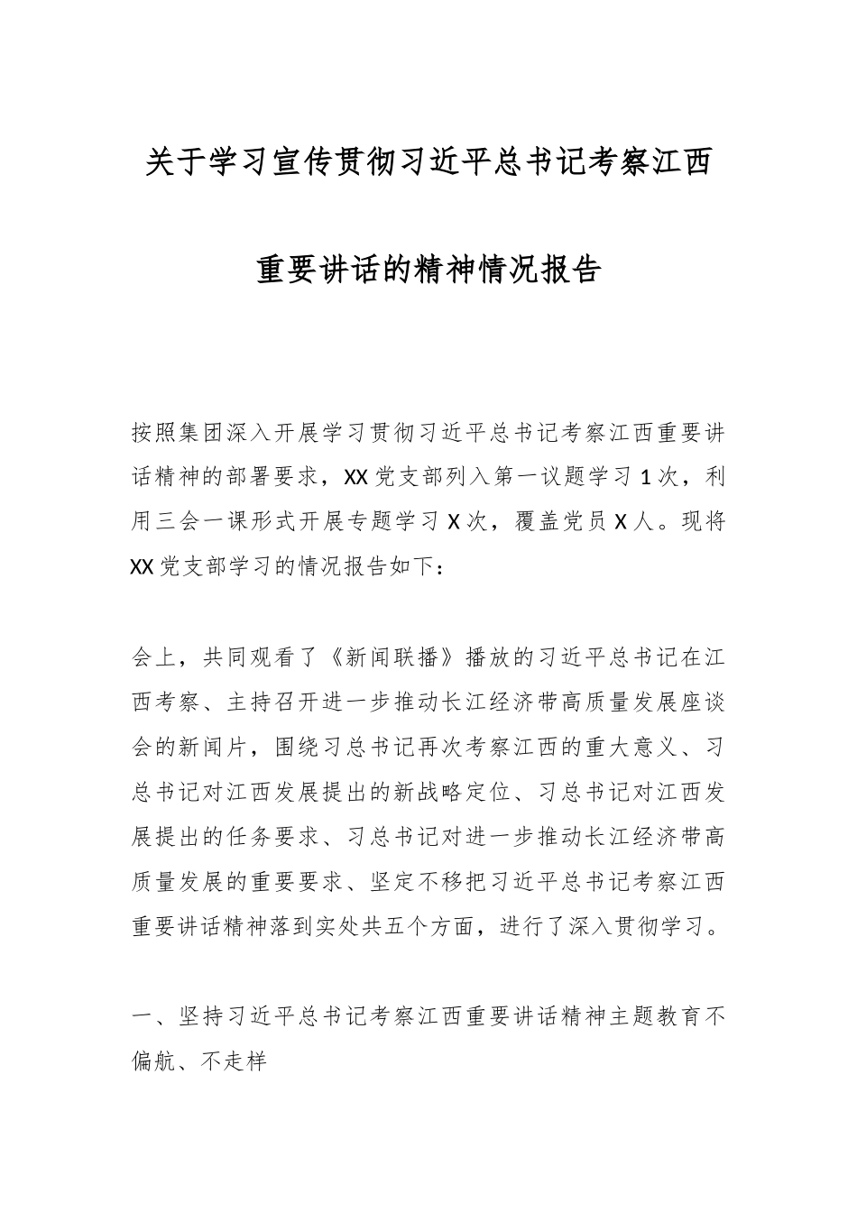 关于学习宣传贯彻习近平总书记考察江西重要讲话的精神情况报告按照集团深入开展学习贯彻习近平总书记考察江西重要讲话精神的部署要求,XX党支部列入第一议题学习1次,利用三会一课形式开展专题学习X次,覆盖党员X人。现将XX党支部学习的情况报告如下:会上,共同观看了《新闻联播》播放的习近平总书记在江西考察、主持召开进一步推动长江经济带高质量发展座谈会的新闻片,围绕习总书记再次考察江西的重大意义、习总书记对江西发展提出的新战略定位、习总书记对江西发展提出的任务要求、习总书记对进一步推动长江经济带高质量发展的重要要求、坚定不移把习近平总书记考察江西重要讲话精神落到实处共五个方面,进行了深入贯彻学习。一、坚持习近平总书记考察江西重要讲话精神主题教育不偏航、不走样习近平考察江西重要讲话中强调了习近平新时代中国特色社会主义思想,我们将坚持以习近平新时代中国特色社会主义思想为指导,坚决贯彻落实习近平总书记考察江西重要讲话精神中的思想精髓,坚定拥护“两个确立”、坚决做到“两个维护”。下一步,我们将持续加强组织领导,统筹理论学习,扎实理论学习,强化党的创新理论武装,提升政治能力,强化公司党员干部员工自身修养,筑牢政治风险“防火墙”,把殷切希望转化为推动公司发展的实际成效。二、坚持学思践悟,凝心铸魂,确保学习教育学进去、做出来我们要把学习贯彻习近平总书记考察江西重要讲话精神同学习贯彻习近平新时代中国特色社会主义思想结合起来,立足岗位实际,强化XX公司自营项目管理能力,着力健全完善现代企业制度,全面加强公司人才建设,不断增强工作的系统性、预见性、创造性,为公司高质量发展提供有力保障。学深悟透,不断提升政治能力,要把学习宣传贯彻落实好习近平总书记重要讲话精神作为当前和今后一个时期的首要政治任务,结合“第一议题”、主题党日、专题党课等形式,深刻学习理解习近平总书记重要讲话的重大政治意义和实践意义,领会核心要义、把握实践要求,自觉对标对表,进一步坚定理想信念,筑牢政治忠诚,提升政治判断力、政治领悟力、政治执行力,更加牢固树立“四个意识”,坚定“四个自信”,做到“两个维护”,捍卫“两个确立”,切实担负起党和人民赋予的政治责任始终做政治上的明白人。三、坚持破解难题,问计于民,确保调查研究出实招、求实效我们要发扬理论联系实际的优良学风,全面把握习近平总书记考察江西重要讲话精神的实践要求,以党建业务融合工作为核心,结合集团工作部署,抓实调查研究,推动解决问题。紧密结合公司实际,做好领题调研调查研究,采取座谈会、听取党员群众意见等方式,做到“摸实情、取真经,出实招、干实事”。四、以学促干强化使命担当,推动公司全方位高质量发展学习的目的全在于运用。一方面,我们要坚持“学”字为先从而增强斗争本领。在学习贯彻习近平总书记考察江西重要讲话精神中,要围绕学思想、强党性、重实践、建新功的总体要求推进教育活动走向深入、走向实处。既要学习先进理论,坚定理想信念,以理论上的成熟促进政治上的清醒,同时也要在做好市场经营工作的同时,强化自营项目管理能力,稳步开展经营布局。另一方面,我们要坚持“干”字为基,在知行合一中践行学习成果。把学习教育和解决问题结合起来,摸清XX公司经营现状,并对发现问题不回避、不遮掩,立行立改,推动问题解决,切实推动公司全方位高质量发展。