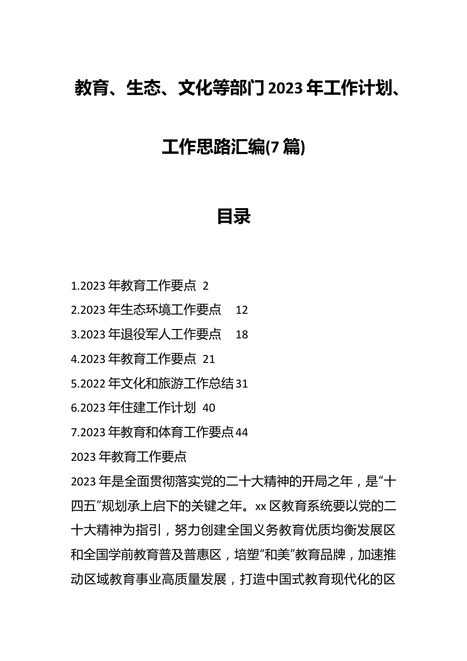教育、生态、文化等部门2023年工作计划、工作思路汇编(7篇)目录1.2023年教育工作要点22.2023年生态环境工作要点123.2023年退役军人工作要点184.2023年教育工作要点215.2022年文化和旅游工作总结316.2023年住建工作计划407.2023年教育和体育工作要点442023年教育工作要点2023年是全面贯彻落实党的二十大精神的开局之年,是“十四五”规划承上启下的关键之年。xx区教育系统要以党的二十大精神为指引,努力创建全国义务教育优质均衡发展区和全国学前教育普及普惠区,培塑“和美”教育品牌,加速推动区域教育事业高质量发展,打造中国式教育现代化的区域样本,办好人民满意的教育,为xx建设现代化滨海大都市高能门户,打造中国式现代化港城示范区贡献教育力量。一、深学笃行党的二十大精神,为教育高质量发展培根铸魂(一)深学精神赋能教育发展。深入贯彻落实“五学四讲三研”方案,坚持将学习宣传贯彻党的二十大精神与办人民满意的教育有机融合,作为贯穿全年的一项重要政治任务。积极创新学习载体,不断深化学习效果,持续营造学习热潮,赋能区域教育发展,将党的二十大精神转化为xx教育领域的生动实践、实绩实效。持续推出“名校长谈党的二十大精神学习体会”“‘红色根脉’强根基·‘六促六优’亮作为”等系列宣传,形成比学赶超、赛马争先的良好氛围。(二)贯彻制度强化组织领导。进一步加强基层党组织建设,深入实施“红色根脉强基工程”,纵深推进党组织领导的校长负责制,召开基层党组织规范化建设工作现场会。加强学校党建工作力量,有序推进学校领导班子党政分设,配齐配强学校专职副书记、党务工作者,实现中小学、幼儿园全覆盖。完善中小学校党组织会议、校长办公会议制度和议事规则。推动“党建+人事”融合,逐步建立能进能出、可上可下的党员干部管理机制。用好“七张问题清单”,以党建工作破解教育难题。(三)开门办学营造良好生态。坚持“开门办教育”,做好招生、招聘、采购等教育政务信息公开,坚持阳光招生、阳光分班、阳光招聘、阳光管理。在“周二夜学”“周三夜谈”基础上,开展局机关干部联系学校谈心谈话交流活动。加强教育工作者家风建设,创新开展校园长家访等活动。定期邀请人大代表、政协委员、村社干部、家长教师代表召开教育工作座谈会,广纳良策,凝聚办好人民满意教育的强大合力。(四)加强监管打造清正环境。进一步加强全面从严治党思想政治建设,修订完善各项制度,营造风清气正育人环境。发挥教育局党委巡查组作用,按计划面向学校开展巡查,规范办学行为。完善教育系统招投标、工程发包、物资采购廉政合同制度等规章制度,严格学校、幼儿园经费管理、收费管理。修订完善教育系统采购实施办法,加强采购业务人员培训,完善采购档案,确保各类采购有章可循、一项一档。加强校服采购和校服质量监管。二、稳步扩充优质资源,为教育高质量发展强基赋能(一)加速推动教育项目落地。科学优化教育资源布局,加速教育基建项目推进,力争教育资源布局建设与社会经济建设同步规划、先行实施。2023年,拟投用xx小学、xx职高、xx二期扩建,xx幼儿园新建、中心幼儿园星中路分园改建等工程。加快xx中学扩建,xx中学xx校区、xx小学东校区、xx学校、xx幼儿园新建等项目进度。加速xx经济示范区配套学校、xx第一学校、xx片区配套学校、xx城配套学校等新建项目启动。(二)加速推动校园环境升级。持续增加基础设施设备建设投入,扩充相对薄弱学校生均资源,做好全国义务教育优质均衡发展区和全国学前教育普及普惠区两大国家级创建的整改提升。修缮升级相对老旧学校校园环境,提升xx小学、xx小学x所原外来工子女学校硬件设施。加速推进教室智能灯光改造、食堂燃气“瓶改管”、学生午休“趴改躺”、风雨接送廊、儿童友好上学路等惠民工程实施推广,创建更多省现代化学校。(三)加速推动数字化改革见效。加速教育领域数字化改革,推进“随时学”、“随时问”、智能触控一体机、“入学百事通”、智慧接送等系统深度应用。深入谋划数字教育建设,分期分批建设“仑有优学”应用,争创数字教育省级试点。全面梳理科室、条线、学校数字化平台数据,建设“一站式”教育办...