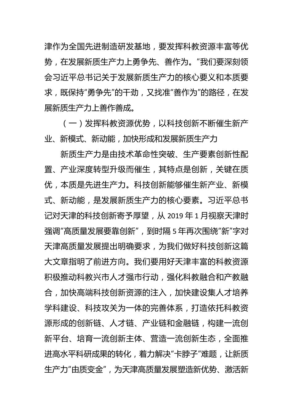 践行“四个善作善成”重要要求奋力谱写中国式现代化天津篇章习近平总书记在视察天津重要讲话中强调,天津要聚焦经济建设这一中心工作和高质量发展这一首要任务,以推进京津冀协同发展为战略牵引,勇担使命、开拓进取,全面建设社会主义现代化大都市,奋力谱写中国式现代化天津篇章。这是习近平总书记站在党和国家事业战略全局高度对新征程上天津工作提出的总体要求,赋予天津新使命、新目标、新任务。我们要深刻领会把握习近平总书记对天津工作的总体要求,把习近平总书记的殷殷嘱托和关怀厚爱转化为奋发笃行的不竭动力,以最坚决的态度、最有力的举措、最扎实的作风,在发展新质生产力上善作善成,在进一步全面深化改革开放上善作善成,在推动文化传承发展上善作善成,在提升城市治理现代化水平上善作善成牢记嘱托、勇担使命、开拓进取,学在深处、谋在新处、干在实处,奋力谱写中国式现代化天津篇章。一、坚持科技创新和产业创新一起抓,在发展新质生产力上善作善成新质生产力主要以科技创新为引擎,以新产业为主导以产业升级为方向,以提升核心竞争力为目标,是推动高质量发展的内在要求和重要着力点。习近平总书记强调,“天津作为全国先进制造研发基地,要发挥科教资源丰富等优势,在发展新质生产力上勇争先、善作为。”我们要深刻领会习近平总书记关于发展新质生产力的核心要义和本质要求,既保持“勇争先”的干劲,又找准“善作为”的路径,在发展新质生产力上善作善成。(一)发挥科教资源优势,以科技创新不断催生新产业、新模式、新动能,加快形成和发展新质生产力新质生产力是由技术革命性突破、生产要素创新性配置、产业深度转型升级而催生,其特点是创新,关键在质优,本质是先进生产力。科技创新能够催生新产业、新模式、新动能,是发展新质生产力的核心要素。习近平总书记对天津的科技创新寄予厚望,从2019年1月视察天津时强调“高质量发展要靠创新”,到时隔5年再次围绕“新”字对天津高质量发展提出明确要求,为我们做好科技创新这篇大文章指明了前进方向。我们要用好天津丰富的科教资源积极推动科教兴市人才强市行动,强化科教融合和产教融合,加快高端科技创新资源的注入,加快建设集人才培养学科建设、科技攻关为一体的完善体系,打造依托科教资源形成的创新链、人才链、产业链和金融链,构建一流创新平台、培育一流创新主体、营造一流创新生态,全面推进高水平科研成果的转化,着力解决“卡脖子”难题,让新质生产力“由质变金”,为天津高质量发展塑造新优势、激活新动能。(二)立足全国先进制造研发基地功能定位,推动科技创新和产业发展深度融合建设全国先进制造研发基地是党中央、国务院对新时代天津高质量发展提出的功能定位。天津有深厚的工业基础、突出的产业优势、齐全的生产要素,这是我们在发展新质生产力上“勇争先”的优势和底气所在。我们要深刻领会习近平总书记重要讲话的丰富内涵,在发展新质生产力上找到“善作为”的着力点,坚持科技创新和产业创新一起抓,实现科技变革和产业变革有机联动。要以科技创新引领现代产业体系建设,围绕合成生物、细胞与基因治疗、脑机交互等优势领域,超前部署一批前沿技术项目,努力形成一批原创性、颠覆性技术成果,不断催生新业态、新模式新动能,培育发展新质生产力。与此同时,要坚持以产业焕新倒逼科技创新,立足全国先进制造研发基地功能定位聚焦重点产业、战略性新兴产业、未来产业发展,深入推进12条重点产业链建设,加快推动产业成链成群、成龙配套,以“智”造升级推动产业转型升级、促进提质增效。(三)高标准建设天开高教科创园等创新平台载体,促进数字经济与实体经济深度融合,推动制造业高端化、智能化、绿色化发展新质生产力是创新起主导作用,能充分激发劳动、知识、技术、管理、资本和数据等生产要素活力,更好体现知识、技术、人才的市场价值,这就需要加快建立健全科创平台体系,聚焦强化创新策源、深化转化应用、优化公共服务持续发力。习近平总书记提出,要“加强科创园区建设,促进数字经济与实体经济深度融合”。这更加鼓舞和激励我市高标准高质量建设天开高教科创园,通过深化产学...