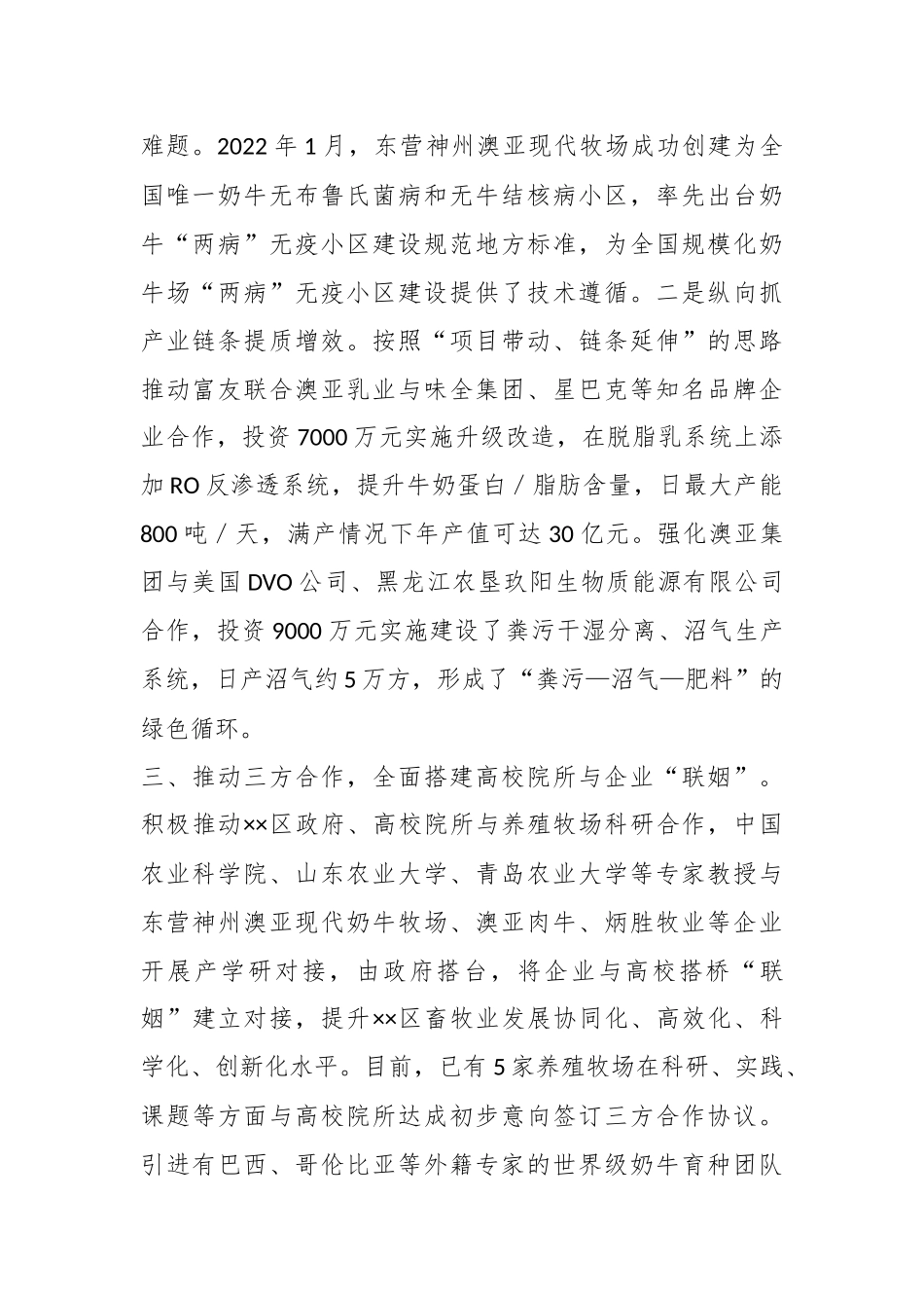 XX区农牧产业发展典型交流材料近年来,我区以改革创新为引领,以建设省级高效现代畜牧强区、省畜牧业高质量发展先行区为目标,创新推行“一二三四五”工作法,集聚各类资源力量,着力推进畜牧产业高端发展。去年,××区被评为全省首批“省畜牧业高质量发展先行县”。一、把握一条主线,全速启动党建引领创新“引擎”。一是以支部为创新堡垒。先后成立5个重点产业项目和新冠疫情防控行动党支部,充分发挥战斗堡垒作用,扎实推进项目建设,全力保障畜牧业项目又好又快实施。二是以品牌为创新导向。创建“畜牧先锋”135党建品牌,以1个党支部为引领,建立“项目稳产保供、产品质量安全、动物疫病防控”3项重点任务工作体系,延伸至5个基层防控所,让党旗在畜牧一线高高飘扬。三是以争优为创新抓手。对全区304家规模养殖场,在养殖场户主为共产党员的群体中,对防疫细、资源化利用科学、创新意识强的养殖场户,每年评选出一批10个“红旗牧场”,发挥养殖场户争先创优作用,实现党建引领牧场创新驱动。二、坚持两手发力,全力破解畜牧行业难题“瓶颈”。一是横向抓地方规范标准创建。在畜禽粪污资源化利用、动物疫病防控、畜产品质量安全、无害化处理等方面加大力度破解难题。2022年1月,东营神州澳亚现代牧场成功创建为全国唯一奶牛无布鲁氏菌病和无牛结核病小区,率先出台奶牛“两病”无疫小区建设规范地方标准,为全国规模化奶牛场“两病”无疫小区建设提供了技术遵循。二是纵向抓产业链条提质增效。按照“项目带动、链条延伸”的思路推动富友联合澳亚乳业与味全集团、星巴克等知名品牌企业合作,投资7000万元实施升级改造,在脱脂乳系统上添加RO反渗透系统,提升牛奶蛋白/脂肪含量,日最大产能800吨/天,满产情况下年产值可达30亿元。强化澳亚集团与美国DVO公司、黑龙江农垦玖阳生物质能源有限公司合作,投资9000万元实施建设了粪污干湿分离、沼气生产系统,日产沼气约5万方,形成了“粪污—沼气—肥料”的绿色循环。三、推动三方合作,全面搭建高校院所与企业“联姻”。积极推动××区政府、高校院所与养殖牧场科研合作,中国农业科学院、山东农业大学、青岛农业大学等专家教授与东营神州澳亚现代奶牛牧场、澳亚肉牛、炳胜牧业等企业开展产学研对接,由政府搭台,将企业与高校搭桥“联姻”建立对接,提升××区畜牧业发展协同化、高效化、科学化、创新化水平。目前,已有5家养殖牧场在科研、实践、课题等方面与高校院所达成初步意向签订三方合作协议。引进有巴西、哥伦比亚等外籍专家的世界级奶牛育种团队建立澳华生科动物体外胚胎实验室,采用世界最先进生物遗传技术开展奶牛胚胎生产,年产优质奶牛胚胎1.2至1.6万枚,有力提升了奶肉牛遗传育种水平。四、坚持四方联动,全心为民践行服务宗旨“使命”。一是创新思路,与企业形成共建。与养殖牧场党支部通过采取共同举办“主题党日”、助企强企派驻等形式,形成政企支部共建合力,推动与企业深度融合,每个大型牧场确定派驻1名助企强企联络员,帮助协调解决企业实际困难,为企业发展保驾护航。二是倾心支持,提升社区居民满意度。结合畜牧行业资源,借助社区“双报到”,与养殖牧场共同出资为社区安装充电棚和路灯,提升企业公益爱心进一步改善社区居民日常生活质量。充分利用官方兽医和宠物门诊机构,在“双报到”社区开展犬类免费义诊优惠防疫全覆盖活动,进一步提升广大居民的幸福感和满意度三是上下共建,做好软弱村帮扶工作。单位下派第一书记驻村帮扶,聚焦乡村振兴产业发展的战略目标,打造面粉品牌,打通新冠疫情期间销售渠道;跨村联建光伏产业,为周边村民实现增收;聚焦突破民生难事,改善村级交通设施。今年以来,通过各种渠道已协调资金72万元,为帮扶村实施公路护栏安装、修缮村内公路、硬化文化大院等为民实事项目。五、构建五位一体,全方位促进产业乡村振兴“蜕变”。创新推行“饲草种植—良种繁育—规模养殖—粪污资源化利用—乳品深加工”种育养用深五位一体的奶业全产业链目前××区奶牛产业存栏为4万余头。实行“优草优畜”“粮改饲”等工作模式,每年争取800万元上级资金全部用于推动全区农牧循环发展,已...