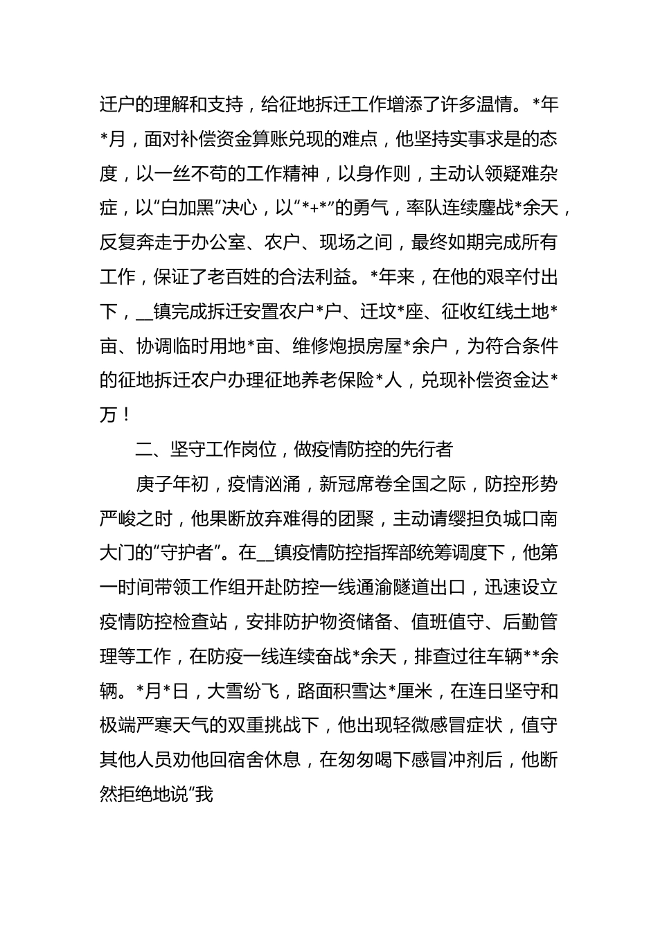 XX副镇长、武装部长先进个人事迹材料*,__市城口县人,现任*县__镇人民政府副镇长、武装部长,主抓武装工作,协助高速公路建设,分管安全、工程建设、环保、城乡建设、国土、电力等重点工作。*年—*年连续*年年度考核为优秀,*年—*年连续*年年度考核为称职。*年荣获年度危险化学品、烟花爆竹打非治违“先进个人”荣誉称号;*年被表彰为年度“武装工作先进个人”,被评为征兵工作先进个人;*年被评为优秀便民诉讼联络员;*年被评为专武部长轮训“优秀学员”。一、积极担当作为,做伟大工程的护航者*银百高速公路城口段途径__镇青龙村庄子坝,*年征地拆迁工作启动,根据工作安排,方明担任征地拆迁现场负责人。面对复杂而艰巨的任务,他勇挑重担,秉持使命所在、职责所系、为民服务的工作理念,紧紧围绕中心、服务大局,深入征地拆迁工作一线,落实征地拆迁政策、调处矛盾纠纷,为高速公路建设顺利推进做出了突出贡献宣传动员和矛盾纠纷调处是征地拆迁工作的关键环节,面对迟迟不签约、对补偿款不满意的拆迁户以及其他矛盾纠纷,他数次率队深入被拆迁户家中解释相关拆迁补偿安置政策,耐心解答群众提出的各种问题。同时在不违反拆迁政策的前提下,用真诚的关怀拉近与群众的距离,实事求是地与农户们商谈,取得拆迁户的理解和支持,给征地拆迁工作增添了许多温情。*年*月,面对补偿资金算账兑现的难点,他坚持实事求是的态度,以一丝不苟的工作精神,以身作则,主动认领疑难杂症,以“白加黑”决心,以“*+*”的勇气,率队连续鏖战*余天,反复奔走于办公室、农户、现场之间,最终如期完成所有工作,保证了老百姓的合法利益。*年来,在他的艰辛付出下,__镇完成拆迁安置农户*户、迁坟*座、征收红线土地*亩、协调临时用地*亩、维修炮损房屋*余户,为符合条件的征地拆迁农户办理征地养老保险*人,兑现补偿资金达*万!二、坚守工作岗位,做疫情防控的先行者庚子年初,疫情汹涌,新冠席卷全国之际,防控形势严峻之时,他果断放弃难得的团聚,主动请缨担负城口南大门的“守护者”。在__镇疫情防控指挥部统筹调度下,他第一时间带领工作组开赴防控一线通渝隧道出口,迅速设立疫情防控检查站,安排防护物资储备、值班值守、后勤管理等工作,在防疫一线连续奋战*余天,排查过往车辆**余辆。*月*日,大雪纷飞,路面积雪达*厘米,在连日坚守和极端严寒天气的双重挑战下,他出现轻微感冒症状,值守其他人员劝他回宿舍休息,在匆匆喝下感冒冲剂后,他断然拒绝地说“我是一名退伍军人,也是通渝隧道疫情防控检查站临时党支部支部书记,关键时候我必须起好带头作用!”他还非常关心年轻同志成长,对于和他一样舍小家为大家,连续奋战坚守岗位的年轻同志,他是看在眼里疼在心里,得知组织针对在疫情防控工作中表现突出人员,出台了“火线入党”的政策后,他积极向党组织推荐交警大队徐广军同志、交通局公路行政执法大队张军同志。在疫情防控中,他用实际行动践行了一名共产党员的先锋模范作用,对上级疫情防控指挥部的各项决策部署都快速反应、迅速行动,始终冲锋在防疫一线,是实实在在的“行动主义者”。三、心系群众冷暖,做“啃硬骨头”的实干者作为一名乡镇副职领导,特别是分管城建、环保、交通、水利等工作,方明同志深感工作压力大、担子重,但他坚持民情民意在一线掌握、民生诉求在一线解决、惠民政策在一线落实,用敢于担当、攻坚克难的斗争精神为全镇干部树立了楷模,用辛勤的付出换来了群众的信任和尊重。担任青龙村联系村领导期间,他认真落实“三精准”、“三落实”政策,遍访该村*户贫困户,仅*年就有效解决群众困难*件,化解矛盾纠纷*件。特别是今年因高速公路隧道修建放炮震漏水源,导致青龙村部分村民出现饮水困难,他先后*次徒步前往位于半山腰的水源现场查看,多方协调,及时解决了青龙村*、*、*社共计*户*余人的饮水困难。面对农村土地确权登记颁证工作中遇到的疑难杂症和矛盾纠纷,他多次与上级部门进行政策沟通,时常穿梭在村组田间农家,在他的努力下,有效解决了中六村*余年的历史遗留问题,妥善处理各类老大难问题*余个,使__镇土地确权颁证工作得以快速推进,为辖区基础设...
