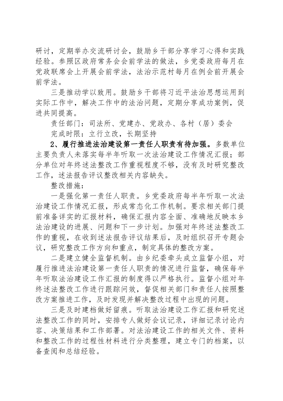 XX乡关于全面依法治市重点工作专项督察反馈问题的整改工作方案根据《市依法治市办关于印发《全面依法治市重点工作专项督察的情况通报》的通知》(X〔2025〕X号),按照区委依法治区办要求,为扎实做好全面依法治市重点工作专项督察反馈问题的整改工作,结合X乡工作实际,围绕4个重点方面,对照存在问题开展自查自纠,制定如下整改工作方案。一、指导思想以习近平新时代中国特色社会主义思想为指导,深入学习贯彻习近平法治思想,切实提高政治站位,增强“四个意识”、坚定“四个自信”、做到“两个维护”,充分认识全面依法治市重点工作专项督察反馈问题整改工作的严肃性和重要性,扛牢政治责任,坚持问题导向,主动认领,举一反三,高标准、高质量推进整改工作,全面提高全乡干部运用法治思维和法治方式推进依法行政的能力,着力构建职能科学、权责法定、执法严明、公开公正、廉洁高效、守法诚信的法治政府。二、整改内容(一)法治建设责任还需进一步压实1、学习习近平法治思想实效性还不强。学习形式比较单一,较少采用个人自学、交流研讨、专题辅导等方式开展学习。整改措施:一是加强组织领导。成立X乡法治建设工作领导小组,由乡党委书记担任组长,明确各成员在推进学习习近平法治思想方面的职责,加强对学习活动的统筹协调和指导监督。二是丰富学习形式。强化个人自学,为乡干部提供书籍、文章、视频等多种形式的习近平法治思想学习资料。组织交流研讨,定期举办交流研讨会,鼓励乡干部分享学习心得和实践经验。参照区政府常务会会前学法的做法,乡党委政府每月在党政联席会上开展会前学法,法治示范村每月在例会前开展会前学法。三是推动学以致用。鼓励乡干部将习近平法治思想运用到实际工作中,解决工作中的法治问题,定期分享成功案例,促进共同提高。责任部门:司法所、党建办、党政办、各村(居)委会完成时限:立行立改,长期坚持2、履行推进法治建设第一责任人职责有待加强。多数单位主要负责人未落实每半年听取一次法治建设工作情况汇报;部分单位对年终述法整改工作重视程度不够,没有及时研究整改工作,述法报告评议整改相关内容缺失。整改措施:一是强化第一责任人职责。乡党委政府每半年听取一次法治建设工作情况汇报,形成常态化工作机制。要求相关部门提前准备详实的汇报材料,确保汇报内容全面、准确地反映本乡法治建设的进展、问题和下一步计划。加强对年终述法整改工作的重视,在收到述法报告评议结果后,及时组织召开专题会议,研究整改工作方向和重点,制定具体的整改方案。二是建立健全监督机制。由乡纪委牵头成立监督小组,对履行推进法治建设第一责任人职责的情况进行监督,确保每半年听取法治建设工作汇报的制度得以严格执行。监督小组对年终述法整改工作进行跟踪问效,督促相关部门和责任人按照整改方案推进工作,及时发现并解决整改过程中出现的问题。三是及时建档做好留痕。听取法治建设工作汇报和研究述法整改工作的同时,安排专人做好会议记录,详细记录讨论内容、决策结果和工作部署。对法治建设工作的相关文件、资料和整改工作的过程性材料进行分类整理,建立专门的档案,以备查阅和总结经验。责任部门:司法所、党政办完成时限:立行立改、长期坚持(二)依法行政水平还需进一步提高1、行政规范性文件备案、合法性审查不规范。多数执法单位法制审核人员没有达到执法人员总数5%的要求,有的未取得法律职业资格、不符合法制审核人员资质。整改措施:一是深入学习贯彻《X省行政合法性审查工作规定》。进一步规范行政规范性文件审查、报备程序,确保审查资料完整,做到不漏备、不迟备。二是进一步加强法制审核队伍建设。采取招录、调岗等方式,把具有法律职业资格的人员配备到法制审核岗位,专门或者兼职从事法制审核工作。责任部门:司法所、党政办完成时限:立行立改、长期坚持2、执行行政复议与应诉制度要求不到位。大部分单位行政复议、行政应诉案件登记不规范,案卷归档不齐全;部分单位在“一升两降”方案印发后,一审中未充分研判败诉风险,致使案件败诉;部分单位未按照“一升两降”方案收到法院应诉文书、判决书后向属地司法行政部门...