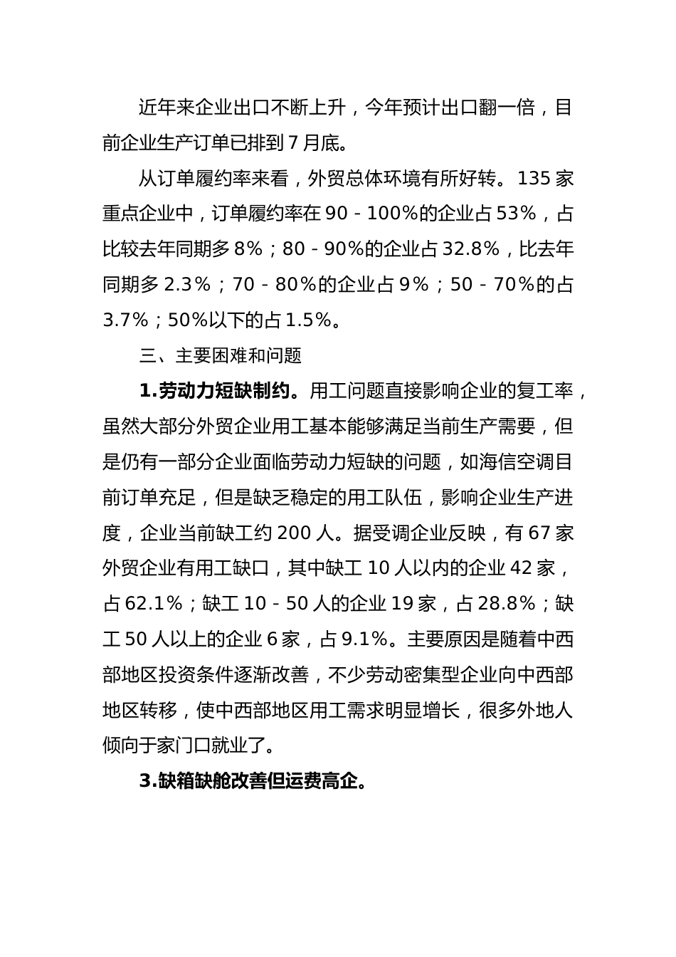关于春节后外贸企业开复工及运行情况的调查报告自2月9日以来,XX县贸促会由主要领导和分管领导分别带队,分两组走访重点外贸企业,同时对135家骨干外贸企业进行问卷调查,了解企业节后开复工及运行情况现就有关情况汇报如下:一、企业开复工情况从问卷调研情况看,有XXX、XX等6家企业为了及时完成节前订单并交货,春节未停工;在129家停产企业中,正月初八前复工企业占比39%,正月初十该比例上升至72%,正月十五则达到82%。从行业看,机电、化工、地板等行业普遍复工较早,纺织行业受下游染厂复工晚影响约70%的纺织企业在正月十五后才真正复工复产。二、当前企业订单情况从在手订单看,骨干企业订单相对充足。135家调研企业当前在手订单合计2.7亿美元,其中XX、XX等外贸骨干企业的在手订单均在1000万美元以上。从订单类型看,以短单、小单为主。有74.6%(比去年同期增加约5%)的企业反映订单可维持正常生产时间在2个月以内,主要集中在纺织面料行业。可维持正常生产在3个月以上的企业占比10.5%,主要集中在汽配、机电以及个别纺织企业。如凯迪汽配反映客户前两年受疫情影响一直在消化库存,今年以来开始大量下单,企业目前生产订单排到6月份。锦诗纺织由于产能扩大,同时不断扩大中东市场,近年来企业出口不断上升,今年预计出口翻一倍,目前企业生产订单已排到7月底。从订单履约率来看,外贸总体环境有所好转。135家重点企业中,订单履约率在90-100%的企业占53%,占比较去年同期多8%;80-90%的企业占32.8%,比去年同期多2.3%;70-80%的企业占9%;50-70%的占3.7%;50%以下的占1.5%。三、主要困难和问题1.劳动力短缺制约。用工问题直接影响企业的复工率,虽然大部分外贸企业用工基本能够满足当前生产需要,但是仍有一部分企业面临劳动力短缺的问题,如海信空调目前订单充足,但是缺乏稳定的用工队伍,影响企业生产进度,企业当前缺工约200人。据受调企业反映,有67家外贸企业有用工缺口,其中缺工10人以内的企业42家,占62.1%;缺工10-50人的企业19家,占28.8%;缺工50人以上的企业6家,占9.1%。主要原因是随着中西部地区投资条件逐渐改善,不少劳动密集型企业向中西部地区转移,使中西部地区用工需求明显增长,很多外地人倾向于家门口就业了。3.缺箱缺舱改善但运费高企。企业普遍反映节后集装箱缺箱、缺舱情况有所改善,主要原因是年后很多外贸企业还在逐步复工复产中,总需求量不高有关。在受调的135家企业中,有125家企业表示节后刚复工,还没有缺箱情况。10家有缺箱需求的企业中,需要5个集装箱以下的企业有6家;5-20个的有3家。元森态的集装箱需求量最大,需要50个。在受调的135家企业中,有126家企业表示目前没有缺舱情况。9家有缺舱情况的企业中,缺5个舱位以下的最多,有7家;5-10个的有2家,其中帅宁衬布缺舱最多,缺舱位10个。疫情引发的集装箱供需严重失衡,外贸企业不仅缺箱、缺舱,海运费不断上涨,直接增加企业成本。如金三发反映正常年份下,去往美国的40英尺集装箱海运费价格在5000美元左右,而当前这一价格已飙升至15000美元左右,虽然比去年底有所回落,但价格仍上涨3倍,造成企业物流成本明显上升。4.欧美国家开放可能影响企业后期出口。在调研中,部分外贸企业反映近两年受疫情影响,虽然也参加了网上展会和境内线下展会,但效果没有出国参展和拜访客户明显,接洽的新客户很少,主要还是做老客户生意。随着新冠疫苗的广泛接种,欧美部分国家已经放开管控,人员流动加强,境外实体展会逐步恢复。而我国目前执行严格的疫情管控措施,出入境受限,后期可能会出现企业无法出国参展而失去部分客户和订单的情况。5.外部形势复杂多变。基于目前奥密克戎等变异株在全球的传播和各国的疫情管控措施,兰州大学《新冠肺炎疫情全球预测系统》的最新预测结果显示,目前全球疫情虽总体呈下降趋势,在多种复杂因素的影响下,全球疫情或将于2023年底平息,外贸人员出国参展、拜访客户等可能于明年才能恢复正常。同时,俄乌战争、美元加息、中美经贸摩擦等不确定因素将进一步影响XX县外贸出口。四、一季度出口预测情况从调研情况看,由于今年春节比...