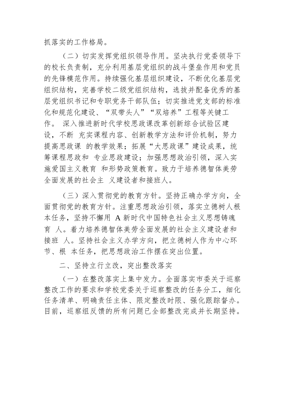 在巡察整改专题民主生活会上的总结发言各位领导、同志们:根据市委统一部署和学校党委工作安排,今天我们在这里召开巡察整改专题民主生活会。刚才,大家围绕本次民主生活会主题,结合自身思想和分管工作实际,认真开展批评与自我批评,既坦诚相见、直面问题,又主动认领、深挖根源,达到了“团结—批评—团结”的目的。在此,我代表学校党委对班子成员和党员干部提出的批评意见表示衷心的感谢!下面,我结合分管工作实际,就落实好本次民主生活会各项整改任务,谈几点体会。一、深化思想认识,增强政治自觉(一)始终坚持党对教育工作的全面领导。坚持社会主义办学方向,把党的领导贯穿教育工作全过程各方面,是办好中国特色社会主义大学的根本保证。学校党委将深入学习贯彻党的二十届三中全会精神和A总书记关于教育工作的重要指示,坚决贯彻落实党中央决策部署及省委、市委工作要求,牢牢把握正确的办学方向,坚定不移推进全面从严治党向纵深发展。加强党对教育工作的全面领导,充分发挥党委总揽全局、协调各方的作用,切实履行管党治党主体责任、第一责任人责任和“一岗双责”,努力营造风清气正的政治生态。坚决扛起“第一责任人”职责,带头严于律己、严负其责、严管所辖,层层传导压力,推动形成一级抓一级、层层抓落实的工作格局。(二)切实发挥党组织领导作用。坚决执行党委领导下的校长负责制,充分利用基层党组织的战斗堡垒作用和党员的先锋模范作用。持续强化基层组织建设,不断优化基层党组织结构,完善学校二级党组织结构,选拔并配备优秀的基层党组织书记和专职党务干部队伍;切实推进党支部的标准化和规范化建设、“双带头人”“双培养”工程等关键工作。深入推进新时代学校思政课改革创新综合试验区建设,不断充实课程内容、创新教学方法和评价机制,努力提高思政课的教学效果;拓展“大思政课”建设成果,统筹课程思政和专业思政建设;加强思想政治引领,深入实施爱国主义教育和形势政策教育。致力于培养德智体美劳全面发展的社会主义建设者和接班人。(三)深入贯彻党的教育方针。坚持正确办学方向,全面贯彻党的教育方针。注重思想政治引领,落实立德树人根本任务,坚持不懈用A新时代中国特色社会主义思想铸魂育人。着力培养德智体美劳全面发展的社会主义建设者和接班人。坚持社会主义办学方向,把立德树人作为中心环节、根本任务,把思想政治工作摆在突出位置。二、坚持立行立改,突出整改落实(一)在整改落实上集中发力。全面落实市委关于巡察整改工作的要求和学校党委关于巡察整改的任务分工,细化任务清单、明确责任主体、限定整改时限、强化跟踪督办。目前,巡察组反馈的所有问题已全部整改完成并长期坚持。同时举一反三解决新发现的问题。针对巡察反馈意见中指出的“人才队伍建设有待加强”的问题,学校党委高度重视人才队伍建设工作,制定出台了《学院“十四五”人才发展规划》《学院高层次人才引进办法(试行)》等制度文件;积极争取国家和地方各类项目支持计划300余项;通过引才引智等方式柔性引进高层次人才10余名;设立“青年教师成长基金”等专项经费XX余万元;大力实施“人才强校战略”,不断激发教职工干事创业热情。(二)在成果转化上协同发力。把巡察整改与推进“双一流”建设相结合,进一步优化学科专业结构布局;把巡察整改与深化全面从严治党相结合,进一步加强党风廉政建设和反腐败斗争;把巡察整改与加强党的基层组织建设相结合,进一步加强基层党组织建设。学校党委将继续按照“边查边改、即知即改、真抓实干、务求实效”的原则,进一步健全完善制度机制,扎紧织密制度笼子;进一步强化领导班子建设和干部队伍建设;进一步持续深入推进党风廉政建设和反腐败斗争;进一步巩固提升巡察整改成果。三、以民主生活会为新起点,开创学校发展新局面(一)坚定不移推进全面从严治党。严明政治纪律和政治规矩,严肃党内政治生活。严格落实意识形态工作责任制,加强阵地建设和管理,牢牢掌握意识形态领域主导权话语权。层层压实全面从严治党主体责任和监督责任,推动全面从严治党向纵深发展。(二)推动学校事业高质量发展。深入学习宣传贯彻党的二...