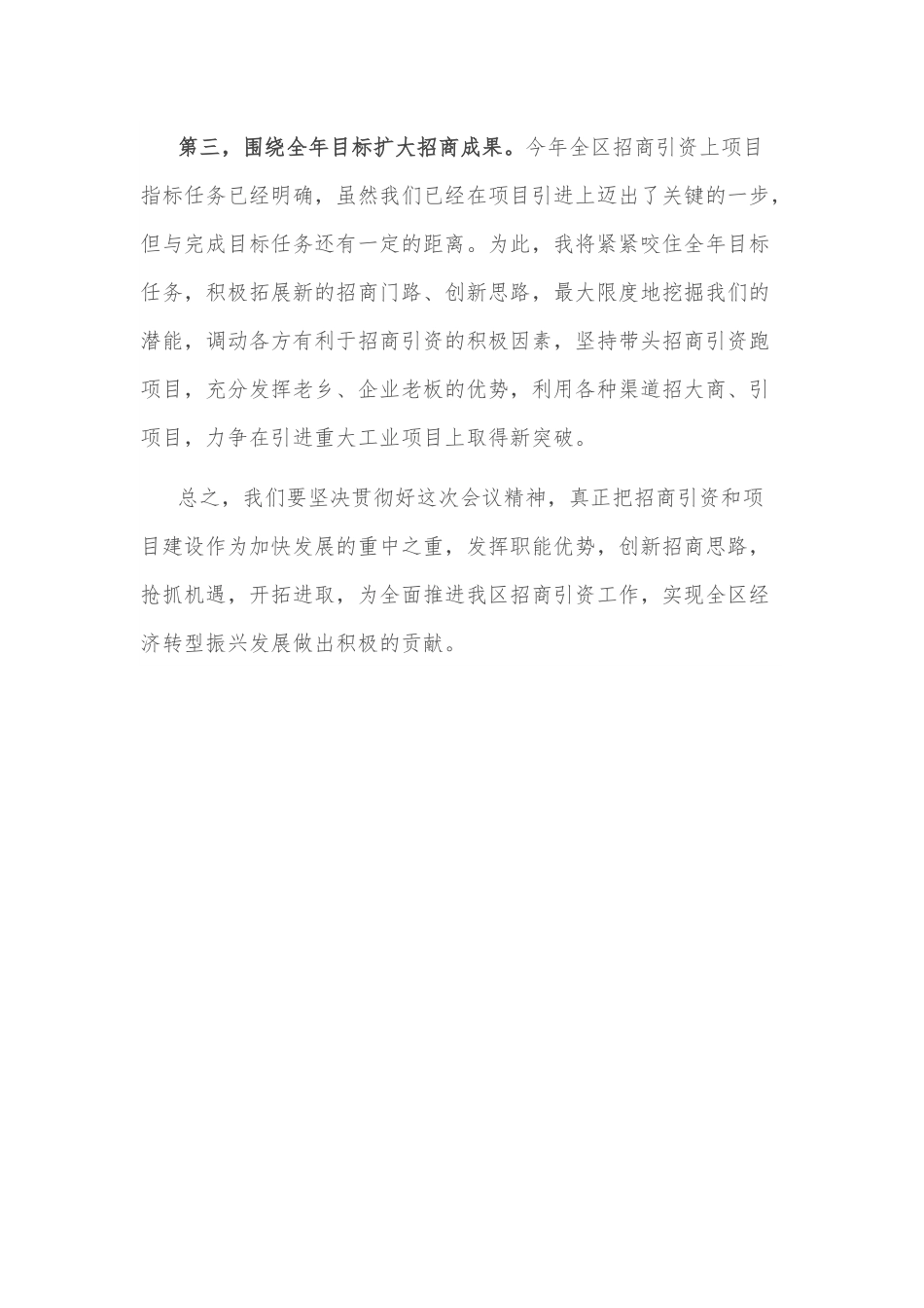 在招商引资工作会议上的表态发言各位领导,同志们:今天,区委、区政府召开招商引资培训推进会议,既是对招商引资工作的再部署,也是对项目建设攻坚战的再动员。审计局作为综合经济管理部门,我们认真贯彻落实全区招商引资工作要求,联系了贵州电力建筑公司来我区投资铁山乡风电场项目,江苏省宁波市企业来我区设立总部经济。为促进项目落地,扩大招商引资成果,我们将从三个方面努力工作。第一,盯紧洽谈项目推进落地建设。对正在联系洽谈的产业项目,我们将加强联络,紧盯不放,力争项目实现落户签约。近期,将邀请投资方代表到我区实地考察,充分讲解和对接我市招商引资优惠政策,实行项目手续的全程代理制度,以诚信、务实、高效、优质的服务取信于企业,以一丝不苟、无可挑剔的服务吸引外商,确保每一个项目都能“引得进,留得住。”第二,努力练好内功选准招商突破口。借助全区招商引资业务培训的契机,深入学习我市招商引资优惠政策,特别是充分理解“一事一议”的含义,熟悉掌握区域的资源禀赋、产业基础等各方面招商条件,做足功课,有的放矢,紧紧盯住上海、深圳等南方发达地区的产业转移,盯住外资企业,注重引进项目的投资总量、科技含量、纳税数量和就业容量,努力实现招商引资在高起点上的新跨越。第三,围绕全年目标扩大招商成果。今年全区招商引资上项目指标任务已经明确,虽然我们已经在项目引进上迈出了关键的一步,但与完成目标任务还有一定的距离。为此,我将紧紧咬住全年目标任务,积极拓展新的招商门路、创新思路,最大限度地挖掘我们的潜能,调动各方有利于招商引资的积极因素,坚持带头招商引资跑项目,充分发挥老乡、企业老板的优势,利用各种渠道招大商、引项目,力争在引进重大工业项目上取得新突破。总之,我们要坚决贯彻好这次会议精神,真正把招商引资和项目建设作为加快发展的重中之重,发挥职能优势,创新招商思路,抢抓机遇,开拓进取,为全面推进我区招商引资工作,实现全区经济转型振兴发展做出积极的贡献。