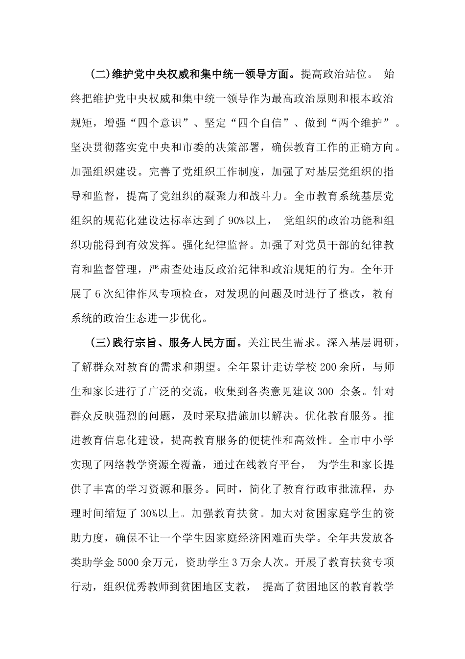 市教育局党委副书记、市总工会党组书记2025年对照“四个带头”含上年度整改、个人事项、典型事例剖析检视发言材料2篇文市教育局党委副书记2025年“四个带头”个人对照检查发言材料(上年度整改+个人事项+典型事例剖析)根据上级关于开展2024年度民主生活会的相关要求,我紧扣本次专题民主生活会主题,聚焦“四个带头”总体要求,坚持问题导向,认真学习研讨,开展谈心谈话,深入查摆和梳理自身存在的问题,深刻剖析原因,并提出整改方案,落实整改措施。现对照检查如下。一、上年度民主生活会整改落实情况(一)学习贯彻习近平新时代中国特色社会主义思想方面。注重学以致用。积极将理论学习成果转化为工作实践,指导教育改革发展工作。例如,在推动教育公平方面,借鉴新发展理念,制定了一系列政策措施,促进了城乡教育资源的均衡配置,全市义务教育阶段学校的城乡差距缩小了15%左右。强化交流研讨。组织开展了10余次专题研讨活动,与班子成员和党员干部深入交流学习心得,共同探讨教育领域的热点难点问题。通过交流研讨,拓宽了工作思路,提高了解决实际问题的能力。(二)维护党中央权威和集中统一领导方面。提高政治站位。始终把维护党中央权威和集中统一领导作为最高政治原则和根本政治规矩,增强“四个意识”、坚定“四个自信”、做到“两个维护”。坚决贯彻落实党中央和市委的决策部署,确保教育工作的正确方向。加强组织建设。完善了党组织工作制度,加强了对基层党组织的指导和监督,提高了党组织的凝聚力和战斗力。全市教育系统基层党组织的规范化建设达标率达到了90%以上,党组织的政治功能和组织功能得到有效发挥。强化纪律监督。加强了对党员干部的纪律教育和监督管理,严肃查处违反政治纪律和政治规矩的行为。全年开展了6次纪律作风专项检查,对发现的问题及时进行了整改,教育系统的政治生态进一步优化。(三)践行宗旨、服务人民方面。关注民生需求。深入基层调研,了解群众对教育的需求和期望。全年累计走访学校200余所,与师生和家长进行了广泛的交流,收集到各类意见建议300余条。针对群众反映强烈的问题,及时采取措施加以解决。优化教育服务。推进教育信息化建设,提高教育服务的便捷性和高效性。全市中小学实现了网络教学资源全覆盖,通过在线教育平台,为学生和家长提供了丰富的学习资源和服务。同时,简化了教育行政审批流程,办理时间缩短了30%以上。加强教育扶贫。加大对贫困家庭学生的资助力度,确保不让一个学生因家庭经济困难而失学。全年共发放各类助学金5000余万元,资助学生3万余人次。开展了教育扶贫专项行动,组织优秀教师到贫困地区支教,提高了贫困地区的教育教学质量。(四)求真务实、狠抓落实方面。完善工作机制。建立了工作台账和跟踪督办制度,对重点工作和重大项目进行全程跟踪,确保各项工作落到实处。全年共梳理重点工作100余项,明确了责任人和时间节点,按时完成率达到了95%以上。加强调查研究。深入开展教育领域的调研工作,形成了一批有价值的调研报告。例如,在推进普通高中教育多样化发展方面,通过调研提出了一系列针对性的建议,得到了市委市政府的高度重视,相关政策措施正在逐步实施。强化工作考核。完善了教育工作考核评价体系,加大了对工作落实情况的考核权重。通过考核,激励了广大干部教师的工作积极性和主动性,推动了教育工作的高质量发展。(五)以身作则、廉洁自律方面。加强廉洁教育。定期组织开展廉洁自律教育活动,学习党纪国法和廉洁自律各项规定,提高自身的廉洁意识。全年参加各类廉洁教育活动12次,撰写心得体会6篇。严格遵守规定。自觉遵守中央八项规定及其实施细则精神,坚决反对“四风”。严格执行廉洁自律各项规定,没有利用职务之便谋取私利的行为。在公务接待、公务用车等方面,严格按照规定标准执行。强化监督管理。加强对身边工作人员和家属的教育和管理,防止出现违规违纪行为。同时,积极支持纪检监察工作,配合查处教育领域的腐败问题,维护了教育系统的清正廉洁。(六)履行全面从严治党政治责任方面。落实主体责任。认真履行党委副书记的职责,协助党委书记抓好全面从严治党工作。制定了全面从严治党责任清...