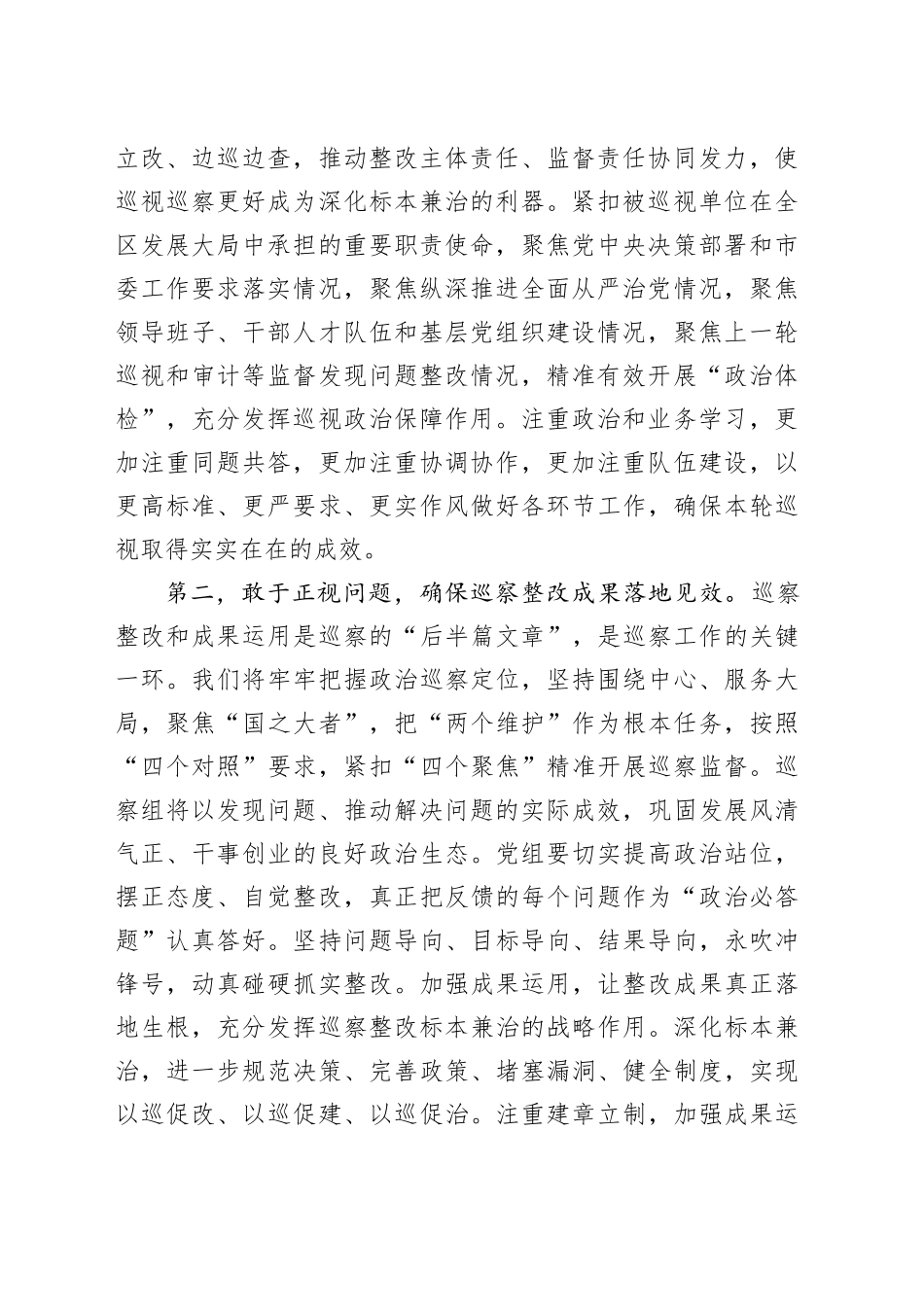 巡察组在巡察工作动员会上的讲话提纲同志们:根据区委巡察工作的统一安排,巡察组将对党组开展巡察今天组织召开动员会,主要目的就是对巡察相关工作进行安排部署,同时做好全面动员,共同完成好本次巡察任务。开展巡察是区委部署的重大政治任务,是贯彻落实习近平总书记重要讲话精神的具体行动,是践行“两个维护”的直接体现。刚才,巡察组副组长宣读了巡察通知,党组要提高政治站位,强化政治担当,深刻认识开展巡察的重大政治意义和实践意义,恪守党性原则,切实增强配合做好巡察工作的思想自觉、政治自觉和行动自觉,共同完成好区委交办的政治任务。下面,就开展好本次巡察,我强调三点意见:第一,统一思想认识,准确把握开展巡察工作的重大意义接受巡察监督不仅是一次政治体检,更是一次推动自我革命、实现治理效能跃升的宝贵契机,把自觉接受巡察监督检查作为坚定拥护“两个确立”、做到“两个维护”的实际行动。巡察组将坚持政治巡视巡察定位,把严明党的政治纪律和政治规矩贯穿巡视工作全过程,坚持围绕中心、服务大局,突出“两个维护”深化政治监督。坚持把发现问题作为巡视巡察的主要任务,善于发现真问题、新问题和大的问题,善于发现“一把手”的问题,善于发现共性问题,把巡视巡察利剑磨得更光更亮。坚持把解决问题作为巡视巡察的落脚点,进一步强化立行立改、边巡边查,推动整改主体责任、监督责任协同发力,使巡视巡察更好成为深化标本兼治的利器。紧扣被巡视单位在全区发展大局中承担的重要职责使命,聚焦党中央决策部署和市委工作要求落实情况,聚焦纵深推进全面从严治党情况,聚焦领导班子、干部人才队伍和基层党组织建设情况,聚焦上一轮巡视和审计等监督发现问题整改情况,精准有效开展“政治体检”,充分发挥巡视政治保障作用。注重政治和业务学习,更加注重同题共答,更加注重协调协作,更加注重队伍建设,以更高标准、更严要求、更实作风做好各环节工作,确保本轮巡视取得实实在在的成效。第二,敢于正视问题,确保巡察整改成果落地见效。巡察整改和成果运用是巡察的“后半篇文章”,是巡察工作的关键一环。我们将牢牢把握政治巡察定位,坚持围绕中心、服务大局,聚焦“国之大者”,把“两个维护”作为根本任务,按照“四个对照”要求,紧扣“四个聚焦”精准开展巡察监督。巡察组将以发现问题、推动解决问题的实际成效,巩固发展风清气正、干事创业的良好政治生态。党组要切实提高政治站位,摆正态度、自觉整改,真正把反馈的每个问题作为“政治必答题”认真答好。坚持问题导向、目标导向、结果导向,永吹冲锋号,动真碰硬抓实整改。加强成果运用,让整改成果真正落地生根,充分发挥巡察整改标本兼治的战略作用。深化标本兼治,进一步规范决策、完善政策、堵塞漏洞、健全制度,实现以巡促改、以巡促建、以巡促治。注重建章立制,加强成果运用,在更大范围、更深层次上查找影响制约单位发展的突出问题,以务求实效的决心,推动各项工作实现新提升。深入落实“发现问题、形成震慑,推动改革、促进发展”的工作方针,推进党建工作和业务工作深度融合,以高质量巡察整改推动高质量发展。坚持从严管理监督和鼓励担当作为相统一,引导广大干部在遵规守纪的前提下放手干事、积极作为。第三,强化政治担当,全力支持配合巡察工作,共同完成好巡察任务。做好巡察工作,是巡察组和被巡察党组织共同的政治责任。要坚决支持配合巡察工作,把接受巡察监督作为一次“政治体检”,通过自觉接受监督、主动配合监督、强化自我监督,检视政治偏差,剖析思想根源,落实工作责任,解决突出问题。畅通巡察信访举报渠道,在区主要新闻媒体发布巡察公告,公布巡察任务、举报电话等,欢迎广大干部群众向巡察组反映和提供情况。加强对巡察组的监督,希望大家对巡察工作给予支持和监督,促进严明纪律、改进作风,使巡察工作经得起实践、人民和历史的检验。此次巡察是对局领导班子的一次“政治体检”,也是对全局政治、思想、组织、作风、廉政等方面情况的一次“全面检阅”。要坚决拥护巡察工作,切实把思想和行动统一到区委的部署要求上来,准确把握巡察工作的具体要求和监督重点,...