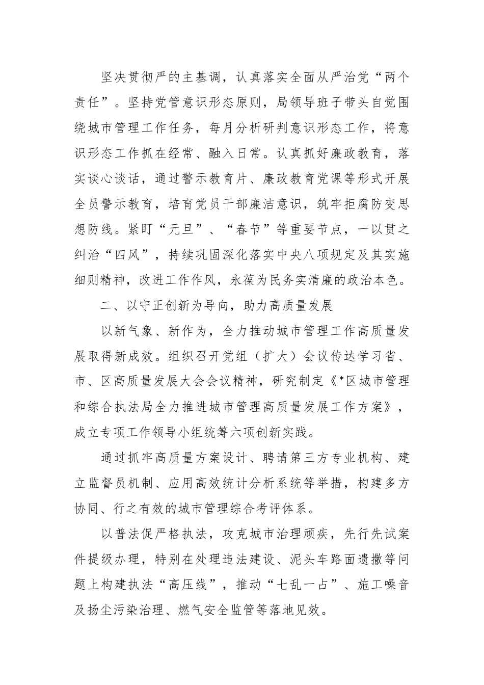 2023年局机关一季度转作风提效能工作总结*区城市管理和综合执法局紧扣“产业第一、交通提升、城市跨越、民生为要”的工作总抓手,坚持从群众需求和城市治理突出问题出发,进一步解放思想,强化担当,锤炼作风,着力推动*区城市管理工作高质量发展。现将第一季度工作情况总结如下:一、以落实“两个维护”为根本,强化政治建设坚持以党的创新理论武装头脑,认真落实“第一议题”制度,及时跟进学习贯彻习近平总书记最新重要讲话和重要指示批示精神以及党的创新理论。教育引导全体党员干部不断提高政治站位,把忠诚拥护“两个确立”、坚决做到“两个维护”作为根本政治责任贯穿城市管理工作的各方面各环节全过程。局党组带头认真履行“一岗双责”,年初认真部署党建工作,推动党建和业务深度融合第一季度以来组织局党组会议、中心组学习会、支部“三会一课”深入学习党的二十大精神*次,开展宣讲学习活动*场。持续巩固推进党支部标准化规范化建设,严肃党内政治生活,推动“三会一课”、组织生活会、民主评议党员等组织生活经常化、规范化。坚决贯彻严的主基调,认真落实全面从严治党“两个责任”。坚持党管意识形态原则,局领导班子带头自觉围绕城市管理工作任务,每月分析研判意识形态工作,将意识形态工作抓在经常、融入日常。认真抓好廉政教育,落实谈心谈话,通过警示教育片、廉政教育党课等形式开展全员警示教育,培育党员干部廉洁意识,筑牢拒腐防变思想防线。紧盯“元旦”、“春节”等重要节点,一以贯之纠治“四风”,持续巩固深化落实中央八项规定及其实施细则精神,改进工作作风,永葆为民务实清廉的政治本色。二、以守正创新为导向,助力高质量发展以新气象、新作为,全力推动城市管理工作高质量发展取得新成效。组织召开党组(扩大)会议传达学习省、市、区高质量发展大会会议精神,研究制定《*区城市管理和综合执法局全力推进城市管理高质量发展工作方案》,成立专项工作领导小组统筹六项创新实践。通过抓牢高质量方案设计、聘请第三方专业机构、建立监督员机制、应用高效统计分析系统等举措,构建多方协同、行之有效的城市管理综合考评体系。以普法促严格执法,攻克城市治理顽疾,先行先试案件提级办理,特别在处理违法建设、泥头车路面遗撒等问题上构建执法“高压线”,推动“七乱一占”、施工噪音及扬尘污染治理、燃气安全监管等落地见效。以文明城市创建“里子”工程专项整治行动为抓手,以迎接国家卫生城镇复审为契机,实施背街小巷提升、沿街商铺规范管理、环境卫生精细管理,完成*条主次干道、*条背街小巷、*个市政公厕、*个转运站的深度清洁任务,处理黑点死角*处,组建超*人的环卫应急队伍,加强市容环境快速动态管理。以*区城市综合管理为抓手,综合运用*G、物联网、大数据、人工智能等新技术,构建*区城市运行管理服务一体化平台,打造感知、分析、服务、指挥、监察“五位一体”的城市综合管理系统。完成*区城市综合管理平台一期方案设计、可行性研究报告编制及项目估算,拟于*月完成立项工作。三、以坚守人民立场为主线,深化作风建设坚持在转变工作作风中锤炼党性,增强服务意识,践行奉献精神。常态化开展在职党员“双报到”工作,经常性组织党员干部开展党员志愿服务活动,深化为民服务意识,局支部党员志愿服务每月不少于*小时。办好惠民实事,加强精致精细管理养护,打造春节花卉景点*处,推进*个区属管养公园无障碍设施提升改造,优化宠物公园游乐品质,落实城市绿地普查工作。规范共享单车管理,增划停车位*个,优化道路标志牌*块,有序开展路灯防雷检测,完成瓶装液化石油气撬装移动式三级站选址*处。完成*处城市服务驿站图纸初步设计。持续推动区级再生资源中心、垃圾分类宣教中心运营拓宽便民服务渠道,完善大件垃圾上门回收平台功能,着力解决搬运难、丢弃难等问题。推进*座生活垃圾中转站升级改造、*座建筑垃圾受纳场选址建设,航空新城厨余垃圾分类收运服务实施以来,厨余垃圾分出率提升至*%。优化业务办理流程,提高审批效率,大力服务经济工作、服务企业和群众。第一季度以来,共办理各项业务审批事项*件,其中户外广告设施设置核准*件,砍...