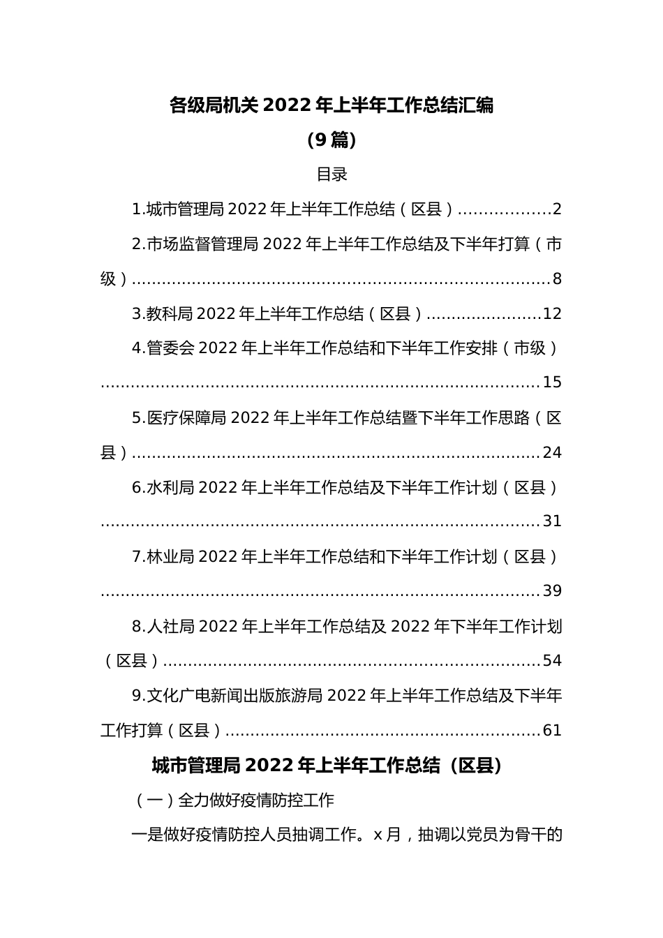 各级局机关2022年上半年工作总结汇编(9篇)目录1.城市管理局2022年上半年工作总结(区县)..................22.市场监督管理局2022年上半年工作总结及下半年打算(市级)...................................................................................83.教科局2022年上半年工作总结(区县).......................124.管委会2022年上半年工作总结和下半年工作安排(市级)........................................................................................155.医疗保障局2022年上半年工作总结暨下半年工作思路(区县)..................................................................................246.水利局2022年上半年工作总结及下半年工作计划(区县)........................................................................................317.林业局2022年上半年工作总结和下半年工作计划(区县)........................................................................................398.人社局2022年上半年工作总结及2022年下半年工作计划(区县)...........................................................................549.文化广电新闻出版旅游局2022年上半年工作总结及下半年工作打算(区县)...............................................................61城市管理局2022年上半年工作总结(区县)(一)全力做好疫情防控工作一是做好疫情防控人员抽调工作。x月,抽调以党员为骨干的xx人疫情防控先锋队,逆行而上,驰援xx乡疫情防控。抽调xx名执法队员深入社区一线协助社区摸排返五人员。抽调xx人奔赴全县x个交通监测点防疫执勤,对过往车辆逐一排查。抽调x人援助xx方舱医院管理。二是做好城区环境消杀工作。及时清扫街道、清运垃圾,生活垃圾中转站及清运车辆实行每天消毒,公厕、垃圾桶、果壳箱、城市家具实行每天x次以上消毒,最大程度降低病毒通过公共设施传播的可能。(二)全力推进重点工作及目标任务落实落地1.推进县城区内生活垃圾分类处理。一是积极开展垃圾分类宣传工作。共发放《xx省城市生活垃圾分类管理条例》《xx市城市生活垃圾管理条例》xxx多份、生活垃圾分类小知识宣传单页xxxx多份。二是开展生活垃圾分类试点工作。在xx、xx、xx个居民小区引导居民进行垃圾分类投放。建设生活垃圾分类设施x座、搭建数据统计平台x套、建设生活垃圾分类宣传站x座,均已投入运营。2.谋划建设城市智慧停车场。智慧停车场建设项目经前期项目可行性分析、调研,拟选定xx广场进行地下智慧停车场建设,占地面积xxxxx㎡,其中地下停车场建设面积xxxxx㎡,共建设停车位xxx个,同时对广场地面进行停车位配套设施改造,预计投入资金xxxx万元,项目已提交至县政府审议,待批准后及时进行招标开工建设。3.加强数字城市建设,实施移动通讯网络5G升级工程。今年以来,我局积极推进数字城管信息系统智慧化升级,积极推进数字城管信息系统嵌入垃圾分类运行监管、智慧公厕运行监管、门前三包监管、城市管理执法办案远程管理、城区监控设备监管、渣土车及执法车GPS监管、油烟噪声预警监管等,着力构筑数字城市建设,目前项目可行性方案已提交县政府审议,待批准后实施。4.有效整合公安部门、数字城管和社会视频资源,建立数字化治安防控管理体系。一是充分发挥数字化城市管理视频监控的作用。数字化城市管理中心建立了视频监控电子地图,数字化大厅设置一名坐席员专门负责对监控视频的监视巡查。二是制定数字化城管信息系统智慧化升级方案。完成省市县案件处置系统权限的互联互通,实现数据共享。三是新增监控点位。增加xx菜市场、xx安置区x处视频监控点位,扩大社会治安监管面积,同时将数字城管视频资源接入雪亮工程项目,构筑社会治安防控体系。5.持续推进治违行动。始终保持查违高压态势,严格执行即查即拆制度,“力保违法建设零增长”。重点办理居民小区投诉及新旧小区违建拆除工作。上半年共查处新生违建xx起,拆除违法建设面积xxxx.x平方米,处理信访投诉xx起,拆除居民区乱搭乱建xx处,协助城关镇拆除村居违建xx处,共xxxx...