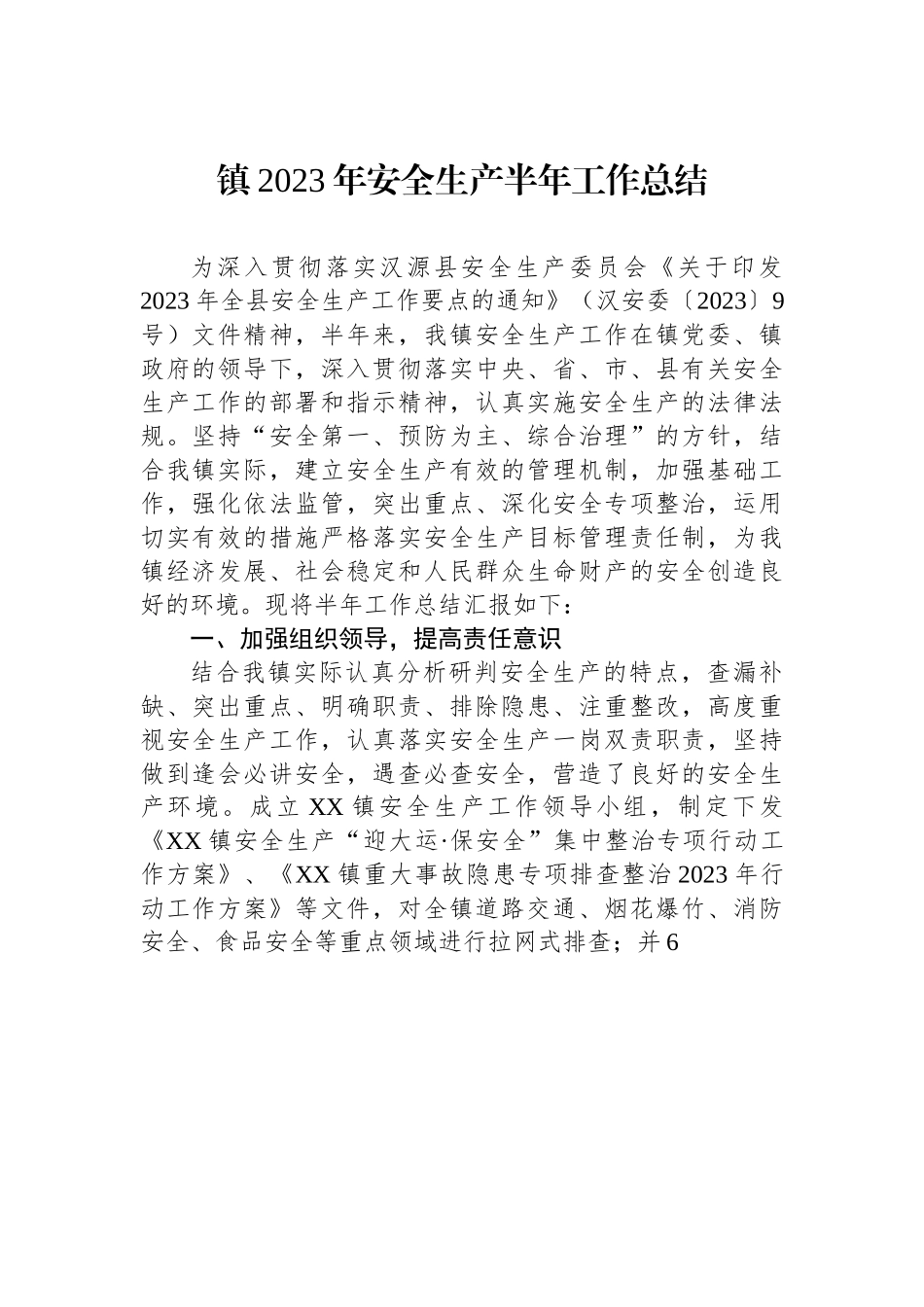 镇2023年安全生产半年工作总结为深入贯彻落实汉源县安全生产委员会《关于印发2023年全县安全生产工作要点的通知》(汉安委〔2023〕9号)文件精神,半年来,我镇安全生产工作在镇党委、镇政府的领导下,深入贯彻落实中央、省、市、县有关安全生产工作的部署和指示精神,认真实施安全生产的法律法规。坚持“安全第一、预防为主、综合治理”的方针,结合我镇实际,建立安全生产有效的管理机制,加强基础工作,强化依法监管,突出重点、深化安全专项整治,运用切实有效的措施严格落实安全生产目标管理责任制,为我镇经济发展、社会稳定和人民群众生命财产的安全创造良好的环境。现将半年工作总结汇报如下:一、加强组织领导,提高责任意识结合我镇实际认真分析研判安全生产的特点,查漏补缺、突出重点、明确职责、排除隐患、注重整改,高度重视安全生产工作,认真落实安全生产一岗双责职责,坚持做到逢会必讲安全,遇查必查安全,营造了良好的安全生产环境。成立XX镇安全生产工作领导小组,制定下发《XX镇安全生产“迎大运·保安全”集中整治专项行动工作方案》、《XX镇重大事故隐患专项排查整治2023年行动工作方案》等文件,对全镇道路交通、烟花爆竹、消防安全、食品安全等重点领域进行拉网式排查;并6次召开支部书记、村主任、驻镇机关单位负责人和建筑工地负责人会议,全面安排部署安全生产工作,要求各村、各单位及时组织人员,召开会议,把安全生产宣传到千家万户,同时认真进行隐患自查,发现隐患的要及吋上报和整改,形成了讲安全、查隐患、保平安的良好氛围。二、围绕重点领域,认真开展检查我镇紧紧围绕道路交通、烟花爆竹、消防安全、食品安全和安全值班等重点领域进行全面排查,坚决遏制重特大事故的发生。(一)道路交通。联合驻镇交警、协管员加大道路交通安全整治,组织镇安办工作人员,采取有力措施,集中对九宜路沿线交通违法违规行为进行检查。扎实开展客运车辆超员、超速、酒后驾驶和农用车违法载人等专项整治活动,截至目前,查处未佩戴安全头盔599起,未系安全带118起,普通客运车客货混装257起,小型普通货车超员6起,摩托车逾期未检验99起;排查道路安全隐患12处,整改完成12处,形成闭环;督促各村召开群众会议,及时进行道路法规、典型案例宣传,提高群众的安全防范意识,从而保持道路交通事故逐年减少的良好态势。(二)烟花爆竹。联合派出所、消防队对辖区内12家烟花爆竹销售点、商超开展6次专项整治,坚决查处无照经营、超范围经营烟花爆竹等违法行为;要求证件齐全的零售经营点实行专柜存放并在库房存放处和放置柜前配备灭火器材;对校园周围的门店进行重点排查,未发现非法经营烟花爆竹的现象。截至目前,排查安全隐患3处,完成整改3处。(三)消防安全。组织开展消防安全培训和疏散救援演练2次,提高防灭火处理能力;联合XX专职消防队、XX派出所在辖区组织村组干部队伍、网格员开展消防安全培训,并入户开展灭火器使用方法以及逃生知识培训4次;严格落实消防安全长效工作机制,加大安全网格化监控力度,坚持每月对天罡老街住户进行入户检查,建立孤寡老人、残疾人等特殊人群一对一帮扶台账;联合XX专职消防队开展消防安全专项整治行动,重点检查天罡村老街、口口辛香食品厂、学校、加油站等重点场所。截至目前,排查消防安全隐患6处,整改完成6处。(四)食品安全。对辖区内7家学校,9家主要餐饮场所和市场进行5次专项检查,主要针对环境卫生、原料进货、餐饮具清洗消毒等方面进行检查,坚决杜绝出现设施设备清理不到位、使用劣质食品、过期食材等行为,严格把好舌尖上的安全关;严格农村集体性聚餐备案程序,宣传误食误饮醇基燃料、亚硝酸盐、有毒野生蘑菇等食品安全常识5次。(五)燃气安全。组织村组干部摸排全镇燃气用户365家,餐馆14家;不定期抽查燃气用户102家,餐馆14家,开展专项检查5次,发现整改隐患8处;加大燃气安全使用宣传力度,宣传内容涉及日常定期维护保养燃气燃具,燃气泄漏检查知识和如何应对燃气泄漏等一系列燃气安全使用常识,通过微信工作群、悬挂横幅、发放宣传资料等多种形式,引导居民如何规范用气,正确使用燃气的操作技巧...