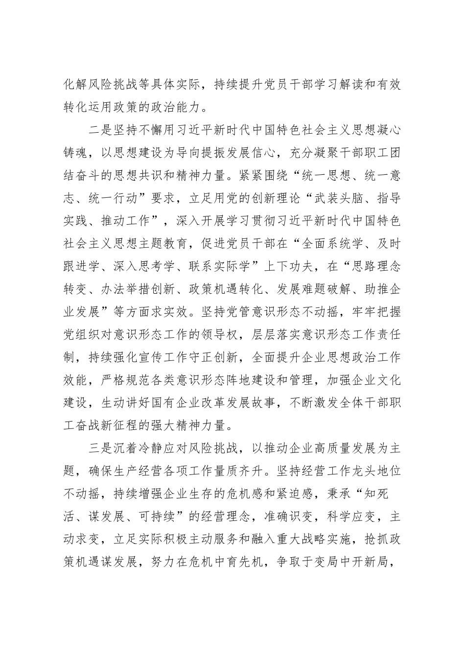 国企以高质量党建凝聚企业发展合力经验材料新形势下,**公司坚持以习近平新时代中国特色社会主义思想为指导,全面学习贯彻落实党的二十大精神、深入推进主题教育,加强党的全面领导,以高质量党建引领保障企业高质量发展为主题,聚焦国有企业改革发展各项任务,强化党建与生产经营“融入融合融通”,团结动员广大党员干部和职工群众踔厉奋发、勇毅前行,把握新形势、抓住新机遇、展现新作为,接续谱写企业稳健可持续高质量发展新篇章。一是坚持党对企业发展的全面领导,持续提高落实各项决策部署的政治站位,确保企业发展保持正确政治方向。坚持把政治建设摆在首位,深刻领悟“两个确立”的决定性意义,严格落实“第一议题”制度,持续提升学习习近平总书记重要讲话和重要指示批示精神的质量,不断提高政治判断力、政治领悟力、政治执行力,教育引导党员干部坚决做到“两个维护”,自觉在政治立场、政治方向、政治原则、政治道路上同以习近平同志为核心的党中央保持高度一致,不折不扣落实各项决策部署和工作要求,确保企业改革发展坚持正确政治方向。立足“全面学习、全面把握、全面落实”,结合党委会、党委理论学习中心组学习、“三会一课”、主题党日等制度和“学习强国”等学习平台,通过党代表宣讲、专题学习研讨、讲专题党课、开展知识竞赛等多种方式,持续把学习宣贯党的二十大精神引向深入,并坚持学以致用,深刻领悟党的二十大做出的各项战略部署,紧密联系企业改革、高质量发展、化解风险挑战等具体实际,持续提升党员干部学习解读和有效转化运用政策的政治能力。二是坚持不懈用习近平新时代中国特色社会主义思想凝心铸魂,以思想建设为导向提振发展信心,充分凝聚干部职工团结奋斗的思想共识和精神力量。紧紧围绕“统一思想、统一意志、统一行动”要求,立足用党的创新理论“武装头脑、指导实践、推动工作”,深入开展学习贯彻习近平新时代中国特色社会主义思想主题教育,促进党员干部在“全面系统学、及时跟进学、深入思考学、联系实际学”上下功夫,在“思路理念转变、办法举措创新、政策机遇转化、发展难题破解、助推企业发展”等方面求实效。坚持党管意识形态不动摇,牢牢把握党组织对意识形态工作的领导权,层层落实意识形态工作责任制,持续强化宣传工作守正创新,全面提升企业思想政治工作效能,严格规范各类意识形态阵地建设和管理,加强企业文化建设,生动讲好国有企业改革发展故事,不断激发全体干部职工奋战新征程的强大精神力量。三是沉着冷静应对风险挑战,以推动企业高质量发展为主题,确保生产经营各项工作量质齐升。坚持经营工作龙头地位不动摇,持续增强企业生存的危机感和紧迫感,秉承“知死活、谋发展、可持续”的经营理念,准确识变,科学应变,主动求变,立足实际积极主动服务和融入重大战略实施,抢抓政策机遇谋发展,努力在危机中育先机,争取于变局中开新局,努力实现经营项目向经营市场转变。树牢安全发展理念,深入学习贯彻习近平总书记关于安全生产重要讲话和重要指示批示精神,持续健全“党政同责、一岗双责、齐抓共管”的全员安全生产责任体系,提升坚守安全红线、促进安全发展的能力,牢固树立“以现场保市场、保订单”理念,增强诚信履约意识,努力打造更多“三优”工程。把资金保障作为头等大事来抓,落实“厉行节约、勤俭办企”要求,管好“钱袋子”,多措并举抓清欠,确保企业资金平稳运行、高效使用。四是以改革创新为支撑,深化三项制度改革,激发企业稳健可持续高质量发展的内生动力。以国企改革深化提升行动以及推进法治建设和合规管理为契机,进一步细化完善议事决策制度和决策管理流程,进一步明确“三会一层”权责边界和功能,促进公司治理机制更加成熟定型,保障发挥党委会“把方向、管大局、保落实”、董事会“定战略、做决策、防风险”、经理层“谋经营、抓落实、强管理”作用。健全完善股权管理体系,规范基层分(子)公司集体议事决策制度建设和执行,推动企业依法合规运营向基层延伸。按照“产品卓越、品牌卓著、创新领先和治理现代”的一流企业标准和卓越绩效管理模式,深入推进对标提升行动,努力打造创新引领下具备...