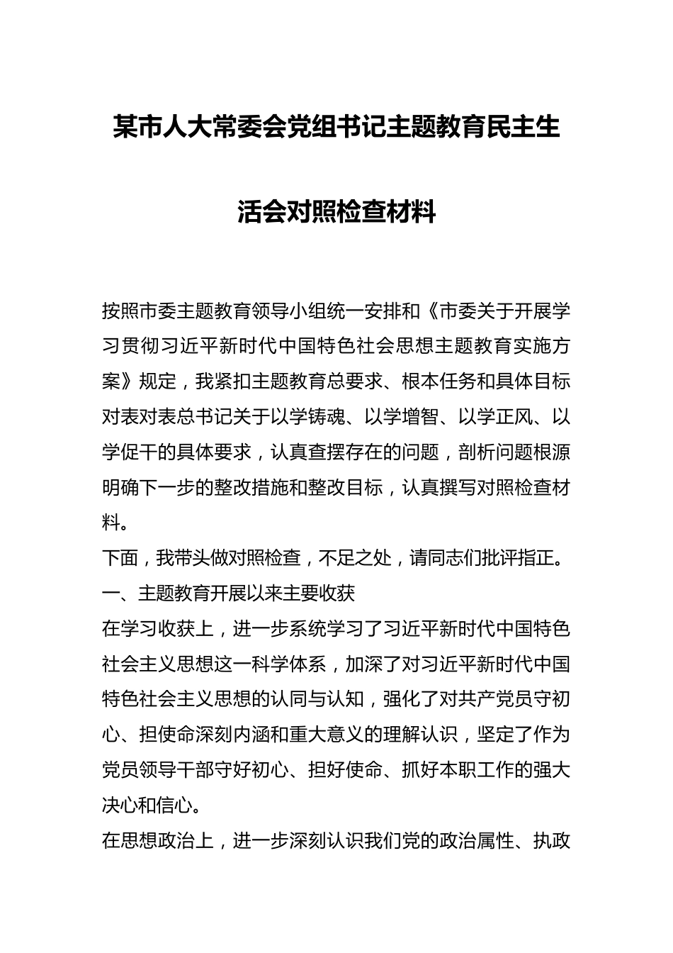 某市人大常委会党组书记主题教育民主生活会对照检查材料按照市委主题教育领导小组统一安排和《市委关于开展学习贯彻习近平新时代中国特色社会思想主题教育实施方案》规定,我紧扣主题教育总要求、根本任务和具体目标对表对表总书记关于以学铸魂、以学增智、以学正风、以学促干的具体要求,认真查摆存在的问题,剖析问题根源明确下一步的整改措施和整改目标,认真撰写对照检查材料。下面,我带头做对照检查,不足之处,请同志们批评指正。一、主题教育开展以来主要收获在学习收获上,进一步系统学习了习近平新时代中国特色社会主义思想这一科学体系,加深了对习近平新时代中国特色社会主义思想的认同与认知,强化了对共产党员守初心、担使命深刻内涵和重大意义的理解认识,坚定了作为党员领导干部守好初心、担好使命、抓好本职工作的强大决心和信心。在思想政治上,进一步深刻认识我们党的政治属性、执政使命和根本宗旨,进一步坚定了政治立场,明确了政治方向,增强了“四个意识”,坚定了“四个自信”,“两个维护”更加牢固,始终在思想上政治上行动上同以习近平同志为核心的党中央保持高度一致的思想自觉、政治自觉和行动自觉。在为民服务上,进一步明确了坚持以人民为中心、矢志不渝艰苦奋斗努力的方向,从思想上压实了推进高质量推进全面从严治党、全面履行党领导干部表率带头作用的政治责任。在班子建设上,进一步增进了班子成员之间的沟通,促进了班子团结,凝聚了“共担使命、携手努力,抓好班子、带好队伍”的强大共识与坚强信心,引导全局广大党员干部形成了为开启新时代新征程奋力谱写改革新篇章而努力奋斗的拳拳合力。二、存在的主要问题(一)理论学习有收获方面我始终坚持把学习贯彻习近平新时代中国特色社会主义思想作为首要政治任务,特别是重点深入学习习近平总书记治边稳藏重要论述、关于坚持和完善人民代表大会制度重要思想及对地方人大工作作出的重要指示。坚持读原著、学原文、悟原理,努力在学懂弄通做实上下功夫,牢固树立“四个意识”、坚定“四个自信”,做到“两个维护”,自觉在思想上政治上行动上同以习近平同志为核心的党中央保持高度一致,政治素养和政治能力得到提升,但对照理论学习有收获的要求,还存在一些不足。一是学习不够深入,在“学懂”上有差距。习近平新时代中国特色社会主义思想内涵丰富、博大精深,贯通哲学、政治经济学、科学社会主义等各个领域,必须持续研读、持续用功、持续深化领会。虽然平时能够认真学习贯彻习近平新时代中国特色社会主义思想,但是在学习中研究、传达中落实、表态中行动上下的功夫还不够,学习的系统性和计划性不够,存在实用主义倾向,与工作密切的就学的多些,与工作关系稍远的就学的少些,没有完全做到融会贯通。二是领会不够到位,在“弄通”上有差距。对习近平新时代中国特色社会主义思想的时代背景、历史地位、科学体现、精神实质、实践要求理解不够深刻,对贯穿其中的坚定信仰信念、鲜明人民立场、强烈历史担当、求真务实作风、用于创新精神和科学方法论把握不够透彻,有时满足于通读几遍、谈谈体会、提提要求,没有真正全面掌握精髓要义。三是践行不够彻底,在“做实”上有差距。没能完全把习近平新时代中国特色社会主义思想内化于心、外化于行,存在学用脱节的现象,用习近平新时代中国特色社会主义思想谋划工作、推动工作还不够到位。(二)在思想政治受洗礼方面坚持把思想政治建设摆在突出位置,坚持用习近平新时代中国特色社会主义思想武装头脑,牢固树立马克思主义“五观”“两论”,补足精神之钙。能坚决维护和执行党的政治纪律和政治规矩,对党忠诚。坚定理想信念,站稳政治立场特别是在反对分裂、维护祖国统一这重大原则问题上,始终立场十分坚定,旗帜十分鲜明。坚持市委的坚强领导,围绕市委中心工作履职行权。但对照要求,做得还不够。具体表现在政治站位还有待提高。有时观察问题不够敏锐分析问题不够深刻、处理问题不够全面,存在着对市委决策部署的理解不深刻、贯彻不全面的现象,对社会上一些不利于维护党和国家的隐蔽性、负面性言论的态度不够强硬。尤其是对新媒体上的言论引导还存在...