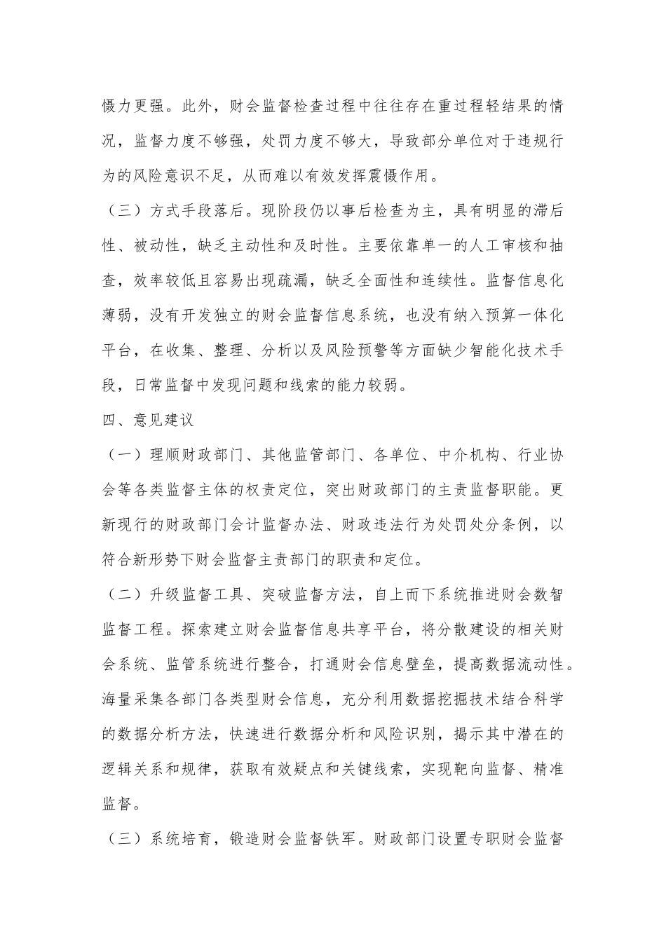 XX区推进纪检监察监督与财会监督贯通协调调研报告一、财会监督工作基本情况为深入贯彻习近平总书记关于财会监督的重要论述精神,认真落实中央办公厅、国务院办公厅印发的《关于进一步加强财会监督工作的意见》和省委办公厅、省政府办公厅印发的《关于进一步加强财会监督工作的实施方案》,按照《财政部关于开展地方财经纪律重点问题监督检查的通知》、《2024年xx省财会监督专项行动工作方案》要求,结合我区实际,研究制定了《2024年xxx市xx区财会监督专项行动工作方案》。专项行动重点围绕财经领域重大案件查处、严肃财经纪律专项整治、会计评估领域专项监督、预算执行常态化监督等4个领域开展。2024年x月xx区财政局决定对区属行政事业单位和企业开展会计信息质量检查。检查抽取区属2家行政事业单位,1家区属企业。检查重点关注行政事业单位政府会计准则制度的贯彻实施、单位内部控制制度的建立和执行情况。企业会计信息质量检查重点关注企业会计准则执行情况、国有企业负责人薪酬制度和工资决定机制改革政策执行情况。报告共发现问题xx条,涉及违规发放津贴、内控制度不健全、国有资产管理不规范等。要求相关单位和企业即查即改,确保整改到位。对查出的问题,及时梳理分析存在的原因,采取有力可行的措施,即查即改、整改到位。建章立制,提升管理水平。完善财会相关制度,夯实会计核算基础,建立健全长效机制,加强从业人员业务培训,提高财务管理水平。二、贯通协调工作的具体实践情况财会监督是党和国家监督体系的重要组成部分。去年以来,为规范财会管理,强化对财政资金拨付使用的全流程监管,区纪工委与区财政局建立信息共享机制,做到事前工作互商、事中监督互进、事后成果互享、全程信息互通。区财政局将日常财务检查中发现的问题和疑点及时通报,区纪工委再根据通报信息对相关单位和个人进行监督检查。同时,区纪工委在日常监督检查、审查调查和巡察监督工作中涉及财会业务等事项需要区财政局协助的,区财政局根据需要安排财会人员协助工作,形成合力优势,提高监督质效。在监督检查、巡察监督过程中发现财务类问题后,我们会将问题系统梳理归类并及时通报;区财政局根据问题类型和领域,再有针对性地开展财务检查行动,做到同向发力、同频共振。三、存在的问题及原因分析(一)队伍力量偏弱。xx区负责财会监督工作人员仅1人,并且还需负责其他工作,与省内其他地市相比明显偏少。财会监督队伍急需扩充,力量急需增强。(二)监督力度不够。相对于同样作为党和国家监督体系重要组成部分的审计监督,财会监督效力明显偏弱。从机构设置角度来看,财政监督局只是作为财政局的内设机构履行财会监督的职能,而审计局则是作为独立的部门履行审计监督职责,独立性、权威性和威慑力更强。此外,财会监督检查过程中往往存在重过程轻结果的情况,监督力度不够强,处罚力度不够大,导致部分单位对于违规行为的风险意识不足,从而难以有效发挥震慑作用。(三)方式手段落后。现阶段仍以事后检查为主,具有明显的滞后性、被动性,缺乏主动性和及时性。主要依靠单一的人工审核和抽查,效率较低且容易出现疏漏,缺乏全面性和连续性。监督信息化薄弱,没有开发独立的财会监督信息系统,也没有纳入预算一体化平台,在收集、整理、分析以及风险预警等方面缺少智能化技术手段,日常监督中发现问题和线索的能力较弱。四、意见建议(一)理顺财政部门、其他监管部门、各单位、中介机构、行业协会等各类监督主体的权责定位,突出财政部门的主责监督职能。更新现行的财政部门会计监督办法、财政违法行为处罚处分条例,以符合新形势下财会监督主责部门的职责和定位。(二)升级监督工具、突破监督方法,自上而下系统推进财会数智监督工程。探索建立财会监督信息共享平台,将分散建设的相关财会系统、监管系统进行整合,打通财会信息壁垒,提高数据流动性。海量采集各部门各类型财会信息,充分利用数据挖掘技术结合科学的数据分析方法,快速进行数据分析和风险识别,揭示其中潜在的逻辑关系和规律,获取有效疑点和关键线索,实现靶向监督、精准监督。(三)系统培育,锻造财会监督铁军。财政部门...