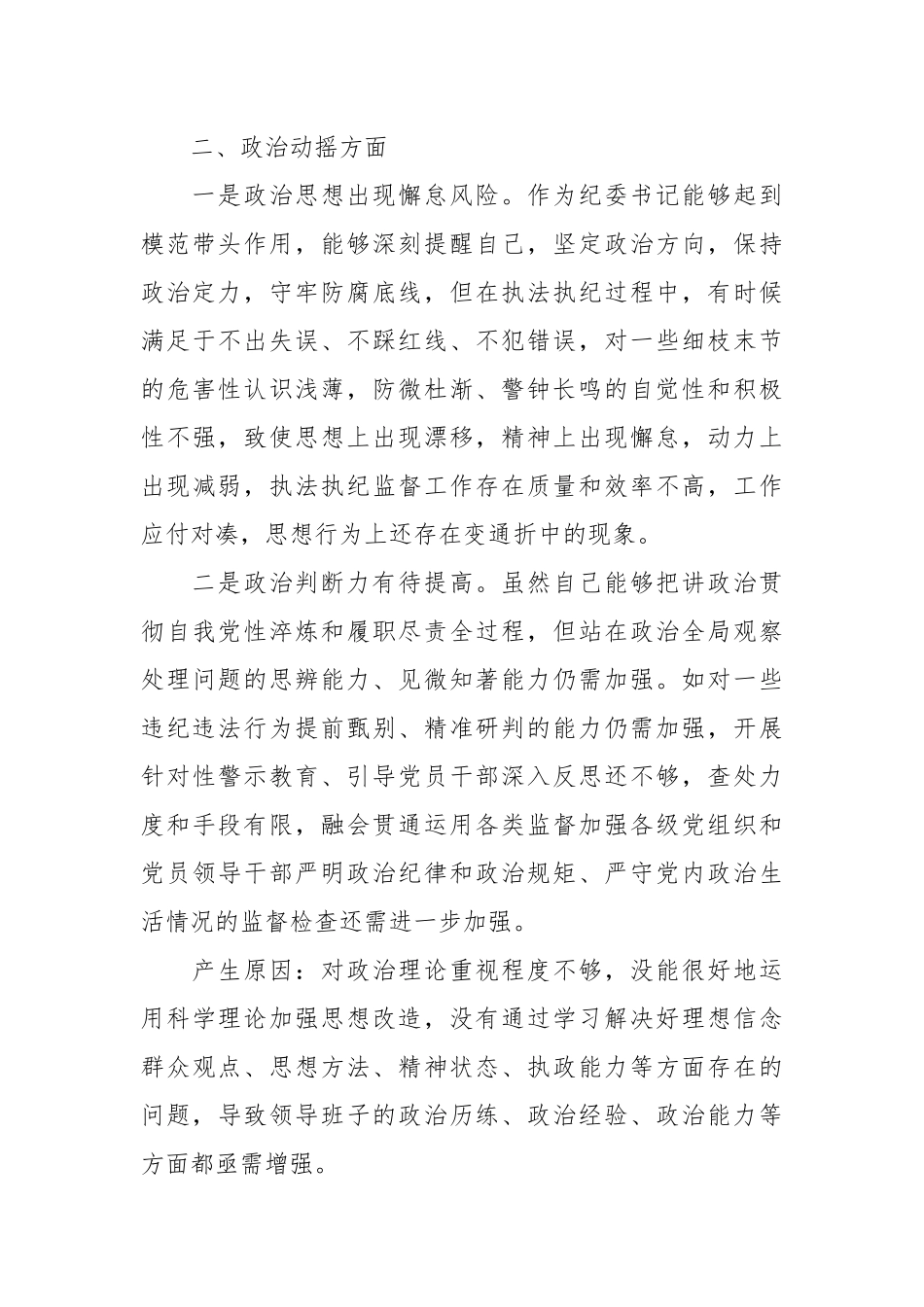 XX区纪委书记在教育整顿检视整治“六个方面”自查自纠问题清单一、信仰缺失方面一是理论学习的广度和深度不均衡。日常学习倾向于广泛涉猎,但缺乏精读,对A总书记在各个领域的重要论述和重要指示批示精神刨根问底的“钻”劲不足。如已通读学习《A谈治国理政》第四卷,但对于每个专题的内容,未能全部做到知其然并知其所以然。二是立足政治机关角度审视问题的能力还有待加强。比如我委去年办理的**案件,案件办结后,“解剖麻雀”不够到位,只是单纯从纪检监察业务角度向案发单位下发了监察建议,要求堵塞制度漏洞、召开警示教育大会,但在运用**中蕴含的立场、观点、方法分析违法人思想根源、蜕变过程、外部环境等综合因素上还需进一步提升,以典型案件办理推动全区政治生态建设还需加强。产生原因:理论学习虚化,对A总书记关于全面从严治党的重要论述和A总书记关于加强纪检检察干部队伍建设、防止“灯下黑”的重要论述学习重视程度不高,学习不够聚焦、学习浮在表面,深钻细研和分析研究不够,没有按照“真学、真懂、真用、真信”的标准执行落实致使理论学习虚化。二、政治动摇方面一是政治思想出现懈怠风险。作为纪委书记能够起到模范带头作用,能够深刻提醒自己,坚定政治方向,保持政治定力,守牢防腐底线,但在执法执纪过程中,有时候满足于不出失误、不踩红线、不犯错误,对一些细枝末节的危害性认识浅薄,防微杜渐、警钟长鸣的自觉性和积极性不强,致使思想上出现漂移,精神上出现懈怠,动力上出现减弱,执法执纪监督工作存在质量和效率不高,工作应付对凑,思想行为上还存在变通折中的现象。二是政治判断力有待提高。虽然自己能够把讲政治贯彻自我党性淬炼和履职尽责全过程,但站在政治全局观察处理问题的思辨能力、见微知著能力仍需加强。如对一些违纪违法行为提前甄别、精准研判的能力仍需加强,开展针对性警示教育、引导党员干部深入反思还不够,查处力度和手段有限,融会贯通运用各类监督加强各级党组织和党员领导干部严明政治纪律和政治规矩、严守党内政治生活情况的监督检查还需进一步加强。产生原因:对政治理论重视程度不够,没能很好地运用科学理论加强思想改造,没有通过学习解决好理想信念群众观点、思想方法、精神状态、执政能力等方面存在的问题,导致领导班子的政治历练、政治经验、政治能力等方面都亟需增强。三、放弃原则方面一是居安思危的忧患意识有所松懈。虽能带头以时时放心不下的责任感抓安全办案,但把握全局和抓细节的统筹兼顾能力有待进一步提升,容易出现“抓大放小”的情况。如有时候为了提高办案效率,对于个别案件存在的安全研判工作内容雷同、谈话方案不够细致周全等问题把关不够严格。二是对加强党风廉政建设的紧迫意识不强。有时存在没有把全面从严治党全面贯彻到纪检监察工作的始终,主动担当不够,思考谋划不远,责任的链条没有压紧压实,持续传导压力不够,面对重大政治原则和大是大非问题上缺乏敢于动真碰硬,刮骨疗毒的勇气和魄力。三是监督推动解决历史遗留问题的攻坚克难意识有待增强。在监督推动整合跨部门、跨领域、跨层级的力量破解问题、谋求新突破方面仍存在一定的畏难情绪。如巡察发现的一些历史遗留问题,在督促做好后续的跟踪问效,统筹探索从上至下推动整改、化解矛盾、打破困局的有效途径不多,监督保障执行、促进完善发展的作用发挥得还不够充分。产生原因:虽然自己能够严以律己,规范言行,认真履行中央八项规定和廉洁自律的各项准则,但纪律法规的敬畏心不强,对纪律法规局限于写在纸上,挂在墙上,在深钻细研、琢磨领会、吃透精神方面做得功课不够,致使纪律规矩失调。四、作风不正方面一是日常监督上用力不够,缺乏有力抓手。虽然采取了函询谈话、建立领导干部廉政档案、组织专项监督检查等比较有效的监督方式,但仍然没有真正把监督融入日常工作当中,开展监督工作方式方法较为有限,按部就班定期检查较多,采取“四不两直”检查督导相对较少,在将监督融入日常融入经常上做的还不够好。二是整治群众身边腐败和不正之风的成效离群众期待有差距。针对群众反映强烈的热点、难点问题,开展专项治理的力度还不够,民...