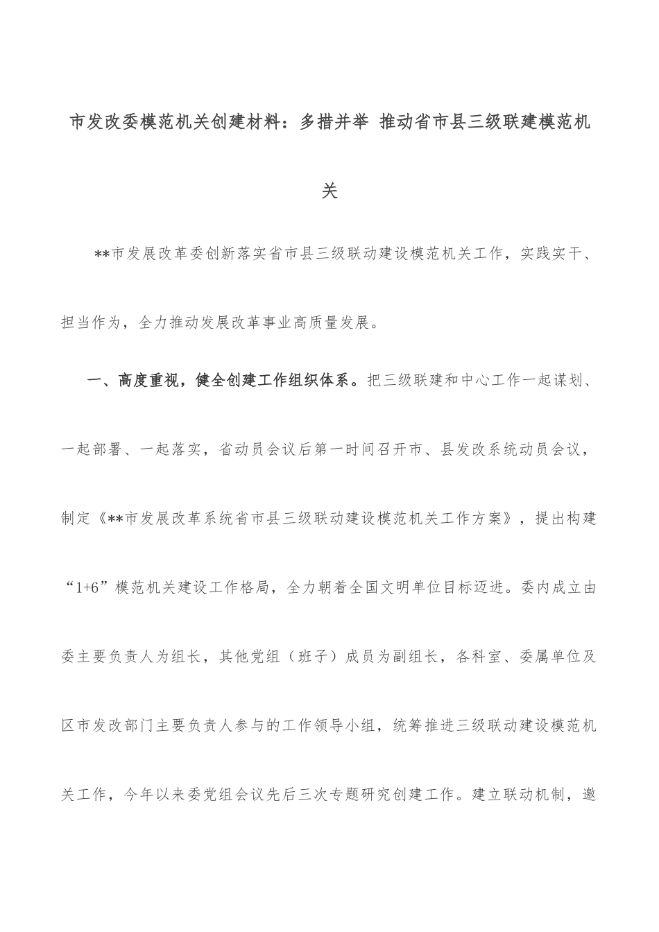 市发改委模范机关创建材料:多措并举推动省市县三级联建模范机关**市发展改革委创新落实省市县三级联动建设模范机关工作,实践实干、担当作为,全力推动发展改革事业高质量发展。一、高度重视,健全创建工作组织体系。把三级联建和中心工作一起谋划、一起部署、一起落实,省动员会议后第一时间召开市、县发改系统动员会议,制定《**市发展改革系统省市县三级联动建设模范机关工作方案》,提出构建“1+6”模范机关建设工作格局,全力朝着全国文明单位目标迈进。委内成立由委主要负责人为组长,其他党组(班子)成员为副组长,各科室、委属单位及区市发改部门主要负责人参与的工作领导小组,统筹推进三级联动建设模范机关工作,今年以来委党组会议先后三次专题研究创建工作。建立联动机制,邀请省发改委先后到**、****等开展三级联动党性教育,在全市发展改革系统启动“党建联建共建”活动,市发改委机关各党支部选择一个区市发改部门党组织、一个或多个企业党组织,三方联动开展“党建引领高质量发展联建共建”。目前,全市发改系统已形成推动模范机关创建工作走深走实的浓厚氛围。二、党建引领,建设作风优良政治机关。坚持政治机关定位,全面落实从严治党责任,持续开展党建、意识形态、党风廉政建设“三个一”专题教育,实施“书记谈话、主任问计”“主任进科室”等制度,营造风清气正政治生态。倡树“严真细实快”作风,深入开展“能力作风建设年”和“大培训、大练兵、大比武、大竞赛”活动,今年以来举行15场“发改大讲堂”“每周夜校”活动,对市、县发改系统400多名干部开展专业化能力培训。优化10个攻坚突破团队,推行“争分榜”“揭榜挂帅”“发改榜样”评选、“亮点引航工程”等机制,激发干部干事创业热情,2人被市委评为干部执行力先锋标兵。在市发改系统的带动下,各区市也都形成独特创建风格,**区的“为党旗添彩、为发展建功、为群众造福”,**区的“吹哨报到”,**市的“四个模范”等都取得较好成效。三、服务发展,提升模范机关创建实效。随着三级联创活动的持续开展,模范机关创建与中心工作开始深度融合、形成合力,实现“软件”“硬件”质量双提升,有力促进了经济社会发展。围绕政策供给,对接省“稳中求进”高质量发展政策清单,结合**实际制定“暖心30条”“推动服务业恢复发展”“稳经济促发展”等政策措施,形成了良好的政策联动效应。围绕绿色低碳发展,省、市、县三级合力谋划“双碳”发展路径,丁字湾双碳智谷、核风光储一体化等快速起势,省发改委为万华蓬莱低碳新材料产业园等16个项目批复节能审查,**成为全省唯一连续16年完成能耗下降任务的市。在重点项目方面,**有186个进入省级重点项目盘子,总投资、年度计划投资均居全省首位。上半年,**地区生产总值增长4.5%,居全省首位。四、三级联动,推动县域经济高质量发展。借势省、市、县三级联创,积极谋划县域发展,推动联创成果在基层落地、见效。制定出台《振兴县(区)域经济三年行动方案》,开展“对接区市、振兴县域”活动,支持区市推进一批实实在在事项。支持区市主动融入黄河流域生态保护和高质量发展、胶东经济圈一体化发展战略,***区、**—**一体化发展先行区成功获批,**综试区建设纵深推进。强化对基层服务,对82户企业开展服务企业专员制度,联合省“四进”工作组持续开展送政策到一线活动。省市县三级联动建设模范机关实惠了基层,最大受益者是县域。**市发展改革系统将深入贯彻落实省发展改革委三级联动建设模范机关系统培训会议精神,系统推进、上下联动,进一步强化党建引领联动、中心工作联动、能力作风联动、清廉建设联动、文明创建联动、服务基层联动,以党建带创建、创建带队建,努力打造一支具有大开大合思维、文武兼备素质、超脱自我境界的“发改铁军”,建设让党中央放心、让人民群众满意的模范机关。