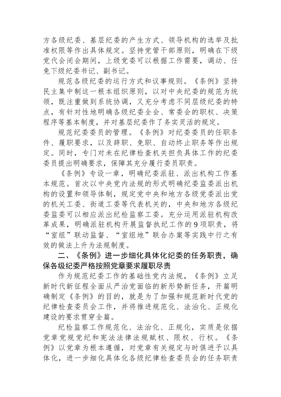 党课讲稿:关于中国共产党纪律检查委员会工作条例解读推进反腐败工作规范化、法治化、正规化,前提是纪检监察工作自身运行要规范化、法治化、正规化。党的十八大以来,党中央领导制定了一系列强化对纪委监委权力监督的法规制度,有力保证了纪检监察权在规范化、法治化轨道上有效运行。《中国共产党纪律检查委员会工作条例》(以下简称《条例》)坚持打铁必须自身硬,明确权力边界、严格内控机制,着力把纪检监察权关进制度笼子,进一步推进纪检监察工作规范化、法治化、正规化。一、《条例》规范纪委的产生运行,健全符合纪检工作规律的组织制度、运作方式,加强纪检工作的组织制度保障党的十八大以来,以习近平同志为核心的党中央坚定不移推进全面从严治党,着力加强党的纪律检查工作,持续深化纪检监察体制改革,取得了一系列理论、实践和制度创新成果。《条例》系统总结这些宝贵经验,并固化为制度规定,有利于促进党和国家监督制度、反腐败工作体制机制更加成熟定型。随着全面从严治党的深入推进、纪律检查工作实践的深化发展,有必要制定一部专门的纪委组织法规,全面规范各级纪委的组织制度和运作方式。《条例》着眼于促进纪检机关在组织体系上发挥新效能,在第三章中对各级纪委的组织设置、产生和运行等作出系统规范,规定了横向到边、纵向到底的严密组织制度,填补了党内法规的制度空白。规范各级纪委的产生。《条例》分别对中央纪委、地方各级纪委、基层纪委的产生方式、领导机构的选举及批准权限等作出具体规定。坚持党管干部原则,明确在下级党代会闭会期间,上级党委可以根据工作需要,调动、任免下级纪委书记、副书记。规范各级纪委的运行方式和议事规则。《条例》坚持民主集中制这一根本组织原则,以对中央纪委的规范为统领,既注重做到系统协调,又充分考虑不同层级纪委的特点,有针对性地明确各级纪委全会、常委会的职权、决策程序等基本制度,并对基层纪委作了务实灵活的规定。规范纪委委员的管理。《条例》对纪委委员的任职条件、履职要求,以及辞职、免职、自动终止职务等作出规定。同时,专门对未在纪律检查机关担负具体工作的纪委委员提出明确要求,保障其充分履行委员职责。《条例》专设一章,明确纪委派驻、派出机构工作基本规范。首次以中央党内法规的形式明确纪委监委派出机构的设置和领导体制,规定党中央和地方各级党委派出党的机关工委、街道工委等代表机关的,中央和地方各级纪委监委可以相应派出纪检监察工委。充分运用派驻机构改革成果,明确派驻机构开展监督执纪工作的9项职责,将“室组”联动监督、“室组地”联合办案等实践中行之有效的做法上升为法规制度。二、《条例》进一步细化具体化纪委的任务职责,确保各级纪委严格按照党章要求履职尽责作为规范纪委工作的基础性党内法规,《条例》立足新时代新征程全面从严治党面临的新形势新任务,开篇明确制定《条例》的目的,就是为了加强和规范新时代党的纪律检查委员会工作,并将推进规范化、法治化、正规化建设的要求贯穿全篇。纪检监察工作规范化、法治化、正规化,实质是依据党章党规党纪和宪法法律法规赋权、限权、行权。《条例》以党章为根本遵循,对党章有关规定与时俱进予以具体化,进一步细化具体化各级纪律检查委员会的任务职责为各级纪委更好地落实和维护党章提供了有力抓手,确保各级纪委严格按照党章要求履职尽责,依规依纪依法正风肃纪反腐。《条例》第四章专章规定纪委的主要任务,围绕党章规定的“三项任务”,着重从内涵、目标、要求等方面作出细化。以“协助党的委员会推进全面从严治党”为例,《条例》丰富了纪委协助党委任务的内涵,促进协助任务具体化制度化。第二十六条具体列出了“协助同级党委制定全面从严治党规划、计划,推动各项工作落实”“协助同级党委开展巡视巡察工作”等x项具体任务,促进纪委履行协助职责和监督责任有机结合,主体责任和监督责任贯通协同。纪委的任务与职责相辅相成、辩证统一,任务指明纪委的工作方向和目标,职责是任务得以实现的路径和方法《条例》第五章专章规定了纪委工作职责,结合新的实践将党章规定的监督执纪问责职责和各项经常性工作,...