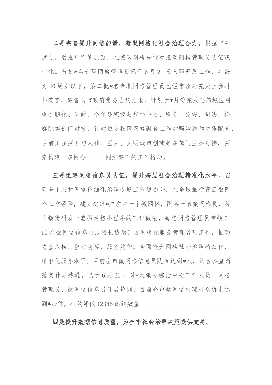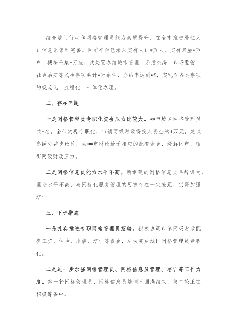关于加快推进党建引领基层治理提升工作效能的汇报今年以来,按照**市委政法委印发的《关于加快推进党建引领基层治理提升工作效能的通知》和**市委组织部、市委政法委等五部门印发《深化城市基层党建引领基层治理的若干措施(试行)》部署要求,**市扎实推进化网格治理工作,现将有关情况汇报如下:一、工作情况一是深化拓展“**经验”,党建引领网格化社会治理工作。结合作风能力提升年活动,与市委组织部、市城建局、市民政局等多部门联合对12处镇办基层治理工作进行调研,制定出台了《**市全面建设网格化社会治理体系试点工作方案》《关于在全市推广“青云”微网格经验推进农村网格精细化治理的实施方案》《深入开展平安建设领域“五类风险”防范化解工作方案》以及《关于深化平安创建活动推进更高水平平安**建设的工作方案》《实施社会治理“八大工程”加快推进基层治理体系和治理能力现代化建设的工作方案》等文件,成立了由市委书记、市长任组长的网格化社会治理体系领导小组,在城市社区构建党建统领下的七支服务团队,将小区党支部、网格管理员、网格信息员、志愿者、物业、业主委员会、机关包联单位干部下沉到城市社区居委会;在农村深化“镇街党(工)委-社区(新村)党组织-网格党支部-网格信息员”服务模式,平战结合开展工作,实现党建引领全覆盖。二是完善提升网格能量,凝聚网格化社会治理合力。根据“先试点,后推广”的原则,在城区网格分批次推动网格管理员队伍职业化。首批*名专职网格管理员已于6月21日入职开展工作,年龄为40周岁以下,第二批*名专职网格管理员已经市政府完成上会材料签字,筹备向市政府常务会议汇报,计划于*月份完成全部城区网格专职化。同时,今年还积极与疾控中心、税务、公安、司法、检察院等部门对接,针对城乡社区网格融合工作加强沟通和协作配合,目前正在探索与人社、医保、文明城市创建等多部门业务对接,探索构建“多网合一、一网统筹”的工作格局。三是组建网格信息员队伍,提升基层社会治理精准化水平。召开全市农村网格精细化治理专题工作现场会,在全域推行青云微网格工作经验,建立起每*户左右一个微网格,配备一名微网格员,每个镇街研发一套微网格小程序的工作做法,每名网格管理员带领5-10名微网格信息员或楼长协助开展网格化服务管理各项工作,推动力量入格、重心前移、服务延伸,全面提升网格社会治理精细化、精准化服务水平。目前全市微网格信息员队伍达到*人,结合公益岗落实补贴待遇。已于6月21日对*处镇办综治中心工作人员、网格管理员、微网格信息员开展轮训,目前全市微网格处理群众诉求达到*余件,有效降低12345热线数量。四是提升数据信息质量,为全市社会治理决策提供支持。结合敲门行动和网格管理员能力素质提升,在全市推进居住人口信息采集和完善。目前平台已录入实有人口*万人、实有房屋*万户、楼栋采集*万座,共处置办结城市管理、矛盾纠纷、市场监管、社会治安等民生事项共计*万余件,办结率达到*%,实现对各类事项的规范化、流程化、一体化办理。二、存在问题一是网格管理员专职化资金压力比较大。**市城区网格管理员共*名,全部实现专职化,市镇两级财政将投入资金约*万元,建议参照公益岗政策,由**市财政给予相应的配套资金,缓解区市、镇街两级财政压力。二是网格信息员能力水平不高。新组建的网格信息员年龄偏大、理论水平不高,与网格化服务管理的要求存在一定差距,仍需加强培训。三、下步措施一是扎实推进专职网格管理员招聘。积极协调市镇两级财政配套工资、保险、服装、培训等资金,尽快完成城区网格管理员专职化。二是进一步加强网格管理员、网格信息员管理、培训等工作力度。第一轮网格管理员、网格信息员培训已圆满结束,第二轮正在积极筹备中。