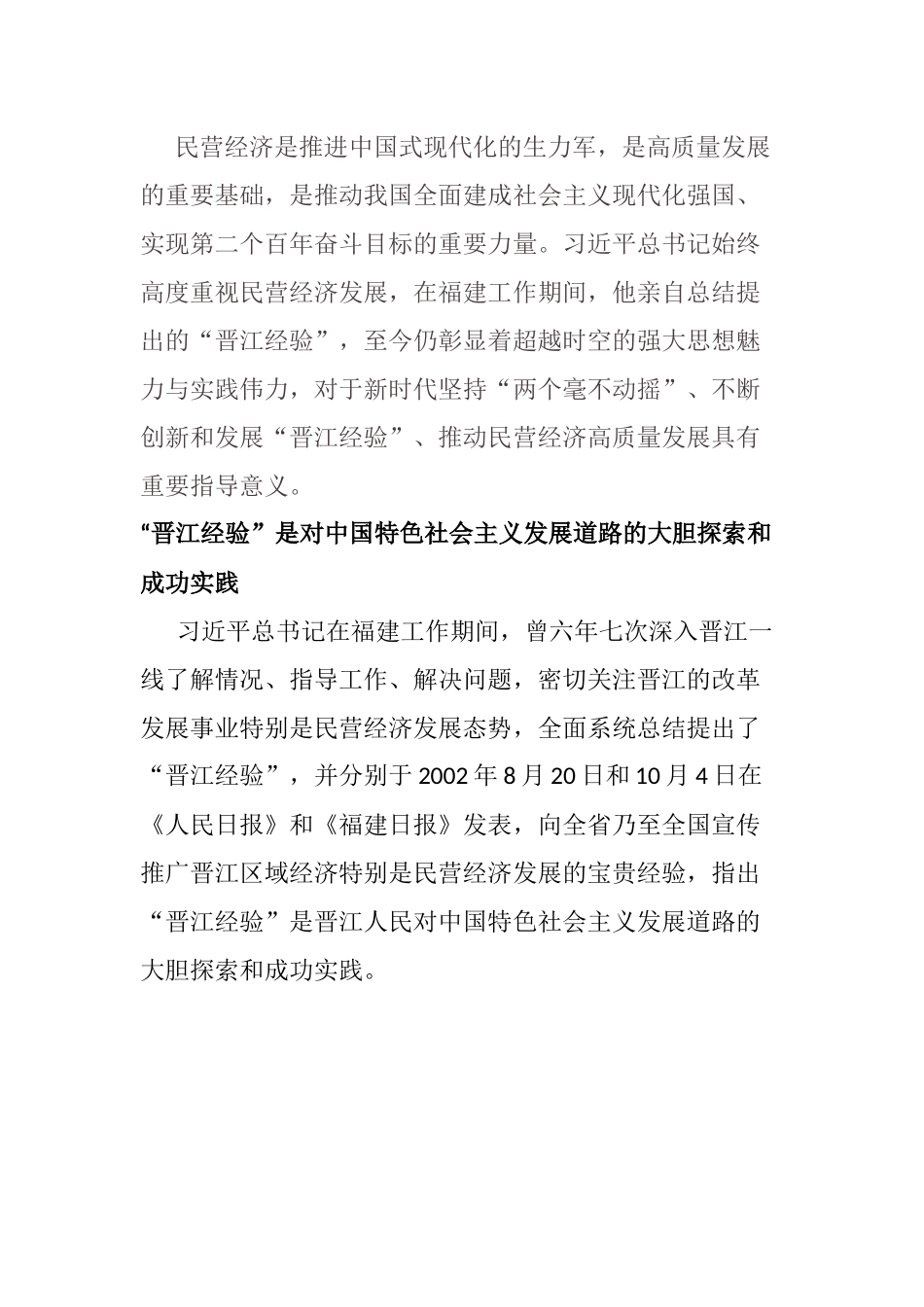 民营经济是推进中国式现代化的生力军,是高质量发展的重要基础,是推动我国全面建成社会主义现代化强国、实现第二个百年奋斗目标的重要力量。习近平总书记始终高度重视民营经济发展,在福建工作期间,他亲自总结提出的“晋江经验”,至今仍彰显着超越时空的强大思想魅力与实践伟力,对于新时代坚持“两个毫不动摇”、不断创新和发展“晋江经验”、推动民营经济高质量发展具有重要指导意义。“晋江经验”是对中国特色社会主义发展道路的大胆探索和成功实践习近平总书记在福建工作期间,曾六年七次深入晋江一线了解情况、指导工作、解决问题,密切关注晋江的改革发展事业特别是民营经济发展态势,全面系统总结提出了“晋江经验”,并分别于2002年8月20日和10月4日在《人民日报》和《福建日报》发表,向全省乃至全国宣传推广晋江区域经济特别是民营经济发展的宝贵经验,指出“晋江经验”是晋江人民对中国特色社会主义发展道路的大胆探索和成功实践。“晋江经验”的核心内容为“六个始终坚持”和“正确处理好五大关系”,其中,“六个始终坚持”包括:始终坚持以发展社会生产力为改革和发展的根本方向,始终坚持以市场为导向发展经济,始终坚持在顽强拼搏中取胜,始终坚持以诚信促进市场经济的健康发展,始终坚持立足本地优势和选择符合自身条件的最佳方式加快经济发展,始终坚持加强政府对市场经济发展的引导和服务。“正确处理好五大关系”包括:处理好有形通道和无形通道的关系,处理好发展中小企业和大企业之间的关系,处理好发展高新技术产业和传统产业的关系,处理好工业化和城市化的关系,处理好发展市场经济与建设新型服务型政府之间的关系。“晋江经验”的总结提出,充分彰显了习近平总书记高瞻远瞩的战略思维、科学统筹的系统观念、勇于创新的胆魄意识、造福人民的价值追求和真抓实干的务实作风,充分体现了习近平总书记对民营经济发展的高度重视、大力支持和殷切希望。福建始终遵循习近平总书记关于民营经济发展的重要论述,坚持“两个毫不动摇”,不断传承弘扬“晋江经验”,推动和支持民营经济发展不断跃上新台阶,让民营经济像绿水青山一样成为福建的骄傲。全省民营经济总体呈现“七七七八九”的贡献格局,即贡献了70%的地区生产总值、70%的税收、70%的科技创新成果、80%以上的城镇劳动就业和90%以上的企业数,成为全省经济社会发展的重要支撑、创新创业的主体力量和社会财富的活水源泉。作为“晋江经验”的发源地,晋江以全省两百分之一的土地面积创造了全省十六分之一的地区生产总值,2022年GDP首次突破3000亿元大关,相当于20年里再造10个晋江,县域经济基本竞争力连续5年居全国第四位,综合经济实力连续29年居福建省县域首位。福建及晋江的成功实践表明,“晋江经验”彰显澎湃力量,是开启民营经济、实体经济、县域经济发展快车道的一把“金钥匙”。“晋江经验”与XXX经济思想具有高度的内在一致性“晋江经验”创造性地运用马克思主义立场、观点、方法,从发展方向等多个方面总结探索经验、提出明确要求,贯穿着科学思想方法和工作方法,其内涵与XXX经济思想一脉相承,与党的十八大以来党中央提出的坚持“两个毫不动摇”高度契合,闪耀着马克思主义的真理光芒,体现了习近平总书记对马克思主义政治经济学中国化时代化的重要探索。把解放和发展社会生产力作为改革和发展的根本方向。纵观晋江民营经济发展历程,广大干部群众始终将解放和发展社会生产力作为各项工作的立足点和着力点,只要是有利于解放和发展社会生产力的,就在实践中大胆去闯、去试。习近平总书记在总结“晋江经验”时就明确指出,“学习借鉴晋江经验,最根本是要始终坚持以发展社会生产力为改革和发展的根本方向,充分发挥自身优势,从继续突破影响市场经济发展的体制性障碍和不断提高生产力要素水平两个方面,促进社会生产力的全面发展”,这与党的十八大以来习近平总书记反复强调的“社会主义的根本任务是解放和发展社会生产力”“坚决清除妨碍社会生产力发展的体制机制障碍”等重要论述是高度契合的。当前,我国仍处于社会主义初级阶段,必须始终坚持以经济建设为中心,传承弘扬好“晋江经验”,...
