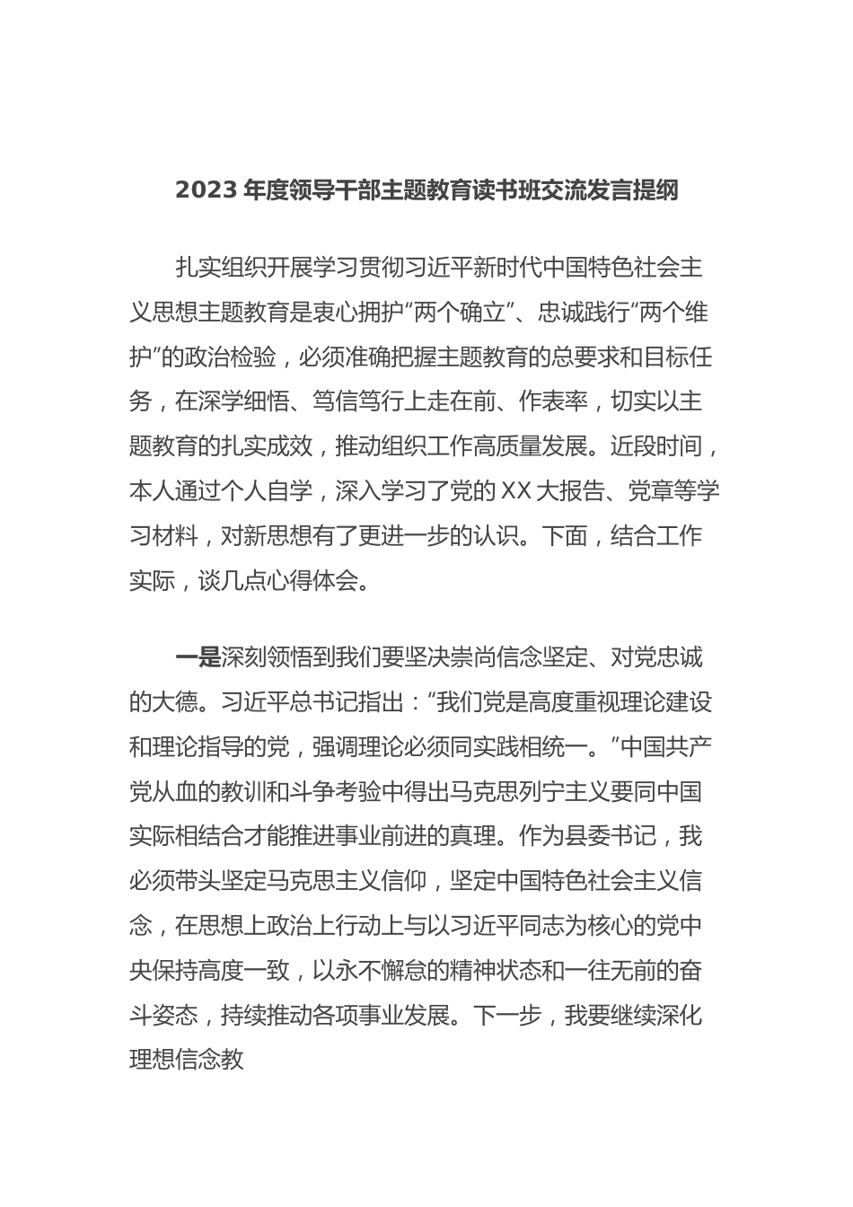 2023年度领导干部主题教育读书班交流发言提纲扎实组织开展学习贯彻习近平新时代中国特色社会主义思想主题教育是衷心拥护“两个确立”、忠诚践行“两个维护”的政治检验,必须准确把握主题教育的总要求和目标任务,在深学细悟、笃信笃行上走在前、作表率,切实以主题教育的扎实成效,推动组织工作高质量发展。近段时间,本人通过个人自学,深入学习了党的XX大报告、党章等学习材料,对新思想有了更进一步的认识。下面,结合工作实际,谈几点心得体会。一是深刻领悟到我们要坚决崇尚信念坚定、对党忠诚的大德。习近平总书记指出:“我们党是高度重视理论建设和理论指导的党,强调理论必须同实践相统一。”中国共产党从血的教训和斗争考验中得出马克思列宁主义要同中国实际相结合才能推进事业前进的真理。作为县委书记,我必须带头坚定马克思主义信仰,坚定中国特色社会主义信念,在思想上政治上行动上与以习近平同志为核心的党中央保持高度一致,以永不懈怠的精神状态和一往无前的奋斗姿态,持续推动各项事业发展。下一步,我要继续深化理想信念教育,筑牢全县干部群众思想防线,以更加坚定的信念聚力奋进新时代。二是深刻领悟到我们要持续涵养党性立身、担当作为的品格。习近平总书记指出:“干部要有担当,就要有胸怀和魄力,就要敢于直面问题,敢于涉险过硬,敢于迎难而上,敢于勇挑重担。”过去的一段时期里,全县上下深入学习贯彻习近平新时代中国特色社会主义思想,坚持知行合一,以“踏踏实实干事,一步一个脚印”的品德品行,勇于担当作为,取得了显著成效。作为县委书记,我必须带头坚持知行合一,踏踏实实做好本职工作,以永不懈怠的精神状态,继续推动各项事业发展。下一步,我将必须涵养党性立身、担当作为的品格,练就“八项”基本功,起而行之,砥砺“好品格”、锤炼“真本领”、肩负“新使命”,始终做到与党心连心,与人民心连心。。三是深刻领悟到我们要更加坚定实践为要、奋斗以成的决心。习近平总书记指出:“信仰之山高,使命之路远,只有不断坚定理想信念,才能不懈奋斗。”“上面千条线,下面一根针”,面对日益增加的任务和挑战,忙碌是基层干部的常态,要提高能力素质短板,克服形式主义,提高办事效率。作为县委书记,我必须带头坚定马克思主义信仰,坚定中国特色社会主义信念,以永不懈怠的精神状态和一往无前的奋斗姿态,继续推动各项事业发展。下一步,我要继续深化理想信念教育,筑牢全县干部群众思想防线,以更加坚定的信念聚力奋进新时代。同时,要组织开展作风建设,坚决反对形式主义、官僚主义,提高工作效率,以实际行动践行新时代好干部标准。尊敬的各位领导、各位同志,以上就是我对当前深入学习贯彻习近平新时代中国特色社会主义思想的几点认识。我们将更加紧密地团结在以习近平同志为核心的党中央周围,牢记初心使命,开拓进取,以优异成绩推进党的XX大精神落地生根。最后,预祝本次会议取得圆满成功!