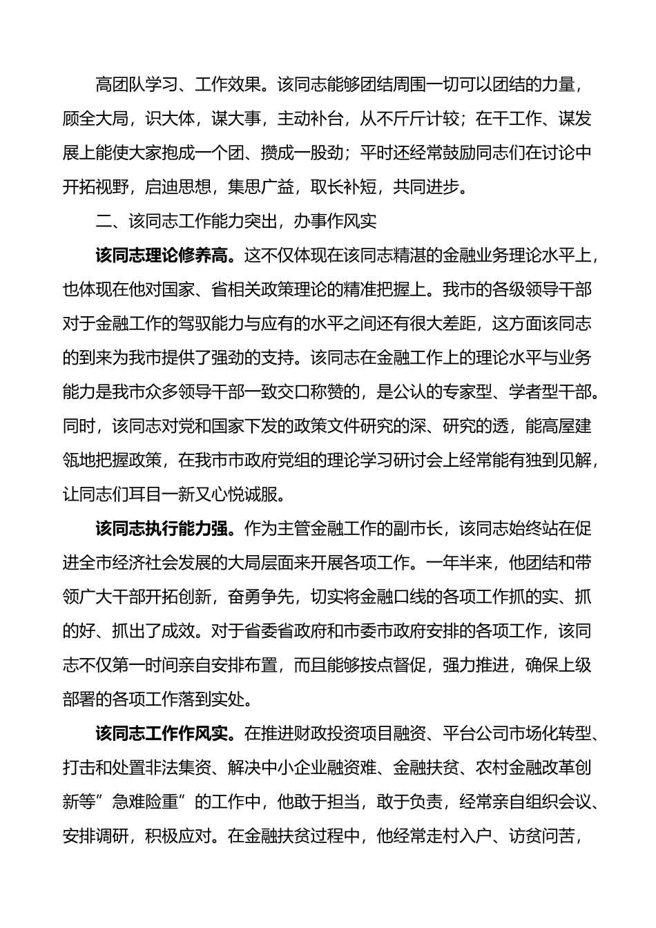国企高管挂职副市长工作履职鉴定报告范文根据组织安排,从20xx年x月起,该同志到我市挂职锻炼,任市政府副市长,主管金融口线工作,分管金融办、人民银行市支行、银监办以及各金融机构等单位。到职以来,在有限的时间里,该同志以积极主动、认真负责的态度主持开展和参与了我市一系列重要工作,为我市的金融事业改革发展做出了突出贡献。现将该同志在我市挂职期间的思想、工作状况作如下鉴定:一、该同志政治立场坚定,个人品德好该同志十分注重政治理论学习。在我市期间,该同志积极参加市政府党组的各项政治学习教育活动,认真研读马列主义、毛泽东思想和邓小平理论等理论原著,理解深刻,领悟透彻,结合我市实际深入研究了党的十九大、十九届历次全会精神和习近平新时代中国特色社会主义思想,把习近平总书记关于金融工作的有关精神落在了开展我市金融工作的实处。该同志具有较高的政治素养。该同志政治立场坚定,具有充分的理论自信和道路自信,坚守”四个意识”,始终在思想上、政治上、行动上与上级保持高度一致,不折不扣地执行上级的重大决策和部署,确保党的路线、方针、政策在金融领域得到全面贯彻落实。善于团结和凝聚各方力量推进工作,对工作既注重实效,通盘考虑,又讲究方法,各个击破,充分体现出优秀的领导才能和良好的政治素质。该同志具备较高的人格修养。在处理分管工作的过程中,该同志能够勇挑重担,对重大理论和现实问题进行深入思考和研究,形成正确的工作思路,努力营造民主、宽松、和谐的学习、工作氛围,强化团队理念,提高团队学习、工作效果。该同志能够团结周围一切可以团结的力量,顾全大局,识大体,谋大事,主动补台,从不斤斤计较;在干工作、谋发展上能使大家抱成一个团、攒成一股劲;平时还经常鼓励同志们在讨论中开拓视野,启迪思想,集思广益,取长补短,共同进步。二、该同志工作能力突出,办事作风实该同志理论修养高。这不仅体现在该同志精湛的金融业务理论水平上,也体现在他对国家、省相关政策理论的精准把握上。我市的各级领导干部对于金融工作的驾驭能力与应有的水平之间还有很大差距,这方面该同志的到来为我市提供了强劲的支持。该同志在金融工作上的理论水平与业务能力是我市众多领导干部一致交口称赞的,是公认的专家型、学者型干部。同时,该同志对党和国家下发的政策文件研究的深、研究的透,能高屋建瓴地把握政策,在我市市政府党组的理论学习研讨会上经常能有独到见解,让同志们耳目一新又心悦诚服。该同志执行能力强。作为主管金融工作的副市长,该同志始终站在促进全市经济社会发展的大局层面来开展各项工作。一年半来,他团结和带领广大干部开拓创新,奋勇争先,切实将金融口线的各项工作抓的实、抓的好、抓出了成效。对于省委省政府和市委市政府安排的各项工作,该同志不仅第一时间亲自安排布置,而且能够按点督促,强力推进,确保上级部署的各项工作落到实处。该同志工作作风实。在推进财政投资项目融资、平台公司市场化转型、打击和处置非法集资、解决中小企业融资难、金融扶贫、农村金融改革创新等”急难险重”的工作中,他敢于担当,敢于负责,经常亲自组织会议、安排调研,积极应对。在金融扶贫过程中,他经常走村入户、访贫问苦,多次调研金融扶贫方案执行情况和政策落实效果;在对接项目融资工作期间,他经常亲自带队督导巡查,发现有单位没有按要求、按时间进度落实到位,有时会连夜把相关单位负责同志召集到现场督促落实;在解决中小企业融资难、融资贵问题中,他不畏艰难、亲下基层、几访企业,不断组织银企对接,促进金融机构支持中小企业;在促进农村金融创新工作中,他能针对群众实际需求和金融机构业务性质,结合实际研究政策,灵活地开展工作,达到了极好的效果。三、该同志专业水平精湛,业务成绩优(一)金融服务实体经济水平大幅度提升一是金融机构支持地方经济发展作用明显。在我市期间,该同志成功引进多家金融机构在我市设立分支机构;制定了《金融机构支持地方经济发展考核奖励办法》,引导金融机构为地方经济社会发展多做贡献。截至20xx年x月,银行业金融机构各项存款余额x亿元,较20xx年末增加x...