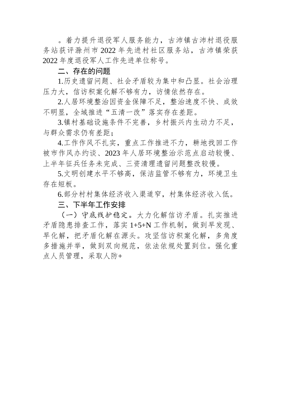 2023年上半年工作总结及下半年工作安排汇编(10篇)目录1.2023年上半年工作总结和下半年工作安排2.2023年上半年工作总结和下半年重点工作安排3.XX管理区档案史志馆2023年上半年工作总结及下半年工作安排4.区民政局2023年上半年工作总结和下半年工作安排5.县教体局2023年上半年工作总结及下半年工作安排6.县民政局2023年上半年工作总结及下半年工作安排7.县气象局2023年上半年工作总结及下半年工作安排8.县审计局2023年上半年工作总结和下半年工作安排9.镇2023年上半年工作总结和下半年工作安排10.镇2023年上半年工作总结暨下半年工作安排2023年上半年工作总结和下半年工作安排根据工作安排,现将古沛镇2023年上半年工作总结和下半年工作计划汇报如下:一、2023年上半年工作总结(一)经济运行稳中向好。经济指标持续向好。1-5月份完成固定资产1.4亿元,超序时进度16%,完成进度居全市前列,获市作风办关于对一季度全省赛马、推动北“两个加快”工作成绩突出的单位通报表彰。1-5月份一般公共收入371万元,同比增长25%,增幅居全市前列。招商引资服务有力。古沛镇年产300万羽肉鸡明光圣玉禽业产业有限公司完成项目建设,投产运行。重点项目保障有力。圆满完成G104国道180余亩土地征收,具备施工条件,即将进场施工;56.94亩土地出让工作完成,明光市年收储5万吨粮食仓储项目已进场施工。(二)乡村振兴亮点纷呈。扎实推进高标准农田建设,1.75万亩高标田全部完成建设并分田到户开展耕种,探索创新高标准农田建设“三不误工作法”,获滁州市肯定推广滁州市高标准农田建设现场会在古沛镇召开。推进农村信用体系建设,创造性实现农业面源污染治理与信用积分相结合运行模式,创成生态美超市1处,承办滁州市“两回收、两利用”现场会。强化农业科技服务水平,扩大土地托管服务服务面积,得到省农机总站、农技推广中心充分肯定土地增减挂稳步推进,2023第一批次土地增减挂钩项目173亩房屋及附属物全部拆除完毕,复垦进度达100%。(三)社会事务持续发展。扎实开展路长制工作,整改各类安全隐患2处,路长制考核居全市前列。皖绿〔2023〕2号文件通报古沛镇耿庄村、楼张村获评安徽省森林村庄。着力提升退役军人服务能力,古沛镇古沛村退役服务站获评滁州市2022年先进村社区服务站,古沛镇荣获2022年度退役军人工作先进单位称号。二、存在的问题1.历史遗留问题、社会矛盾较为集中和凸显。社会治理压力大,信访积案化解不够有力,访情依然存在。2.人居环境整治因资金保障不足,整治速度不快、成效不明显,全域推进“五清一改”落实存在差距。3.镇村基础设施条件不完善,乡村振兴内生动力不足,与群众需求仍有差距;4.工作作风不扎实,重点工作推进不力,耕地找回工作被市作风办约谈、2023年人居环境整治示范点启动较慢、上半年征兵任务未完成、三资清理遗留问题整改较慢。5.文明创建水平不够高,保洁监管不够有力,环境卫生存在短板。6.部分村村集体经济收入渠道窄,村集体经济收入低。三、下半年工作安排(一)守底线护稳定。大力化解信访矛盾。扎实推进矛盾隐患排查工作,落实1+5+N工作机制,做到早发现、早化解,把矛盾化解在源头。攻坚信访积案化解,多角度多措施并举,做到双向规范,依法依规处置到位。强化重点人员管理,采取人防+技防等多形式,掌握重点人员思想动态,确保人稳当地。筑牢安全生产防线。坚持以“严、实、细”的工作作风,一丝不苟地把安全生产各项工作真正落到实处,坚决守住不发生重特大事故底线,持续筑牢安全生产防线。加强道路交通、消防安全、人员密集场所、建筑工地、森林防火等重点领域和重点行业防范,压紧压实部门监管责任和企业主体责任,把各项防范措施落细、落实、落到位。(二)强招商谋发展。坚持招大引强不动摇。坚持领导带头、全员上阵,主动出击,力争完成招引亿元以上项目1个。抢做经济指标排头兵。强化规上企业培育,扎实做好企业用工、建设、融资等服务保障,下半年新增规上企业1家。强化经济指标运行管理,加快项目入库,争取年完成固定资产投资2.9亿元、工业增加值增幅超全市平均水平。(三)兴产业促振兴。围绕基础设施夯实产业基础。扎实推进高标...
