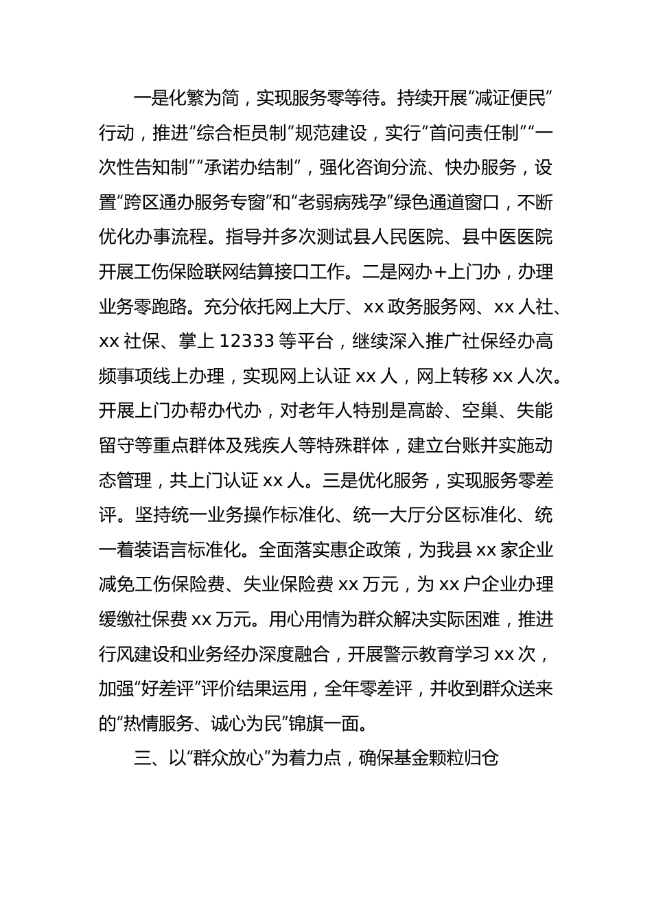 XX县社会保险经办工作会议上的汇报根据会议安排,现将我县社保工作开展情况汇报如下。一、以“群众需求”为出发点,做好两项加法一是参保扩面增加,提升群众获得感。对今年新开办注册的企业进行全面摸排,通过发放稽核通知书、电话稽核等方式,完成全部xx个新注册企业参保登记。持续推进建筑施工单位按工程建设项目参加工伤保险,全年xx个工程建设项目,已开工项目100%参加工伤保险,按项目参加工伤保险人数xx人。做好公务员(参公人员)参加工伤保险工作,完成我县机关、参公单位xx个xx人参加工伤保险。继续做好被征地农民养老保险工作。我县企业职工基本养老保险参保人数xx万人,征收养老基金xx万元;工伤保险参保人数xx万人,征收工伤保险基金xx万元;失业保险参保人数xx万人,征收失业保险基金xx万元。二是待遇发放增加,提升群众幸福感。按政策要求足额完成城镇职工基本养老保险调待工作,共为我县xx名企保退休人员调待xx万元。全年足额发放了5.04万元退休人员xx万元养老待遇,支付工伤保险待遇xx万元,保障了参保职工伤医疗、伤残、工亡待遇全面落实。二、以“群众满意”为落脚点,实现服务零距离一是化繁为简,实现服务零等待。持续开展“减证便民”行动,推进“综合柜员制”规范建设,实行“首问责任制”“一次性告知制”“承诺办结制”,强化咨询分流、快办服务,设置“跨区通办服务专窗”和“老弱病残孕”绿色通道窗口,不断优化办事流程。指导并多次测试县人民医院、县中医医院开展工伤保险联网结算接口工作。二是网办+上门办,办理业务零跑路。充分依托网上大厅、xx政务服务网、xx人社、xx社保、掌上12333等平台,继续深入推广社保经办高频事项线上办理,实现网上认证xx人,网上转移xx人次。开展上门办帮办代办,对老年人特别是高龄、空巢、失能留守等重点群体及残疾人等特殊群体,建立台账并实施动态管理,共上门认证xx人。三是优化服务,实现服务零差评。坚持统一业务操作标准化、统一大厅分区标准化、统一着装语言标准化。全面落实惠企政策,为我县xx家企业减免工伤保险费、失业保险费xx万元,为xx户企业办理缓缴社保费xx万元。用心用情为群众解决实际困难,推进行风建设和业务经办深度融合,开展警示教育学习xx次,加强“好差评”评价结果运用,全年零差评,并收到群众送来的“热情服务、诚心为民”锦旗一面。三、以“群众放心”为着力点,确保基金颗粒归仓一是从防范风险到优化业务,强化内控制度建设。结合社会保险经办风险防控评估检查完善《长期暂停领取待遇人员常态化清理机制》等制度,前移管控关口,分析业务经办中存在的问题、分析风险发生的可能性,结合业务工作实际及人员变化动态调整廉政风险点,设置一级风险点xx个,二级风险点xx个,三级风险点xx个。严格落实要情上报制度,加强要情分析研判。加强业务讨论交流,形成统一办理口径,进一步优化业务流程、完善业务标准促进风险防控和业务优化良性循环,整体提升业务经办管理水平。二是从人防到技防,运用数据共享比对核查。每月定期到公检法司等部门共享数据,主动在裁判文书网核实退休人员服刑情况,及时接收核实部、省、市下发的服刑预警信息,做到服刑期间不领待、缓刑期间不调待。全年共获取数据xx条,已全部核查完毕,其中核查到的疑点数据xx条,已停待遇xx人,系统标注不参与调待xx人,终止缴费xx人。三是从刚性追缴到柔情分期,维护社保基金安全。经核查确认违规领取社保待遇的,我局将立即停止待遇支付,千方百计联系违规领待人员,讲清政策依据领待金额及法律后果,对多次追讨仍拒不退回多领待遇的案件,做到程序到位,材料充分,向劳动监察部门、司法部门等地移交。因人施策,对却有生活困难的人员,充分为其考虑,可通过分期付款、退休待遇逐月抵扣等方式追回基金。截止目前,共追回社保基金xx万元,还有两人正在追缴。下一步,我局将认真贯彻落实本次会议精神,坚持深入实施全民参保计划,持续做好灵活就业人员、农民工等重点群体精准扩面。加强社保基金监督管理,常态化开展警示教育。抓好全局业务水平,继续开展练兵比武,加强局内部业务交流学习,努力打造一支“政策通、业务精、作风硬、本领强”的社保干部队伍。