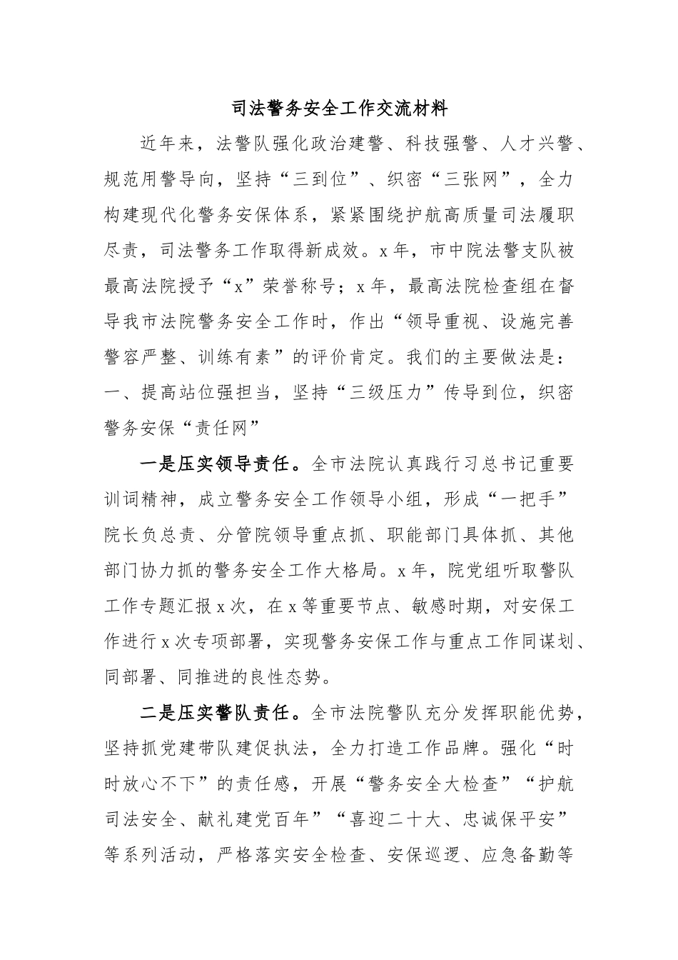 司法警务安全工作交流材料近年来,法警队强化政治建警、科技强警、人才兴警、规范用警导向,坚持“三到位”、织密“三张网”,全力构建现代化警务安保体系,紧紧围绕护航高质量司法履职尽责,司法警务工作取得新成效。x年,市中院法警支队被最高法院授予“x”荣誉称号;x年,最高法院检查组在督导我市法院警务安全工作时,作出“领导重视、设施完善警容严整、训练有素”的评价肯定。我们的主要做法是:一、提高站位强担当,坚持“三级压力”传导到位,织密警务安保“责任网”一是压实领导责任。全市法院认真践行习总书记重要训词精神,成立警务安全工作领导小组,形成“一把手”院长负总责、分管院领导重点抓、职能部门具体抓、其他部门协力抓的警务安全工作大格局。x年,院党组听取警队工作专题汇报x次,在x等重要节点、敏感时期,对安保工作进行x次专项部署,实现警务安保工作与重点工作同谋划、同部署、同推进的良性态势。二是压实警队责任。全市法院警队充分发挥职能优势,坚持抓党建带队建促执法,全力打造工作品牌。强化“时时放心不下”的责任感,开展“警务安全大检查”“护航司法安全、献礼建党百年”“喜迎二十大、忠诚保平安”等系列活动,严格落实安全检查、安保巡逻、应急备勤等制度。严格责任,对责任不落实、工作不到位的坚决问责,确保安保责任落到实处。三是压实警员责任。扎实开展警务安全警示教育,针对上级法院通报的典型案件逐一进行剖析,从正反两方面深刻吸取经验和教训,强化警员安全防范的思想自觉、行动自觉。建立警务安全责任清单,将安全责任细化分解到每个岗位、每个环节、每个警员,确保任务明、责任清晰。二、聚焦重点筑屏障,坚持“三条防线”配置到位,织密警务安保“安全网”一是抓住“人防”的关键。配强警队力量,五年来两级法院通过公务员招录、接收军转干部、聘用警务辅助人员等渠道,招录政法编司法警察x人、聘用警务辅助人员x人。强化“全时空安保”理念,落实领导带班、干警x小时值班和应急备勤制度,突出对法院周界、诉讼大厅、审判法庭、信访接待室等重点区域和重点时段实行点、线、面全方位立体式巡防巡查,有效提高内部公共区域安全巡防见警率。落实“逢进必检”要求,市中院法警支队x年即安检x万人次,检查物品x万件,其中查出限制物品x件。二是夯实“物防”的基础。五年来,全市法院投入x元,加强司法安防基础设施建设,完善物理隔离措施,加装电子门禁,实现审判区和办公区相对独立、有条件的授权通行;投入x元,因地制宜加强改造提升,高标准完成“六专四室”建设。严格警务安全闭环管理,通过发放、识别、回收通行证牌,动态管理进出审判区的当事人,有效防止“一次安检、进出不管”等现象发生。三是拓展“技防”的效能。坚持“全覆盖、无盲区”原则,全面升级监控设施,增加监控密度,加强周界防护全视角实时监看安保动态。市中院建成“一键防脱逃门禁锁闭系统”,在审判法庭、诉讼大厅、信访接待等重点场所全覆盖安装“一键报警”设施,并接入指挥中心系统,确保遇有重大突发事件,能协同公安机关快速反应、联合处置。升级警用技术装备,增购催泪盾、足底检测仪、酒精检测仪等增强型装备,全市x个基层人民法庭全面配备x射线检测仪、金属探测门、智能访客机等设施和装备。三、长效常治严管理,坚持“三项机制”落实到位,织密警务安保“制度网”一是完善规范化“用警”机制。市中院投入x元建设法警指挥中心,实现警力调度、指挥、督察智能化、制度化运行。配强刑事案件用警,严格执行《规则》要求,凡未达到警力配备要求案件,一律不得开庭。加强押解、看管值庭等环节警务保障,x年中院法警支队共押解被告x人次,出警x人次,实现事故“零发生”。加强婚姻家庭纠纷等重点案件审判用警,建立健全重大敏感案件的风险评估、预警防范机制,以规范用警防范化解风险。二是完善常态化“督警”机制。以开展司法作风集中整治活动为抓手,市中院法警支队建立“两必查一抽查”督察工作机制,每日对基层法院的安检情况必查、押解值庭情况必查,对人民法庭进行抽查。x年,市中院从思想认识、工作机制、制度落实、业务技能、qd管理、纪律作风...