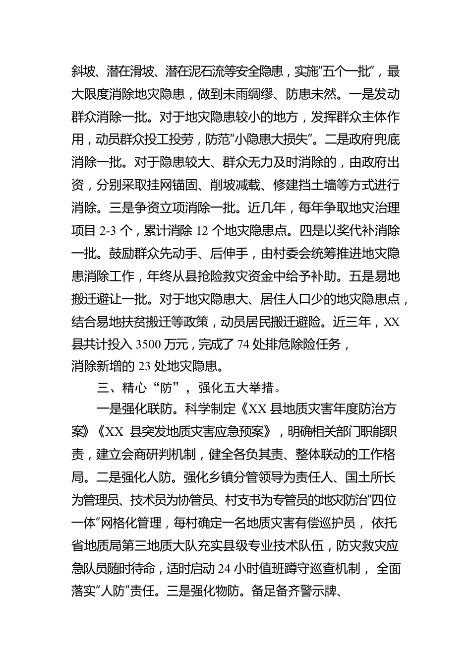 地灾防治工作汇报我县地质灾害易发多发,在册地质灾害隐患点202处,其中重点隐患点35处。近年来,我县探索采取查、除、防、避、治“五字工作法”,拧紧地质灾害安全风险“螺丝钉”,织密全县地灾防治“安全网”,较好保障了人民群众生命财产安全。一、全面“查”,建好五级台账。一是建好县级调度一本账。成立县地灾防治指挥部,建立到乡镇、到村、到组、到户、到人的地灾隐患台账,形成全县地灾隐患管理“一张图”。二是建好乡镇管控一本账。坚持“属地管理”原则,各乡镇对辖区内地质灾害隐患点方位、灾害类型、险情程度、治理进度等情况落实台账管理,做到心中有数。三是建好村级落实一本账。村“两委”干部履行地灾防治直接责任,对村内地灾隐患点、重点小组、重点农户等情况做到“一口清”。四是建好湾组包保一本账。村民小组长对地灾防治包保到户,承担隐患点巡查、受威胁转移避让等责任,履行“吹哨人”职责。五是建好农户避险一本账。对地灾隐患点群众实施分类管理、因户施策,发放地质灾害避险“明白卡”,告知预警信号、避灾转移线路、安置场所等信息,让群众一旦遇险能从容应对。二、主动“除”,实施五个一批。针对全县范围内因削坡建房、依山修路等导致的不稳定斜坡、潜在滑坡、潜在泥石流等安全隐患,实施“五个一批”,最大限度消除地灾隐患,做到未雨绸缪、防患未然。一是发动群众消除一批。对于地灾隐患较小的地方,发挥群众主体作用,动员群众投工投劳,防范“小隐患大损失”。二是政府兜底消除一批。对于隐患较大、群众无力及时消除的,由政府出资,分别采取挂网锚固、削坡减载、修建挡土墙等方式进行消除。三是争资立项消除一批。近几年,每年争取地灾治理项目2-3个,累计消除12个地灾隐患点。四是以奖代补消除一批。鼓励群众先动手、后伸手,由村委会统筹推进地灾隐患消除工作,年终从县抢险救灾资金中给予补助。五是易地搬迁避让一批。对于地灾隐患大、居住人口少的地灾隐患点,结合易地扶贫搬迁等政策,动员居民搬迁避险。近三年,XX县共计投入3500万元,完成了74处排危除险任务,消除新增的23处地灾隐患。三、精心“防”,强化五大举措。一是强化联防。科学制定《XX县地质灾害年度防治方案》《XX县突发地质灾害应急预案》,明确相关部门职能职责,建立会商研判机制,健全各负其责、整体联动的工作格局。二是强化人防。强化乡镇分管领导为责任人、国土所长为管理员、技术员为协管员、村支书为专管员的地灾防治“四位一体”网格化管理,每村确定一名地质灾害有偿巡护员,依托省地质局第三地质大队充实县级专业技术队伍,防灾救灾应急队员随时待命,适时启动24小时值班蹲守巡查机制,全面落实“人防”责任。三是强化物防。备足备齐警示牌、防水布、石料等防灾救灾物资,落实车辆、无人机、铲车等救援设备,全面夯实“物防”基础。四是强化技防。全县已有114处重要地质灾害隐患点安装自动化监测设备,实时监测灾害动态,同步预警预报,全面发挥“技防”优势。2020年6月,成功监测了温泉镇一天门村滑坡体险情。五是强化练防每年在学校、景区、乡村等人口密集区域开展综合演练,提升人民群众地质灾害防灾避险意识,增强防御救助能力,全面达到“练防”目的。四、科学“避”,规范五道流程。一是准确预警。接到重大险情或汛情预报后,及时通过微信群、广播、短信等方式,全地域、全行业、全覆盖发布预警信息。二是快速转移。一旦监测到险情或汛情报告,及时组织技术专家赶赴现场,启动应急机制,划定危险区域,有序组织群众转移。三是妥善安置。提前预备安置点,妥善安置受威胁群众,开展卫生防疫,进行心理疏导,确保群众有饭吃、有衣换、有干净水喝。四是强化核查。核人员,锁定受威胁群众,做到应转尽转、跟踪管理,防止随意回迁。核灾情,适时核查灾情变化,灾害险情未排除,转移人员不可回迁。核作风,加强汛期“巡查+督办+通报”的监督模式,确保险情期转移避险落到实处。五是及时报告。畅通转移群众安置、物资保障、心理疏导、卫生防疫等情况的上报机制,为指挥部科学决策提供一手资料。2021年6月27日,XX县遭遇近10个小时的强降雨,杨柳湾镇施家湖村柯家...