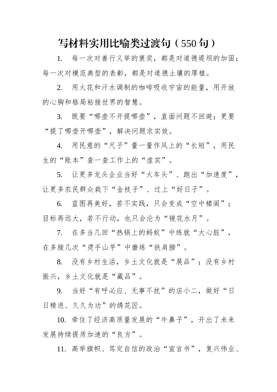 写材料实用比喻类过渡句(550句)1.每一次对善行义举的褒奖,都是对道德堤坝的加固;每一次对模范典型的表彰,都是对道德土壤的厚植。2.用火花和汗水调制的咖啡吸收宇宙的能量,用开放的心胸和格局粘接世界的智慧。3.既要“哪壶不开提哪壶”,直面问题不回避;更要“提了哪壶开哪壶”,解决问题求实效。4.用民意的“尺子”量一量作风上的“长短”,用民生的“账本”查一查工作上的“虚实”。5.让更多龙头企业当好“火车头”、跑出“加速度”,让更多农民群众栽下“金枝子”、过上“好日子”。6.蓝图再美好,若不实践,只会变成“空中楼阁”;目标再远大,若不行动,也只会沦为“镜花水月”。7.在多当几回“热锅上的蚂蚁”中练就“大心脏”,在多接几次“烫手山芋”中磨练“铁肩膀”。8.没有乡村生活,乡土文化就是“展品”;没有乡村振兴,乡土文化就是“藏品”。9.当好“有呼必应、无事不扰”的店小二,做好“日日精进、久久为功”的绣花匠。10.牵住了经济高质量发展的“牛鼻子”,开出了未来发展持续提质加速的“良方”。11.高举旗帜、笃定自信的政治“宣言书”,复兴伟业、强国蓝图的行动“教科书”。12.破解难题是锤炼过硬作风的大熔炉,破解难题是检验是否真抓实干的试金石。13.既精通专业知识、做好“经师”,又涵养德行、成为“人师”。14.“扩增量”,明责加压促项目,“优存量”,腾笼换鸟引项目。15.推出诚意满满的“政策包”,吃下安心安业的“定心丸”。16.检验领导班子政绩的“考场”,使用干部人才的“擂台”。17.深度解放思想的“大课堂”、练就过硬本领的“训练场”。18.用好“改革”这把金钥匙,擦亮“敢当”这块金招牌。19.打好转型升级“组合拳”,跑出经济发展“加速度”。20.“发展合伙人”的默契无间,“奋斗共同体”的团结。21.坚决守牢发展“生命线”,不断筑牢民生“幸福线”。22.打开了思想的“总开关”,迈出了发展的“快步伐”。23.拼搏项目建设“主战场”,决战项目施工“黄金期”。24.高举学习先进“指挥棒”,打开跨越发展“新思路”。25.大市“龙头”要舞起来,小市“摆尾”要快起来。26.多在“吃紧”处打冲锋,多在“要紧”时站前排。27.没有一座高山不可逾越,没有一片汪洋不可飞渡。28.发展“底板”牢不可破,安全“防线”坚不可摧。29.经济的“压舱石”作用,消费的“主拉动”作用。30.没有那么多“小九九”,没有那么多“弯弯绕”。31.上推下卸的“踢皮球”,只晒不改的“问题秀”。32.走好新时代“赶考路”,当好新时代“答卷人”。33.当之无愧的最强主力,当仁不让的最大功臣。34.在“热锅”上经风雨,在“磕碰”中长才干。35.系好廉洁从政的扣子,把紧拒腐防变的闸门。36.不为“成绩”遮望眼,盯住“痛点”下苦功。37.未雨绸缪下好先手棋,见微知著打好主动仗。38.留恋以前的“好时光”,走不出昨天的“舒适区”。39.校准价值观的“罗盘”,把稳政绩观的“船舵”。40.谋篇布局的“大写意”,抓好落实的“工笔画”。41.思想上的主动“破冰”,行动上的强势“突围”。42.避免“把鸡毛当令箭”,防止“把令箭当鸡毛”。43.争当落实的“行动派”,不当等待的“观望派”。44.沉甸甸的“民生大单”,暖人心的“民生大餐”。45.行动是最好的宣言书,创新是最好的试金石。46.在改革路上革故鼎新,在开放路上劈波斩浪。47.主动排雷打好主动仗,精准拆弹下好先手棋。48.用“放大镜”找漏洞,用“显微镜”查细节。49.既要打好应急攻坚战,更要打赢防控持久战。50.“翻篇归零”的姿态,“奋发奋进”的状态。51.“壮士断腕”压产能,“只争朝夕”促转型。52.用好政策“工具箱”,打好增长“组合拳”。53.攻城拔寨的战斗队,攻坚克难的行动队。54.纵使“逆风”劲吹,即使“逆流”涌动。55.过了一山再登一峰,跨过一沟再越一壑。56.干得好“有面子”,干不好“打板子”。57.实现“点上开花”,推动“面上成景”。58.笃定“信仰航向”,燃烧“初心之火”。59.要表态更要表率,要挂帅更要出征。60.少一些书卷气息,多一些泥土芳香。61.走过了风风雨雨,跨过了沟沟坎坎。62.跋涉的每一条河,翻越的每一座山。63.赢得了高光时刻,度过了精彩瞬间。64.胸中装着...