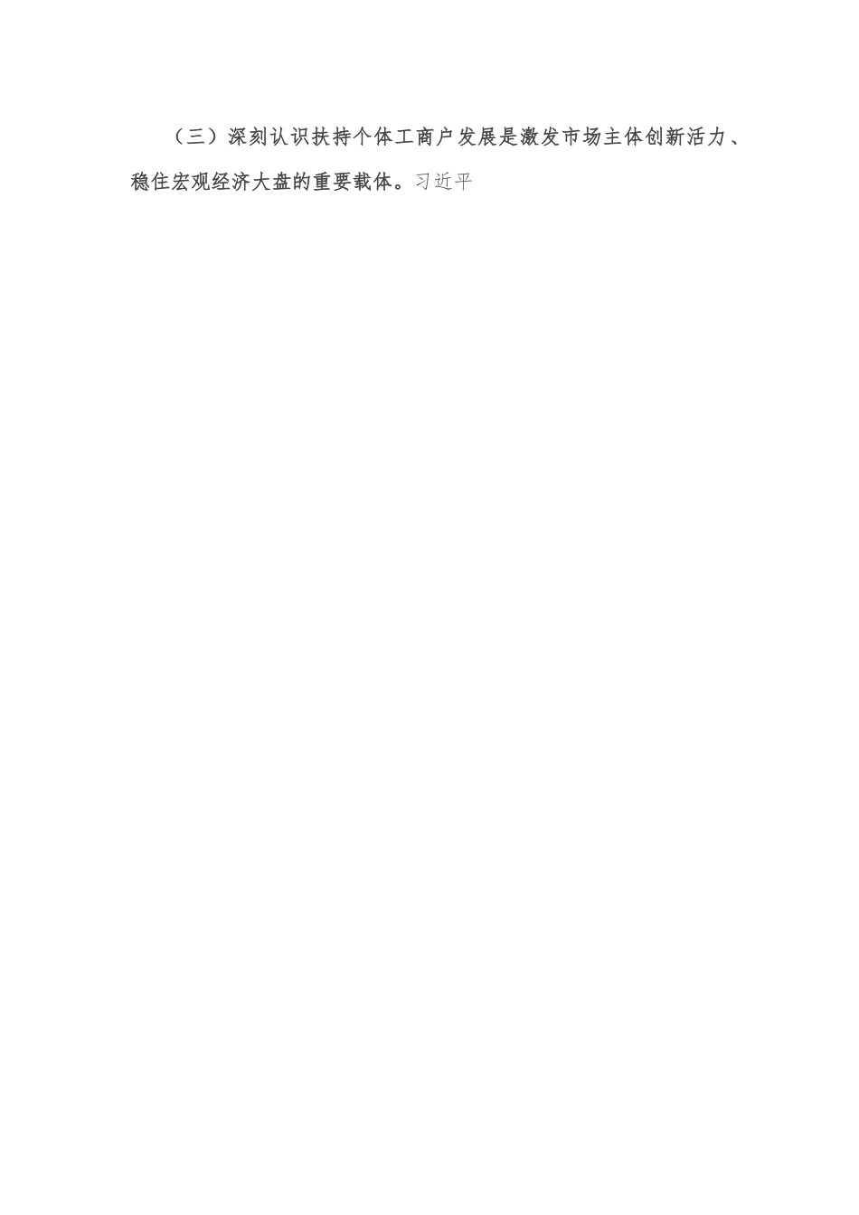 在首届全国个体工商户服务启动仪式上的讲话今天,我们*个部门以视频方式举办首届“全国个体工商户服务月”启动仪式,旨在学习贯彻习近平总书记关于促进个体工商户发展的重要指示精神,认真落实党中央、国务院决策部署,调动各方资源为个体工商户送服务、办实事、促发展,为稳住宏观经济大盘提供支撑,为迎接党的二十大胜利召开营造良好环境。刚才,*同志介绍了服务月活动总体安排,人力资源社会保障部副部长俞家栋、退役军人部副部长常正国作了讲话,请同志们抓好贯彻落实。下面,我讲几点意见:一、深入学习习近平总书记重要指示精神,深刻认识扶持个体工商户发展的重要意义党的十八大以来,以习近平同志为核心的党中央高度重视、十分关心个体工商户的健康发展,习近平总书记作出一系列重要论述,为我们做好工作指明了方向,提供了根本遵循.*年*月,国务院同意建立扶持个体工商户发展部际联席会议制度,为进一步加强组织领导和统筹协调,形成工作合力提供了制度保障。在各地区各部门的共同努力下,截至今年*月底,全国个体工商户达*亿户,在繁荣经济、稳定就业、促进创新、方便群众生活等方面发挥着重要作用,为经济社会健康发展作出了突出贡献。(一)深刻认识扶持个体工商户发展是坚持和完善社会主义基本经济制度、繁荣社会主义市场经济的重要举措。习近平总书记指出,民营经济是我国经济制度的内在要素,是社会主义市场经济发展的重要成果,是推动社会主义市场经济发展的重要力量;强调要毫不动摇巩固和发展公有制经济,毫不动摇鼓励、支持、引导非公有制经济发展,保证各种所有制经济依法平等使用生产要素、公平参与市场竞争'同等受到法律保护。我们要深刻认识到,“两个毫不动摇”是新时代坚持和发展中国特色社会主义的基本方略,个体经济作为民营经济的重要力量,在社会主义市场经济体系中的地位和作用越来越重要,从“必要的、有益的补充”上升到“重要组成部分”,彰显了中国特色社会主义基本经济制度的优势和活力。(二)深刻认识扶持个体工商户发展是维护社会穏定、促进共同富裕的重要保障。习近平总书记指出,适应我国社会主要矛盾的变化,更好满足人民日益增长的美好生活需要,必须把促进全体人民共同富裕作为为人民谋幸福的着力点,不断夯实党长期执政基础;强调要从构建新发展格局、推动高质量发展、促进共同富裕的战略高度出发,为各类市场主体特别是中小企业创造广阔的发展空冋。我们要深刻认识到,个体工商户是解决就业、创业致富的重要群体,发挥着就业蓄水池'社会稳定器、共同富裕生力军的重要作用。我国*亿多个体工商户,直接带动近*亿城乡居民就业,有力改善了民生,解决了近亿家庭尤其是许多弱势群体的生计问题.,这对于维护社会和谐稳定、促进共同富裕具有重大意义.(三)深刻认识扶持个体工商户发展是激发市场主体创新活力、稳住宏观经济大盘的重要载体。习近平总书记指出,市场主体是经济的力量载体,保市场主体就是保社会生产力,要千方百计把市场主体保护好,为经济发展积蓄基本力量;强调要持续激发市场主体活力,让市场主体特别是中小微企业和个体工商户增加活力。我们要深刻认识到,我国经济的长期稳健发展,很大程度源于各项政策措施持续激发各类市场主体的活力和创新力。在新发展格局下,要打通经济“大动脉”,必须畅通经济“微循环”。数量庞大的个体工商户,是推动大众创业、万众创新的重要力量,以微商电商、网络直播等为代表的“新个体经济”为我国经济转型升级注入了新的活力,也成为抵御经济下行风险、增强我国经济韧性和回旋余地的重要支撑。二、认真分析当前的新形势新挑战,高度重视个体工商户发展所面临的困难和问题从宏观经济看,当前我国经济延续恢复发展态势,个体工商户仍有充足发展空间。*月以来,我国经济运行呈现恢复发展态势,随着稳住经济一揽子政策和接续措施落地见效,经济运行有望持续改善,投资活力增强,消费持续恢复,进出口保持较快增长。总体来看,我国经济韧性强、潜力大、活力足,长期向好的基本面不会改变,为个体工商户带来充足的发展空间。同时也要看到,当前我国经济环境的复杂性、严峻性、不确定性仍在上升,需...