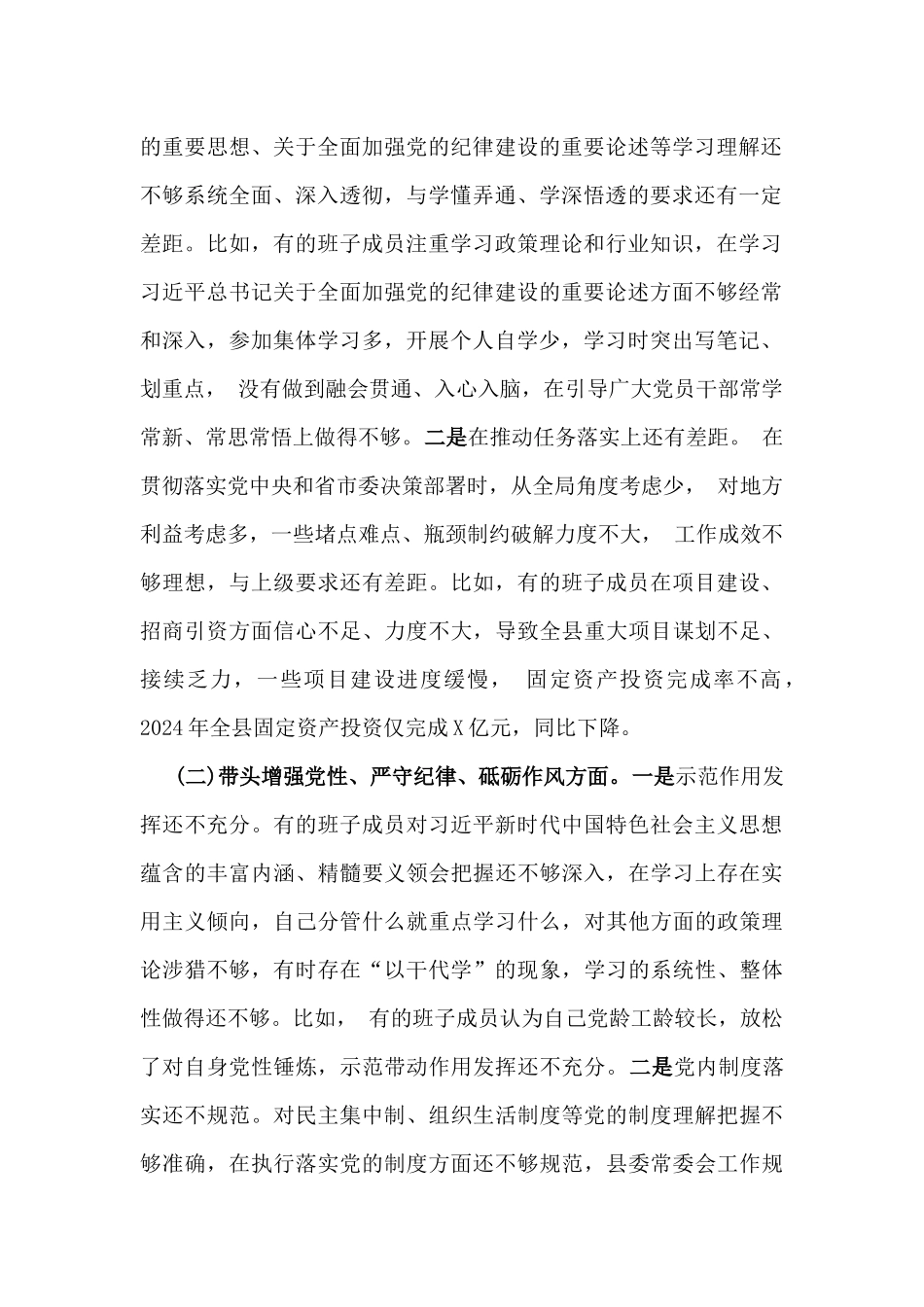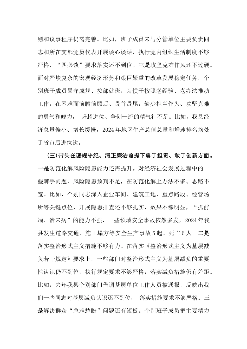 常委会班子、市统计局党组2025年生活会“四个带头”领导班子对照检视剖析材料【含典型案例剖析与反思】2篇文常委会班子2025年民主生活会“四个带头”对照检视剖析材料按照2024年度民主生活会部署要求,会前,县委常委会认真学习贯彻习近平新时代中国特色社会主义思想和党的二十届三中全会精神、习近平总书记关于党的建设的重要思想、关于党的自我革命的重要思想以及关于全面加强党的纪律建设的重要论述等内容。在此基础上,紧紧围绕本次专题民主生活会主题,深入谈心谈话,认真对照检查,深刻剖析原因,明确整改措施,形成了常委会班子对照检查材料。现对照检查如下:一、上年度民主生活会整改落实情况县委常委会坚持把问题整改作为推进全面从严治党的有力抓手和重要举措,对2023年度主题教育专题民主生活会查摆梳理的X个方面X条问题,逐项建立问题清单,制定整改措施,靠实整改责任,明确时限要求,全力整改落实。目前,所有问题已全部整改到位。二、存在的突出问题(一)带头严守政治纪律和政治规矩,维护党的团结统一方面。一是在深入学习领会上还有差距。对习近平总书记关于党的自我革命的重要思想、关于全面加强党的纪律建设的重要论述等学习理解还不够系统全面、深入透彻,与学懂弄通、学深悟透的要求还有一定差距。比如,有的班子成员注重学习政策理论和行业知识,在学习习近平总书记关于全面加强党的纪律建设的重要论述方面不够经常和深入,参加集体学习多,开展个人自学少,学习时突出写笔记、划重点,没有做到融会贯通、入心入脑,在引导广大党员干部常学常新、常思常悟上做得不够。二是在推动任务落实上还有差距。在贯彻落实党中央和省市委决策部署时,从全局角度考虑少,对地方利益考虑多,一些堵点难点、瓶颈制约破解力度不大,工作成效不够理想,与上级要求还有差距。比如,有的班子成员在项目建设、招商引资方面信心不足、力度不大,导致全县重大项目谋划不足、接续乏力,一些项目建设进度缓慢,固定资产投资完成率不高,2024年全县固定资产投资仅完成X亿元,同比下降。(二)带头增强党性、严守纪律、砥砺作风方面。一是示范作用发挥还不充分。有的班子成员对习近平新时代中国特色社会主义思想蕴含的丰富内涵、精髓要义领会把握还不够深入,在学习上存在实用主义倾向,自己分管什么就重点学习什么,对其他方面的政策理论涉猎不够,有时存在“以干代学”的现象,学习的系统性、整体性做得还不够。比如,有的班子成员认为自己党龄工龄较长,放松了对自身党性锤炼,示范带动作用发挥还不充分。二是党内制度落实还不规范。对民主集中制、组织生活制度等党的制度理解把握不够准确,在执行落实党的制度方面还不够规范,县委常委会工作规则和议事程序仍需完善。比如,班子成员未与分管单位主要负责同志和所在支部党员代表开展谈心谈话,执行党内组织生活制度不够严格,“四必谈”要求落实还不到位。三是攻坚克难作风还不过硬。面对严峻复杂的宏观经济形势和艰巨繁重的改革发展稳定任务,个别班子成员墨守成规、按部就班,习惯于按照老经验、老办法推动工作,在困难面前瞻前顾后、畏首畏尾,缺少担当作为、攻坚克难的勇气和魄力,赶超进位、争创一流的精气神不足。比如,我县经济总量偏小、增长缓慢,2024年地区生产总值总量和增速排名均处于省市后进位次。(三)带头在遵规守纪、清正廉洁前提下勇于担责、敢于创新方面。一是防范化解风险隐患能力还需提升。对经济社会发展过程中的一些棘手问题、风险隐患预判不足,在防范化解上办法不多、思路不宽。比如,个别同志深入企业车间、建筑工地、重点路段、经营场所等关键点位,开展隐患排查还不够扎实,效果不够明显,“抓前端、治未病”的能力不强,一些领域安全事故依然多发,2024年我县发生道路交通、施工塌方等安全生产事故5起、死亡6人。二是落实整治形式主义措施不够有力。在落实《整治形式主义为基层减负若干规定》要求上,一些部门对整治形式主义为基层减负的重要性认识仍不到位,执行规定要求不够严格,落实减负措施仍有差距。比如,去年我县个别部门借调基层单位工作人员被通报,反映出我们一些同志对基层减负认识还不到位...