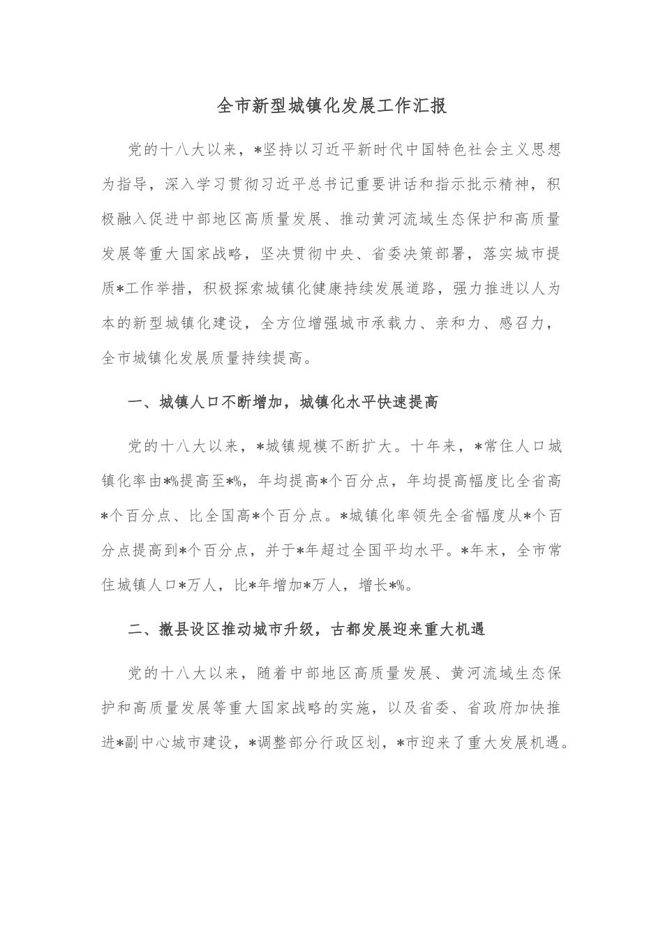 全市新型城镇化发展工作汇报党的十八大以来,*坚持以习近平新时代中国特色社会主义思想为指导,深入学习贯彻习近平总书记重要讲话和指示批示精神,积极融入促进中部地区高质量发展、推动黄河流域生态保护和高质量发展等重大国家战略,坚决贯彻中央、省委决策部署,落实城市提质*工作举措,积极探索城镇化健康持续发展道路,强力推进以人为本的新型城镇化建设,全方位增强城市承载力、亲和力、感召力,全市城镇化发展质量持续提高。一、城镇人口不断增加,城镇化水平快速提高党的十八大以来,*城镇规模不断扩大。十年来,*常住人口城镇化率由*%提高至*%,年均提高*个百分点,年均提高幅度比全省高*个百分点、比全国高*个百分点。*城镇化率领先全省幅度从*个百分点提高到*个百分点,并于*年超过全国平均水平。*年末,全市常住城镇人口*万人,比*年增加*万人,增长*%。二、撤县设区推动城市升级,古都发展迎来重大机遇党的十八大以来,随着中部地区高质量发展、黄河流域生态保护和高质量发展等重大国家战略的实施,以及省委、省政府加快推进*副中心城市建设,*调整部分行政区划,*市迎来了重大发展机遇。1.行政区划调整,主城区人口大幅增加。*年,国务院批复*撤销县级*市,设立*区;撤销*县、*区,设立*区,全市行政区划由原来的*市*县*区转变为*县*区,*市区面积达到*平方千米,城区常住人口*万人,比*年增加*万人。2.撤县设区推动落实黄河流域生态保护和高质量发展国家战略。调整后的*区、*区,助力*市区向东对接省会郑州发展,向北融入黄河流域生态保护和高质量发展战略。*因公元前*年周武王东征伐纣在此筑城“息偃戎师”而得名,拥有厚重的历史文化。*河、*河贯穿全境并在此交汇,境内陇海铁路、*高铁、连霍高速交汇贯通,道路交通网络四通八达。综合经济实力一度排在全省第*名,GDP更是一度排在全省第*名。*有九曲黄河第一古津之称,是八百诸侯会盟之地,文化底蕴深厚,交通便利,区位优势得天独厚,既可接受*辐射、参与*产业分工,又可依托自身优势、发展特色产业。*距*中心城区*公里,*年因建设*炼油厂而设立,*年正式建区,是全国重要的石油化工基地、中西部最大的石油化工基地,地处*、焦作、济源三座工业城市的交界之处,具备“四环高速、三线快速、两道铁路”的交通优势。*、*和*都处于黄河流域的重要区域,撤县设区有助于推动落实国家黄河流域生态保护和高质量发展战略。将*、*和*纳入*主城区后,黄河从*城区穿城而过,*城区也由两河(*河、*河)时代,进入黄河时代,这增强了*在整个黄河文明复兴中的轴心地位,便于围绕黄河两岸进行经济文化发展布局。三、实施“一中心六组团”战略,构建现代城镇体系党的十八大以来,*加快构建现代城镇体系,推进新型城镇化持续健康发展。以中心城区为引领、县级城市为带动、中心镇特色镇为支点、美丽乡村为依托,分类推进、整体联动。大力实施“一中心六组团”城市发展战略,优化*北城区、*南城区、*城区“三大板块”功能布局,适度疏解城市非核心功能,加强中心与组团、组团与组团的产业承接、交通连接、生态对接。强化南部四县的生态保育和经济联系,构建生态屏障,实现南部生态涵养区与北部城市发展区协调联动,促进生产空间、生活空间、生态空间相得益彰。以建设完善功能。统筹抓好旧城改造与新城建设、基础设施与公共服务、地下建设与地上建设,加大棚户区改造力度,推进城乡一体化示范区建设。加快推进县级城市扩容提质,谋划实施一批联通内外、辐射城乡的重大基础设施工程,统筹推进公共交通、给排水、供气、供热以及医院、学校、市场、游园等建设,规划建设一批工业强镇、商贸重镇、旅游名镇和特色小镇,不断增强县城和小城镇综合承载力。以管理提升品位。坚持为了群众、服务群众、依靠群众,加快从被动管理向主动服务转变、从人治思维向依法治理转变,不断提高城市管理服务精细化水平。四、城镇化发展质量提高,城市提质步伐加快*城镇化的快速发展不仅体现在发展速度上,发展质量也不断提升,城市提质步伐持续加快。1.交通基础设施建设全面提速。十年来,铁路枢纽总图规划获批,呼南高铁焦济*平段纳入国家规划,“十”字型高...