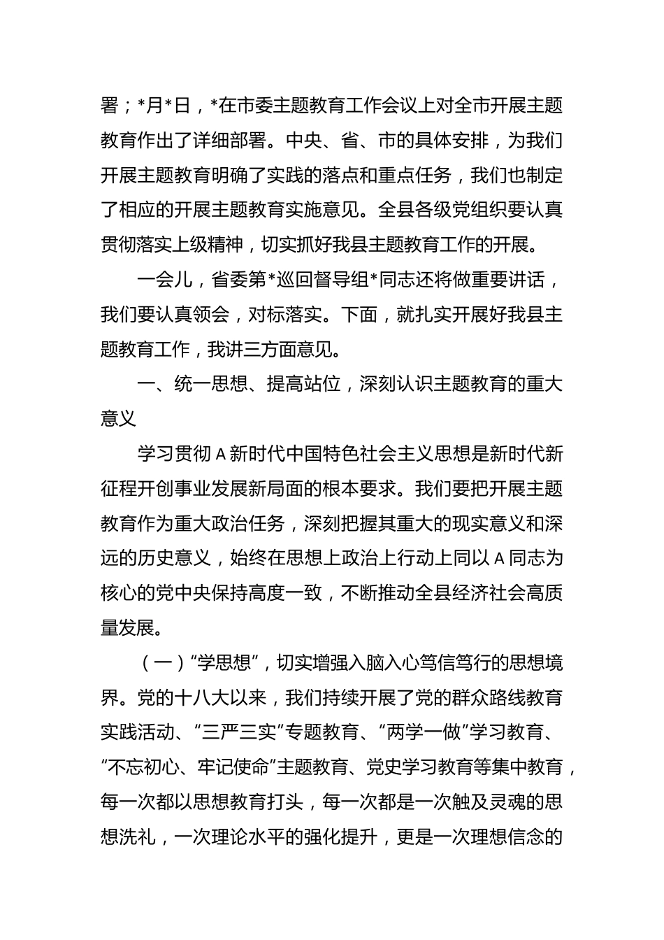 XXX县委书记在全县学习贯彻2023年主题教育工作会议上的讲话同志们:根据组织安排,经县委常委会研究,今天我们召开全县学习贯彻A新时代中国特色社会主义思想主题教育工作会议。主要任务是,深入学习贯彻A总书记关于主题教育重要讲话和重要指示批示,全面把握中央和省委主题教育第一批总结暨第二批部署会议精神,全面落实市委主题教育工作会议要求,安排部署我县主题教育工作,进一步统一思想、凝心聚力、奋进实干,为建设中国式现代化*实践提供坚强保证。在全党深入开展学习贯彻A新时代中国特色社会主义思想主题教育,是贯彻落实党的二十大精神的重大举措,对于统一全党思想、解决党内存在的突出问题、始终保持党同人民群众血肉联系、推动党和国家事业发展,具有重要意义。A总书记亲自部署,亲自审定工作方案,多次作出重要指示批示,围绕“以学铸魂、以学增智、以学正风、以学促干”提出明确要求,为我们开展主题教育提供了方向指引和根本遵循。9月5日,蔡奇同志在中央主题教育第一批总结暨第二批部署会议上,就抓好第二批主题教育,防止形式主义、官僚主义作了强调;*月*日,*在省委主题教育第一批总结暨第二批部署会议上,对开展第二批主题教育进行了系统部署;*月*日,*在市委主题教育工作会议上对全市开展主题教育作出了详细部署。中央、省、市的具体安排,为我们开展主题教育明确了实践的落点和重点任务,我们也制定了相应的开展主题教育实施意见。全县各级党组织要认真贯彻落实上级精神,切实抓好我县主题教育工作的开展。一会儿,省委第*巡回督导组*同志还将做重要讲话,我们要认真领会,对标落实。下面,就扎实开展好我县主题教育工作,我讲三方面意见。一、统一思想、提高站位,深刻认识主题教育的重大意义学习贯彻A新时代中国特色社会主义思想是新时代新征程开创事业发展新局面的根本要求。我们要把开展主题教育作为重大政治任务,深刻把握其重大的现实意义和深远的历史意义,始终在思想上政治上行动上同以A同志为核心的党中央保持高度一致,不断推动全县经济社会高质量发展。(一)“学思想”,切实增强入脑入心笃信笃行的思想境界。党的十八大以来,我们持续开展了党的群众路线教育实践活动、“三严三实”专题教育、“两学一做”学习教育、“不忘初心、牢记使命”主题教育、党史学习教育等集中教育,每一次都以思想教育打头,每一次都是一次触及灵魂的思想洗礼,一次理论水平的强化提升,更是一次理想信念的深化升华。这次学习贯彻A新时代中国特色社会主义思想主题教育更是如此,我们要通过这次主题教育,在推动学习贯彻A新时代中国特色社会主义思想走深走实上下功夫,真正来一次理论大学习、思想大武装,用新时代中国特色社会主义思想武装头脑、指导实践、推动工作。(二)“强党性”,切实增强对党忠诚干净担当的政治品格。A新时代中国特色社会主义思想是推动新时代党和国家事业不断向前发展的科学指南,也是广大党员干部群众担当作为、争先出彩的思想武器。新时代十年取得的伟大变革,最根本就在于有A总书记掌舵领航,有A新时代中国特色社会主义思想科学指引。我们要把开展主题教育作为思想建党、理论强党的领航工程来认识,把学习贯彻A新时代中国特色社会主义思想作为根本任务,坚持学思用贯通知信行统一,进一步树牢“四个意识”、坚定“四个自信”、做到“两个维护”,筑牢信仰之基、补足精神之钙、把稳思想之舵。(三)“重实践”,切实增强深入群众服务群众的行动自觉。为民造福是立党为公、执政为民的本质要求。这次主题教育以深化调查研究推动解决发展难题,主要就是教育引导广大党员、干部践行宗旨为民造福,着力解决群众急难愁盼问题,增强人民群众获得感、幸福感、安全感。我们要走好新时代党的群众路线,深入调查研究,着力解决群众的操心事、烦心事和揪心事,以扎实的成效,更好引领群众感恩党、听党话、跟党走。(四)“建新功”,切实增强担当实干促进发展的硬核能力。A新时代中国特色社会主义思想展真理之旗、掌时代之舵、扬复兴之帆,在实践中深刻改变了中国,深刻影响着世界。县委紧紧围绕A总书记调研*时重要批示指示精神,锚定省委*部署,聚焦市...