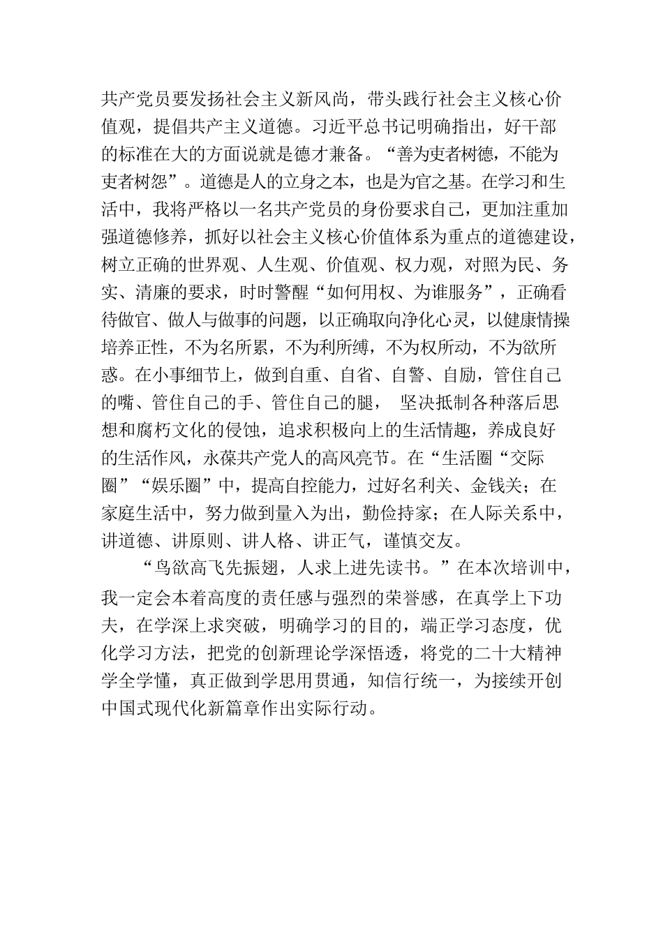为顺利地完成本次培训的学习任务,在学习中拓宽视野、提高理论水平、增强解决实际问题的潜力,让我的党性在学习中得到锻炼提升,我从以下几个方面来做自己的党性锻炼计划。一、紧盯理论武装不松懈,坚定理想信念理想信念是共产党人精神上的“钙”,理想信念坚定是对党员干部的基本要求,通过我们党100多年来的实践证明,政治上的坚定、党性上的坚定,都离不开理论上的修养和强化。针对自己在理论学习上还有差距,在此次培训中,我将认真学习马列主义,毛泽东思想,邓小平理论,“三个代表”重要思想,科学发展观,习近平新时代中国特色社会主义思想以及党的二十大精神,严格按照教学计划做好相关课前准备和课后融会贯通,在基本理论的掌握、理解和运用上,做到深入而不肤浅、系统而不零碎、联系实际而不空谈表面。在培训期间,首要的政治学习任务就是学习领悟政治理论知识,带着思考学、带着问题学,深刻领会习近平新时代中国特色社会主义思想的世界观和方法论,更好用党的创新理论武装头脑、指导实践,准确把握中国式现代化的科学内涵、本质要求、战略安排、基本原则和重大举措,使学习领会过程成为统一思想、凝聚共识的过程,努力做到学深悟透、学懂弄通、真学真用。在常学常新中加强理论修养,在真学真信中坚定理想信念,在学思践悟中牢记初心使命,在细照笃行中锻炼提升党性。牢固树立马克思主义的世界观、人生观和价值观,坚定共产主义的梦想信念,坚持正确的政治立场和方向,坚决与党组织保持高度一致。二、紧跟政治修养不懈怠,强化党性修养政治修养,是政治素质、政治立场、政治态度的集中体现,是衡量一个领导干部政治上是否成熟的重要标志,加强新时代政治素养,最核心的就是做到“两个维护”。在此次培训中,我将积极参加每一次教学活动和组织生活,紧密联系自己乡镇工作的实际,带着问题参与,带着任务参与,带着目的参与,有针对性地进行思想改造,切实加强自身修养、锤炼过硬的本领,始终做到立党为公、执政为民。经过学习,进一步坚定对党的梦想信念的信心和决心,进一步提高自我发现问题、分析问题、解决问题的本事,进一步增强政治鉴别力。始终站稳政治立场、保持政治定力,在大是大非面前做到旗帜鲜明,任何时候都做政治上的明白人。严守党的政治纪律和政治规矩,做到党中央提倡的坚决响应、党中央决定的坚决照办、党中央禁止的坚决杜绝,真正在思想上政治上行动上同以习近平同志为核心的党中央保持高度一致,注重把树立求真务实作风与干好本职工作结合起来,把廉洁奉公和勤政为民结合起来,树立正确的世界观、人生观、价值观和正确的政绩观、权力观、地位观。三、紧扣道德修养不动摇,做到品德合格“为政以德,居其所而众星拱之”。《党章》明确规定,共产党员要发扬社会主义新风尚,带头践行社会主义核心价值观,提倡共产主义道德。习近平总书记明确指出,好干部的标准在大的方面说就是德才兼备。“善为吏者树德,不能为吏者树怨”。道德是人的立身之本,也是为官之基。在学习和生活中,我将严格以一名共产党员的身份要求自己,更加注重加强道德修养,抓好以社会主义核心价值体系为重点的道德建设,树立正确的世界观、人生观、价值观、权力观,对照为民、务实、清廉的要求,时时警醒“如何用权、为谁服务”,正确看待做官、做人与做事的问题,以正确取向净化心灵,以健康情操培养正性,不为名所累,不为利所缚,不为权所动,不为欲所惑。在小事细节上,做到自重、自省、自警、自励,管住自己的嘴、管住自己的手、管住自己的腿,坚决抵制各种落后思想和腐朽文化的侵蚀,追求积极向上的生活情趣,养成良好的生活作风,永葆共产党人的高风亮节。在“生活圈“交际圈”“娱乐圈”中,提高自控能力,过好名利关、金钱关;在家庭生活中,努力做到量入为出,勤俭持家;在人际关系中,讲道德、讲原则、讲人格、讲正气,谨慎交友。“鸟欲高飞先振翅,人求上进先读书。”在本次培训中,我一定会本着高度的责任感与强烈的荣誉感,在真学上下功夫,在学深上求突破,明确学习的目的,端正学习态度,优化学习方法,把党的创新理论学深悟透,将党的二十大精神学全学懂,真正做...
