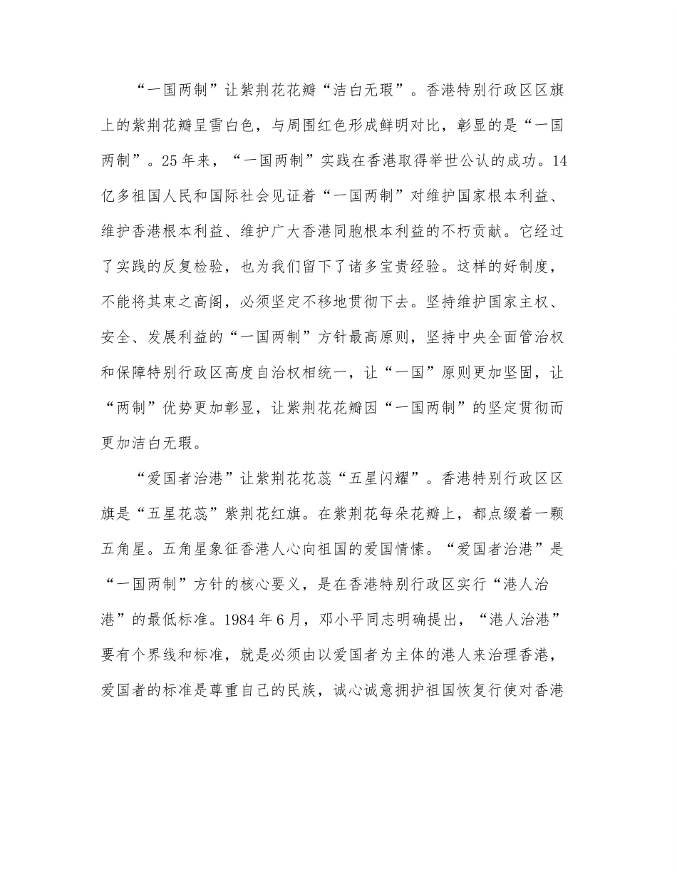 香港回归祖国25周年讲话学习心得汇编(5篇)目录1.25载铭刻光阴的故事:紫荆花开别样美22.香港回归祖国:“一国两制”的成功实践53.奋楫逐浪共远航94.难忘“七一”香江之行的那抹深情125.紫荆“花开”映香江1525载铭刻光阴的故事:紫荆花开别样美庆祝香港回归祖国25周年大会暨香港特别行政区第六届政府就职典礼1日上午在香港会展中心隆重举行。中共中央总书记、国家主席、中央军委主席习近平出席并发表重要讲话。他强调,“一国两制”是经过实践反复检验了的,符合国家、民族根本利益,符合香港、澳门根本利益,得到14亿多祖国人民鼎力支持,得到香港、澳门居民一致拥护,也得到国际社会普遍赞同。这样的好制度,没有任何理由改变,必须长期坚持。紫荆花是香港市花,代表香港。25载,铭刻光阴的故事,一朵花儿在祖国的阳光雨露中,盛开得愈发美丽。“一国两制”让紫荆花花瓣“洁白无瑕”。香港特别行政区区旗上的紫荆花瓣呈雪白色,与周围红色形成鲜明对比,彰显的是“一国两制”。25年来,“一国两制”实践在香港取得举世公认的成功。14亿多祖国人民和国际社会见证着“一国两制”对维护国家根本利益、维护香港根本利益、维护广大香港同胞根本利益的不朽贡献。它经过了实践的反复检验,也为我们留下了诸多宝贵经验。这样的好制度,不能将其束之高阁,必须坚定不移地贯彻下去。坚持维护国家主权、安全、发展利益的“一国两制”方针最高原则,坚持中央全面管治权和保障特别行政区高度自治权相统一,让“一国”原则更加坚固,让“两制”优势更加彰显,让紫荆花花瓣因“一国两制”的坚定贯彻而更加洁白无瑕。“爱国者治港”让紫荆花花蕊“五星闪耀”。香港特别行政区区旗是“五星花蕊”紫荆花红旗。在紫荆花每朵花瓣上,都点缀着一颗五角星。五角星象征香港人心向祖国的爱国情愫。“爱国者治港”是“一国两制”方针的核心要义,是在香港特别行政区实行“港人治港”的最低标准。1984年6月,邓小平同志明确提出,“港人治港”要有个界线和标准,就是必须由以爱国者为主体的港人来治理香港,爱国者的标准是尊重自己的民族,诚心诚意拥护祖国恢复行使对香港的主权,不损害香港的繁荣和稳定。无论何时,政权必须掌握在爱国者手中,这是世界通行的政治法则,是守护香港繁荣稳定、守护香港居民切身利益的底线法则。爱国是最美情怀,“爱国者治港”让紫荆花花蕊“五星闪耀”。“得天独厚”让紫荆花气质“别具一格”。香港特别行政区区旗上的紫荆花格外醒目,图案美观大方,气质别具一格。这代表着香港“背靠祖国、联通世界”的得天独厚显著优势。在新时代国家改革开放进程中,特殊地位和独特优势让香港发挥着不可替代的作用。香港虽体量小,但具有特殊优越条件,国际参与度高,国际金融、航运、贸易中心地位突显。香港社会也因得天独厚而蕴藏着巨大创造力和发展活力,亟待人们将其充分释放。它虽保持着原有资本主义制度长期不变,享有着高度自治权,但更需要积极主动融入国家发展大局、参与国家治理实践、助力祖国全面开放、促进国际人文交流。紫荆花呈现出一种特别气质,这种气质不止于外在美和内在美,更凸显出气韵非凡的综合美。香港回归祖国:“一国两制”的成功实践庆祝香港回归祖国25周年大会暨香港特别行政区第六届政府就职典礼7月1日上午在香港会展中心隆重举行。中共中央总书记、国家主席、中央军委主席习近平出席。党的十八大以来,以习近平同志为核心的党中央从实现中华民族伟大复兴的全局高度,为香港长期繁荣稳定发展和香港同胞福祉,作出一系列战略决策和重大部署,不断推进“一国两制”在香港成功实践,引领香港书写宏阔篇章。温暖人心亲切关怀,一枝一叶饱蕴深情。以习近平同志为核心的党中央一直关注着香港,挂念着香港,习近平同志的心和中央政府的心始终同香港同胞在一起,时时关心700多万香港同胞的民生福祉,支持香港发展经济、改善民生,一项项针对性强、含金量高的措施,为香港同胞带来实实在在的实惠。在社会安全、经济发展、疫情防控、民生福祉等各方面来自祖国的支持坚定有力。“对香港、澳门来说,‘一国两制’是最大的优势,国家改革开放是最大的舞台,共建‘一带...