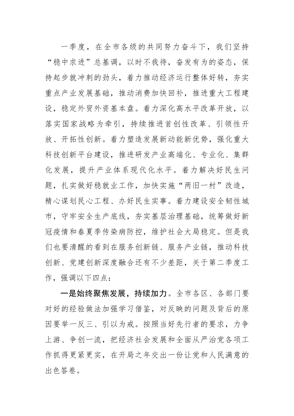 在市委一季度工作会议上的讲话同志们:今天我们组织召开市委季度工作会议。这次会议首次增加了点评环节,主要目的是帮助各单位更加全面客观审视自身工作,总结经验、改进不足,在全市营造见贤思齐、比学赶超的浓厚氛围。这次会议的主要任务是:深入学习贯彻党的二十大和习近平总书记重要讲话精神,紧密结合学习贯彻习近平新时代中国特色社会主义思想主题教育,胸怀“国之大者”、坚持“四个放在”,进一步提高思想站位、改进工作方法、注重统筹协调,保持奋发有为的精神状态,创造性地推进各项工作,确保时间过半、完成任务过半,奋力谱写中国式现代化建设XX新篇章。一季度,在全市各级的共同努力奋斗下,我们坚持“稳中求进”总基调,以时不我待,奋发有为的姿态,保持起步就冲刺的劲头,着力推动经济运行整体好转,夯实重点产业发展基础,推动消费加快回补,推进重大工程建设,稳定外贸外资基本盘。着力深化高水平改革开放,以落实国家战略为牵引,持续推进首创性改革、引领性开放、开拓性创新。着力塑造发展新动能新优势,强化重大科技创新平台建设,推进研发产业高端化、专业化、集群化发展,提升产业体系现代化水平。着力解决好民生问题,扎实做好稳就业工作,加快实施“两旧一村”改造,精心谋划民心工程、办好民生实事。着力建设安全韧性城市,守牢安全生产底线,夯实基层治理基础,统筹做好新冠疫情和春夏季传染病防控,维护社会大局稳定。但是我们也要清醒的看到在服务创新链、服务产业链,推动科技创新、党建创新深度融合还有不少差距,关于第二季度工作,强调以下四点:一是始终聚焦发展,持续加力。全市各区、各部门要对好的经验做法加强学习借鉴,对反映的问题及背后的原因要举一反三、引以为戒。按照当好先行者的要求,力争上游、争创一流,把经济社会发展和全面从严治党各项工作抓得更紧更实,在开局之年交出一份让党和人民满意的出色答卷。二是准确把握形势,持续创新。要清醒认识外部环境正在发生新的变化,新一轮科技革命和产业变革加速演进,带来科学范式变革和创新模式再调整,将深刻改变未来创新版图和产业格局。必须以更强的紧迫感、责任感,准确识变、科学应变、主动求变,做新时代改革的闯将、创新的先锋、为民的公仆。始终把“四个放在”作为思考和谋划一切工作的出发点和落脚点,从更好服务国家战略的高度,发挥龙头带动、改革开放、科技和人才、治理现代化优势,积极主动做好对接、做好服务,聚焦核心功能打造和核心竞争力提升,推进实施更有战略性、创造性、引领性的改革开放重大举措,加快推进现代化建设。三是聚焦重点任务,持续攻坚。各项事业要创一流、争上游,必须具备更加宽广开阔的视野。对标最高标准、最好水平,对竞争的态势、规则的演变、市场的变化,保持高度敏锐、强化学习思考、及时研究谋划,进一步找准城市发展定位,更好与兄弟省市优势互补、协同发展,更好参与合作与竞争。工作中要突出重点、聚焦重点,把上级赋予重大战略、重大任务、重大政策作为重中之重,集中力量抓好落地落实,不断开动脑筋出实招、出硬招、出新招。区里要抓好重大项目的招引、落地、推进,市级部门要抓好关键项目、重大举措的谋划、布局、统筹。要处理好当前和长远的关系,确保作出的决策、出台的政策、采取的措施既利当前、又利长远。工业发展要抓住产业高端化、智能化、绿色化机遇,把大项目、好项目、新项目抓上去,把新能源汽车、集成电路、生物医药等产业培育壮大起来,加快新旧动能转换,形成经济增长的接续动力。航运和外贸要加快转型升级,把高端航运服务业发展起来,把功能做强,采取有力措施稳住外贸基本盘,在调结构中培育外贸新的增长点,巩固和放大开放型经济优势。四是关注改善民生,持续提升。要按照“三个更好统筹”的要求,以时时放心不下的责任感做好经济发展、民生改善、社会稳定等工作。加强重点工作、重大项目统筹。各类政策出台后,要抓好政策落地的跟踪问效。各区要聚焦主业,锚定发展定位,发挥比较优势。把惠民生做得更加精准,新一轮民心工程要聚焦急难愁盼问题,更加注重品质提升,更好温暖民心、凝聚民心。毫不松懈抓好疫情监测预...