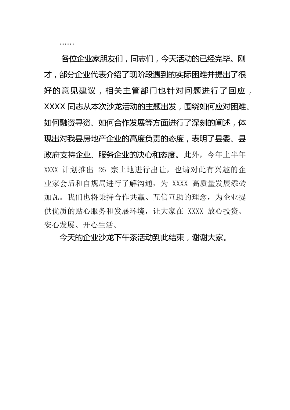 企业家沙龙下午茶(房产企业专场)主持词尊敬的企业界朋友们,同志们:在前几期对接活动成功经验的基础上,在县委、县政府的大力支持下,今天我们在这里举行XXXX第五期企业家沙龙下午茶(房产企业专场)。首先,向各位嘉宾的到来表示热烈的欢迎!向各位企业家朋友们长期以来对XXXX发展的关心和支持表示忠心的感谢!我们举办这样的活动,是为了搭建平台、沟通联系,增进友谊、合作共赢。县委、县政府在历届历次会议中也都明确提出,要打造亲商、安商、尊商的良好环境、浓厚氛围。从现在开始,从在座的每位同志做起,我们就像走亲戚一样加强联系,像处朋友一样增进感情,共同携手繁荣XXXX经济,为造福全县人民尽我们每个人的一份力量。今天座谈会的主题是“你投我帮”,主旨是了解房地产企业遇到的困难并切实帮助企业解决一批困难。今天出席会议的有:XXXX同志,县政府办主要负责人,县自然资源和规划局主要负责人、分管负责人,县住房和城乡建设局,县建投集团、宿州市住房公积金管理中心XXXX管理部、国家税务局XXXX分局、国家电网XXXX分公司、县教育体育局、县城市管理局、XXXX重点工程建设管理中心、圣泉镇人民政府、人民银行XXXX分行、县营商办、县房管中心主要负责同志以及XXXX各在建房地产开发公司负责人。今天的活动主要分为两个部分:一是部分房地产企业代表与县各主管单位进行困难问题交流及现场解答;二是XXXX同志作总结讲话。下面进行第一部分内容:由房地产企业代表发言及主管单位解答。首先请XXXX有限公司发言..............................;请相关部门解答.................请XXXX有限公司发言..................................;请相关部门解答........................请XXXX有限公司发言..........................;请相关部门解答.............................请XXXX有限公司发言..............................;请相关部门解答........................请XXXX有限公司发言.................;请相关部门解答........................请XXXX有限公司发言.................;请相关部门解答........................刚才部分企业代表也提出了不少遇到的实际困难,各主管单位也拿出了解决问题的方法和建议。下面进行第二部分,请XXXX同志作总结讲话,大家欢迎;......各位企业家朋友们,同志们,今天活动的已经完毕。刚才,部分企业代表介绍了现阶段遇到的实际困难并提出了很好的意见建议,相关主管部门也针对问题进行了回应,XXXX同志从本次沙龙活动的主题出发,围绕如何应对困难、如何融资寻资、如何合作发展等方面进行了深刻的阐述,体现出对我县房地产企业的高度负责的态度,表明了县委、县政府支持企业、服务企业的决心和态度。此外,今年上半年XXXX计划推出26宗土地进行出让,也请对此有兴趣的企业家会后和自规局进行了解沟通,为XXXX高质量发展添砖加瓦。我们也将秉持合作共赢、互信互助的理念,为企业提供优质的贴心服务和发展环境,让大家在XXXX放心投资、安心发展、开心生活。今天的企业沙龙下午茶活动到此结束,谢谢大家。